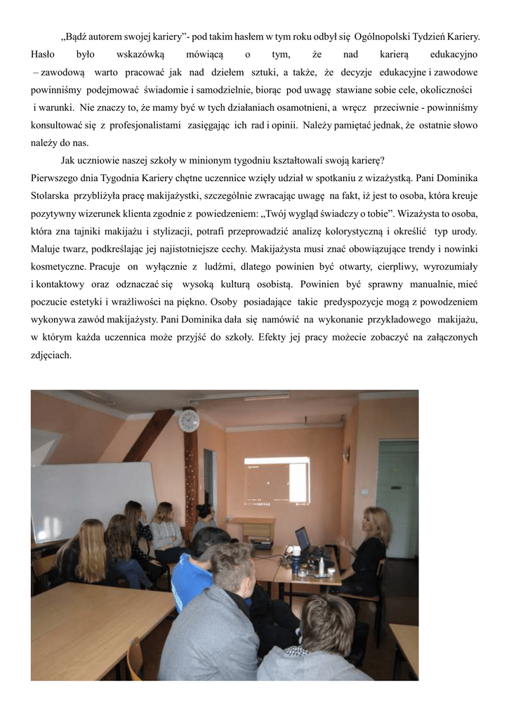 „Bądź autorem swojej kariery”- pod takim hasłem w tym roku odbył się Ogólnopolski Tydzień Kariery. Hasło było wskazówką mówiącą o tym, że nad karierą edukacyjno – zawodową warto pracować jak nad dziełem sztuki, a także, że decyzje edukacyjne i zawodowe powinniśmy podejmować świadomie i samodzielnie, biorąc pod uwagę stawiane sobie cele, okoliczności i warunki. Nie znaczy to, że mamy być w tych działaniach osamotnieni, a wręcz przeciwnie - powinniśmy konsultować się z profesjonalistami zasięgając ich rad i opinii. Należy pamiętać jednak, że ostatnie słowo należy do nas. Jak uczniowie naszej szkoły w minionym tygodniu kształtowali swoją karierę? Pierwszego dnia Tygodnia Kariery chętne uczennice wzięły udział w spotkaniu z wizażystką. Pani Dominika Stolarska przybliżyła pracę makijażystki, szczególnie zwracając uwagę na fakt, iż jest to osoba, która kreuje pozytywny wizerunek klienta zgodnie z powiedzeniem: „Twój wygląd świadczy o tobie”. Wizażysta to osoba, która zna tajniki makijażu i stylizacji, potrafi przeprowadzić analizę kolorystyczną i określić typ urody. Maluje twarz, podkreślając jej najistotniejsze cechy. Makijażysta musi znać obowiązujące trendy i nowinki kosmetyczne. Pracuje on wyłącznie z ludźmi, dlatego powinien być otwarty, cierpliwy, wyrozumiały i kontaktowy oraz odznaczać się wysoką kulturą osobistą. Powinien być sprawny manualnie, mieć poczucie estetyki i wrażliwości na piękno. Osoby posiadające takie predyspozycje mogą z powodzeniem wykonywa zawód makijażysty. Pani Dominika dała się namówić na wykonanie przykładowego makijażu, w którym każda uczennica może przyjść do szkoły. Efekty jej pracy możecie zobaczyć na załączonych zdjęciach. Tego samego dnia w szkolnej bibliotece odbyło się spotkanie konsultantek reprezentujących firmę Avon. W oparach perfum uczennice wraz z zaproszonymi gośćmi rozmawiały na tematy związane z działalnością gospodarczą. Dowiedziały się w jaki sposób, będąc uczennicą szkoły ponadgimnazjalnej, można zarobić pierwsze pieniądze. Zaproszone panie przedstawiły swoje ścieżki zawodowe. Opowiedziały, jak ich małe biznesy stały się dużymi firmami. Każda z uczestniczek spotkania otrzymała potężny zastrzyk wiedzy i próbki najnowszych kosmetyków firmy Avon. Tego dnia pani Agnieszka Piórkowska z grupą wybranych uczennic postanowiła wziąć udział w konkursie organizowanym przez Izbę Przemysłowo – Handlową w Toruniu pod hasłem „Kreatywny biznes – młodzi w akcji”. Celem konkursu było kreowanie postaw przedsiębiorczych wśród uczniów. Polegał on na przygotowaniu i zaprezentowaniu pomysłu na własny interes. Naszą szkołę reprezentowały uczennice klasy II b Liceum Ogólnokształcącego: Julia Kuźnicka, Justyna Skowron, Alicja Witkowska i Natalia Zając. Dziewczęta przygotowały biznesplan firmy „Weselne klimaty”, zajmującej się organizacją przyjęć ślubnych. Uczennice nie stanęły na podium, ale doświadczenie, które zdobyły jest bezcenne. Umiejętność radzenia sobie ze stresem, pracy w grupie, prezentacji swojej pracy i uczciwej rywalizacji to zdolności, które najlepiej jest kształtować właśnie podczas takich konkursów. A oto kilka zdjęć z tego konkursu. Wtorek był kolejnym dniem, w którym budowaliśmy swoją przyszłość zawodową. Tym razem poza granicami naszego kraju. Uczniowie drugich i trzecich klas liceum spotkali się z panem Januszem Dargiewiczem. W jakim celu? W celu uzyskania informacji, czy studia w Anglii to cel dla nich osiągalny. Prowadzący zapoznał uczniów z procesem rekrutacyjnym angielskich uczelni, dokumentacją i finansami. Okazało się, że jest tam aż 50 tys. ciekawych kierunków studiów, często niedostępnych w Polsce. Można pracować i studiować, a jednocześnie doskonalić swój język. Nauka kończy się uzyskaniem brytyjskiego dyplomu, który jest ceniony na całym świecie. Myślę, że to ciekawa alternatywa dla tych, którzy kochają podróże, wyzwania i angielską pogodę. Środa w naszej szkole została poświęcona wszystkim tym, którzy w testach badających predyspozycje i preferencje zawodowe zostali określeni jako „typy społeczne”. Nikt tak doskonale nie reprezentuje tego typu jak pracownicy Gminnego Ośrodku Pomocy Społecznej w Chełmży. Zaproszone panie, absolwentki naszej szkoły, mówiły o tym, jakie predyspozycje powinien mieć pracownik socjalny oraz jakim zadaniom i obowiązkom musi sprostać w swojej codziennej pracy. Panie podkreślały, że jest to zawód, w którego zakresie leży działalność w środowiskach społecznych, w których znajdują się jednostki wymagające pomocy w usamodzielnieniu się, odzyskaniu lub umocnieniu zdolności do funkcjonowania w społeczeństwie. Pani Anna Bykowska nadmieniła, że osoba pracująca na tym stanowisku musi posiadać wszechstronna wiedzę z socjologii, ekonomii, animacji lokalnej, prawa czy psychologii. Zaznaczyła, że jest to zajęcie bardzo często wykraczające poza urzędowe godziny pracy. Ostatniego dnia Tygodnia Kariery trzecia klasa Zasadniczej Szkoły Zawodowej uczestniczyła w spotkaniu, które prowadził pan Piotr Wełnicki - pracownik Centrum Informacji i Planowania Kariery Zawodowej Wojewódzkiego Urzędu Pracy w Toruniu. Zajęcia poświęcone były tematyce zmieniającego się rynku pracy i efektywnych sposobów poszukiwania zatrudnienia ze szczególnym uwzględnieniem oczekiwań pracodawców. Po zakończonych zajęciach uczniowie jednomyślnie stwierdzili, że było to spotkanie, które zaowocowało zdobyciem praktycznych umiejętności dotyczących efektywnego poszukiwania zatrudnienia. A oto kilka zdjęć. Tego samego dnia uczniowie drugiej klasy wraz z opiekunami wybrali się na spotkanie do Wojewódzkiego Urzędu Pracy w Toruniu oraz odwiedzili zakład Poland Tokai Okaya Manufacturing w Ostaszewie. Firma działa w branży e