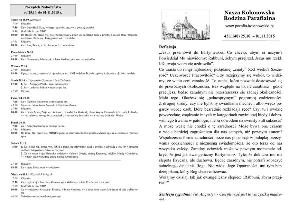 Porządek Nabożeństw od 25.10. do 01.11.2015 r. Niedziela 25.10. Kiermasz 7:00 Różaniec 7:30 Za + Ludwika Miksa, ++ jego rodziców oraz ++ z pokr. (j. polski) 9:30 Godzinki ku czci NMP 10:00 Do Bożej Op. przez wst. MB Różańcowej z podz. za odebrane łaski z prośbą o dalsze Boże błogosławieństwo dla Anny i Grzegorza z ok. 10 r. ślubu 17:15 Różaniec 18:00 Za + żonę Teresę w 3 r. śm. oraz ++ z obu stron Poniedziałek 26.10. 17:30 Różaniec 18:00 Za + Florentynę Adamczyk, + Jana Wodarczyk - zam. od sąsiadów Wtorek 27.10. 17:30 Różaniec 18:00 Z podz. za otrzymane łaski z prosba za wst. NMP o dalsze Boże bł. opiekę i zdrowie z ok. 60 r. urodzin Środa 28.10. śś. Apostołów Szymona i Judy Tadeusza 17:00 1. Za + Andrzeja Ploch - zam. od sąsiadów 2. Za + Ludwika Miksa w miesiąc po śm. 17:30 Różaniec Czwartek 29.10. 7:00 Za + Elżbietę Wacławek w miesiąc po śm. 13:00 Msza św. i ślub Beata Biesiada i Wojciech Musiał 17:30 Różaniec 18:00 Za + ciocię Marię Ziaja w r. śmierci., ++ rodziców Gertrudę i Jana Wojsa, Emanuela i Gertrudę Lebioda, ++ rodzeństwo, szwagrów, szwagierki, siostrzenicę, bratanka, ++ z rodziny Lebioda i Wojsa Piątek 30.10. 7:00 Za + Annę Konieczny w miesiąc po śm. 17:30 Różaniec 18:00 Do Bożej Op. przez wst. MBNP z podz. za otrzymane łaski z prośbą o dalszą opiekę w rodzinie i rodzinie syna Sobota 31.10. 8:00 1. Do Bożej Op. przez wst. NSM z podz. za otrzymane łaski z prośbą o zdrowie z ok. 70 r. urodzin i o Boże błogosławieństwo w rodzinie 2. Za ++ męża i ojca Henryka, rodziców Helenę i Józefa, siostrę Krystynę, teściów Marię i Czesława, ++ z pokr. oraz wszystkie dusze bliskie wybawienia ————————–—–——–————————————–——–—————— 17:30 Różaniec 18:00 Za + brata Piotra oraz ++ rodziców Niedziela 01.11. Wszystkich świętych 7:00 Różaniec 7:30 Za + męża i ojca Joachima Garcorz, ojca Wilhelma, teścia Józefa oraz ++ z pokr. 9:30 Godzinki ku czci NMP 10:00 Za ++ rodziców Krystynę i Ernesta, + brata Norberta, ++ z pokr. oraz wszystkie dusze bliskie wybawienia 14:00 Nabożeństwo za zmarłych i procesja Nasza Kolonowska Rodzina Parafialna www.parafia-kolonowskie.pl 43(1140) 25.10. – 01.11.2015 Refleksja „Jezus przemówił do Bartymeusza: Co chcesz, abym ci uczynił? Powiedział Mu niewidomy: Rabbuni, żebym przejrzał. Jezus mu rzekł: Idź, twoja wiara cię uzdrowiła”. Co urasta do rangi najbardziej pożądanej „cnoty” XXI wieku? Szczerość? Uczciwość? Pracowitość? Gdy rozejrzymy się wokół, to widzimy, że wielu ceni zaradność. To cecha, która pozwala dostosować się do przeróżnych okoliczności. Bez względu na to, ile zarabiasz i gdzie pracujesz, będąc zaradnym nie przestraszysz się żadnej okoliczności. Mało tego. Okażesz się „pełnosprytnym” pogromcą codzienności. Z drugiej strony, czy nie byliśmy świadkami niechęci, albo wręcz pogardy wobec osób, które bezradnie rozkładają ręce? Czy, tu i ówdzie powszechne, osądzanie innych w kategoriach zawinionej biedy i dobrowolnego trwania w patologii, nie są dowodem na swoisty kult sukcesu? A może wcale nie chodzi o tę zaradność? Może bywa ona czasem o wiele bardziej zagrożeniem dla nas samych, niż pewnym atutem? Współczesna forma zaradności może nas popchnąć w pułapkę przeżywania codzienności z nieznośną świadomością, że oto teraz od nas wszystko zależy. Zaradny człowiek może w pewnym momencie odkryć, że jest jak ewangeliczny Bartymeusz. Tyle, że dokucza mu nie ślepota fizyczna, ale duchowa. Będąc zaradnym, nie potrafi zobaczyć subtelnego działania Boga. Nie widzi Jego Opatrzności, ani tym bardziej planu, który Bóg chce realizować. Wołajmy dzisiaj, tak jak ewangeliczny ślepiec: „Rabbuni, abym przejrzał!”. Sentecja tygodnia: św. Augustyn - Cierpliwość jest towarzyszką mądrości 43/2015 Uśmiech o świcie Na jednej z wysp położonych na Oceanie Spokojnym żył pewien starzec, który mimo ogromu cierpienia miał oczy ciągle błyszczące i uśmiechnięte. Jego ciało było obolałe, lecz on nie poddawał się rozpaczy, cieszył się życiem, a do innych trędowatych odnosił się życzliwie i serdecznie. Zaciekawiony tym prawdziwym cudem życia w piekle leprozorium, pewien podróżnik zapragnął wyjaśnić przyczyny owego niezwykłego zjawiska: cóż takiego mogłoby obdarzyć cierpiącego staruszka taką radością życia? Zaczął go dyskretnie obserwować. Odkrył, że codziennie o brzasku stary mężczyzna z trudem posuwał się do ogrodzenia leprozorium, siadał zawsze w tym samym miejscu i rozpoczynał oczekiwanie. Nie czekał jednak na piękne widoki słońca wschodzącego nad wodami Pacyfiku. Siedział tak długo, aż z drugiej strony ogrodzenia pojawiała się kobieta, równie stara jak on, o twarzy pokrytej siatką cieniutkich zmarszczek i oczach pełnych pogody i spokoju. Kobieta nic nie mówiła, uśmiechała się tylko nieśmiało, lecz z oddaniem. Na ten widok twarz mężczyzny rozjaśniała się i on także radośnie się uśmiechał. Ta rozmowa bez słów nigdy nie trwała długo - po kilku minutach starzec podnosił się i odchodził w stronę baraków. Tak było każdego ranka: coś w rodzaju codziennej komunii. Trędowaty człowiek, pożywiony i umocniony tym uśmiechem, był w stanie znosić cierpienia kolejnego dnia i dotrwać do nowego spotkania z uśmiechniętą kobietą. Gdy podróżnik zagadnął go o to, staruszek odparł: - To moja żona. Po chwili ciszy dodał: - Zanim tutaj przyszedłem, ona mnie leczyła, w tajemnicy przed wszystkimi, czym tylko mogła. Pewien czarownik dał jej jakąś maść, którą codziennie smarowała mi twarz. Zagoiła się jednak tylko część policzka, gdzie mogła składać swój pocałunek... Kiedy wszelkie starania okazały się beznadziejne, wtedy mnie zabrano i przyprowadzono tutaj. Ona podążyła za mną. Kiedy widzę j