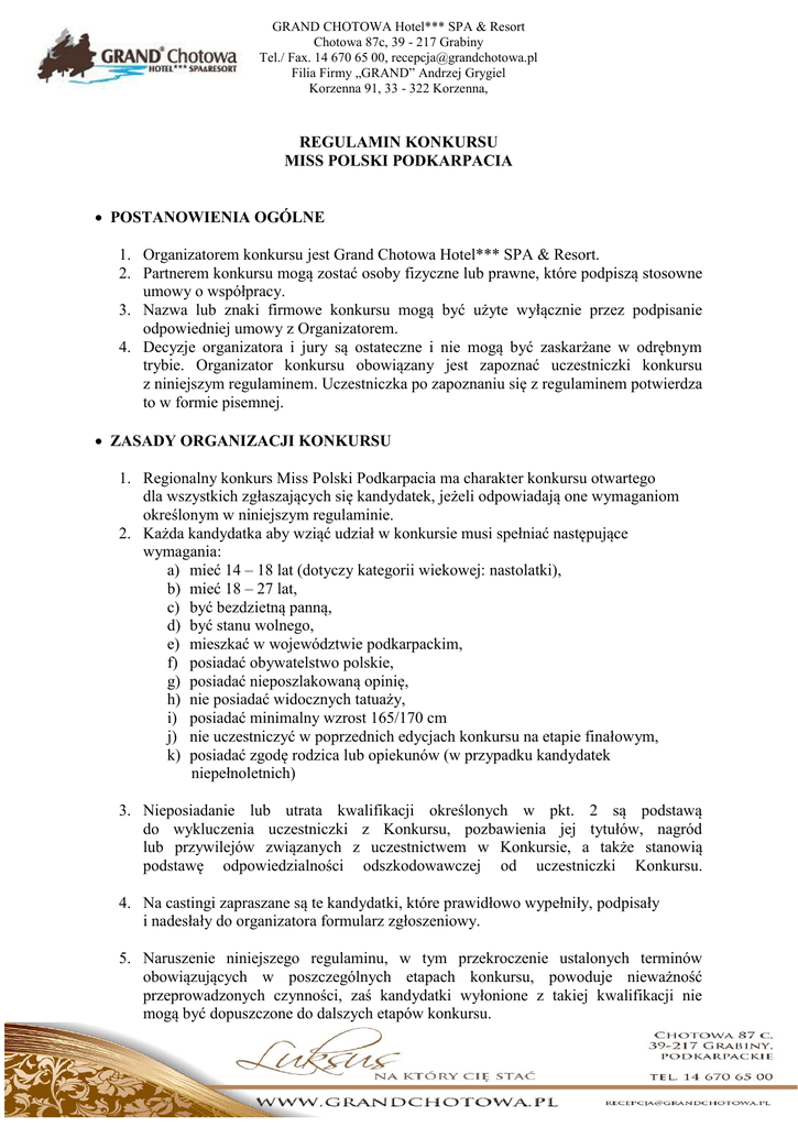 GRAND CHOTOWA Hotel*** SPA & Resort Chotowa 87c, 39 - 217 Grabiny Tel./ Fax. 14 670 65 00, [email protected] Filia Firmy „GRAND” Andrzej Grygiel Korzenna 91, 33 - 322 Korzenna, REGULAMIN KONKURSU MISS POLSKI PODKARPACIA POSTANOWIENIA OGÓLNE 1. Organizatorem konkursu jest Grand Chotowa Hotel*** SPA & Resort. 2. Partnerem konkursu mogą zostać osoby fizyczne lub prawne, które podpiszą stosowne umowy o współpracy. 3. Nazwa lub znaki firmowe konkursu mogą być użyte wyłącznie przez podpisanie odpowiedniej umowy z Organizatorem. 4. Decyzje organizatora i jury są ostateczne i nie mogą być zaskarżane w odrębnym trybie. Organizator konkursu obowiązany jest zapoznać uczestniczki konkursu z niniejszym regulaminem. Uczestniczka po zapoznaniu się z regulaminem potwierdza to w formie pisemnej. ZASADY ORGANIZACJI KONKURSU 1. Regionalny konkurs Miss Polski Podkarpacia ma charakter konkursu otwartego dla wszystkich zgłaszających się kandydatek, jeżeli odpowiadają one wymaganiom określonym w niniejszym regulaminie. 2. Każda kandydatka aby wziąć udział w konkursie musi spełniać następujące wymagania: a) mieć 14 – 18 lat (dotyczy kategorii wiekowej: nastolatki), b) mieć 18 – 27 lat, c) być bezdzietną panną, d) być stanu wolnego, e) mieszkać w województwie podkarpackim, f) posiadać obywatelstwo polskie, g) posiadać nieposzlakowaną opinię, h) nie posiadać widocznych tatuaży, i) posiadać minimalny wzrost 165/170 cm j) nie uczestniczyć w poprzednich edycjach konkursu na etapie finałowym, k) posiadać zgodę rodzica lub opiekunów (w przypadku kandydatek niepełnoletnich) 3. Nieposiadanie lub utrata kwalifikacji określonych w pkt. 2 są podstawą do wykluczenia uczestniczki z Konkursu, pozbawienia jej tytułów, nagród lub przywilejów związanych z uczestnictwem w Konkursie, a także stanowią podstawę odpowiedzialności odszkodowawczej od uczestniczki Konkursu. 4. Na castingi zapraszane są te kandydatki, które prawidłowo wypełniły, podpisały i nadesłały do organizatora formularz zgłoszeniowy. 5. Naruszenie niniejszego regulaminu, w tym przekroczenie ustalonych terminów obowiązujących w poszczególnych etapach konkursu, powoduje nieważność przeprowadzonych czynności, zaś kandydatki wyłonione z takiej kwalifikacji nie mogą być dopuszczone do dalszych etapów konkursu. GRAND CHOTOWA Hotel*** SPA & Resort Chotowa 87c, 39 - 217 Grabiny Tel./ Fax. 14 670 65 00, [email protected] Filia Firmy „GRAND” Andrzej Grygiel Korzenna 91, 33 - 322 Korzenna, 6. W toku konkursu wyłonione zostaną laureatki, które otrzymają następujące tytuły: - Miss Polski Podkarpacia 2017 - I V-ce Miss Polski Podkarpacia 2017 - II V-ce Miss Polski Podkarpacia 2017 - Miss Polski Nastolatek Podkarpacia 2017 - I V-ce Miss Polski Nastolatek Podkarpacia 2017 - II V-ce Miss Polski Nastolatek Podkarpacia 2017 7. Organizator zastrzega sobie prawo do ustalania dodatkowych tytułów. 8. Wyłonione kandydatki reprezentować będą Podkarpacie na kolejnych szczeblach konkursu walcząc o koronę Miss Polski. Organizator: Grand Chotowa Hotel*** Spa & Resort
