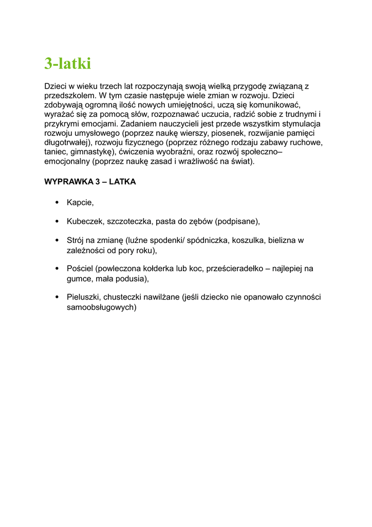 3-latki Dzieci w wieku trzech lat rozpoczynają swoją wielką przygodę związaną z przedszkolem. W tym czasie następuje wiele zmian w rozwoju. Dzieci zdobywają ogromną ilość nowych umiejętności, uczą się komunikować, wyrażać się za pomocą słów, rozpoznawać uczucia, radzić sobie z trudnymi i przykrymi emocjami. Zadaniem nauczycieli jest przede wszystkim stymulacja rozwoju umysłowego (poprzez naukę wierszy, piosenek, rozwijanie pamięci długotrwałej), rozwoju fizycznego (poprzez różnego rodzaju zabawy ruchowe, taniec, gimnastykę), ćwiczenia wyobraźni, oraz rozwój społeczno– emocjonalny (poprzez naukę zasad i wrażliwość na świat). WYPRAWKA 3 – LATKA Kapcie, Kubeczek, szczoteczka, pasta do zębów (podpisane), Strój na zmianę (luźne spodenki/ spódniczka, koszulka, bielizna w zależności od pory roku), Pościel (powleczona kołderka lub koc, prześcieradełko – najlepiej na gumce, mała podusia), Pieluszki, chusteczki nawilżane (jeśli dziecko nie opanowało czynności samoobsługowych)
