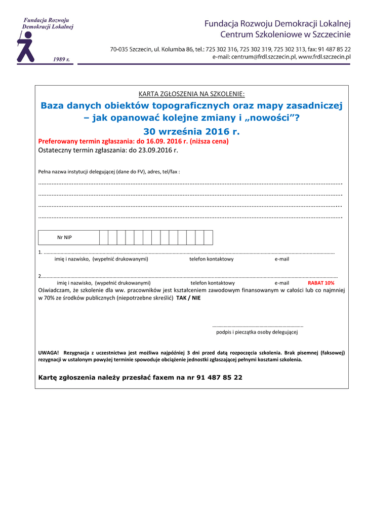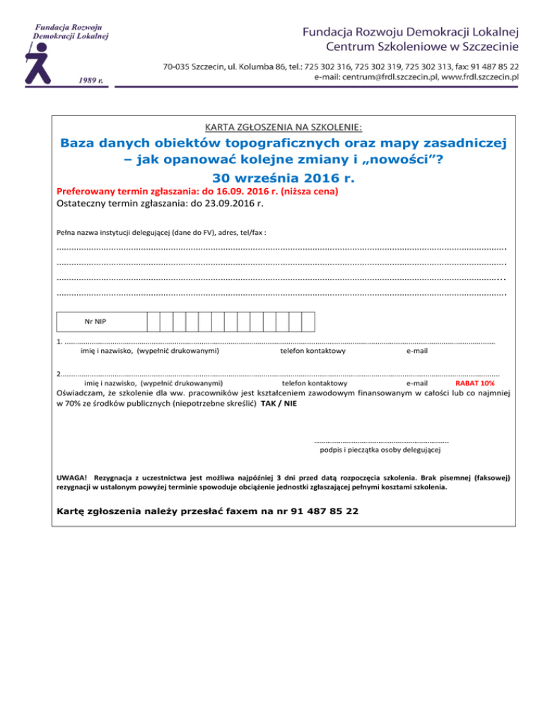 KARTA ZGŁOSZENIA NA SZKOLENIE: Baza danych obiektów topograficznych oraz mapy zasadniczej – jak opanować kolejne zmiany i „nowości”? 30 września 2016 r. Preferowany termin zgłaszania: do 16.09. 2016 r. (niższa cena) Ostateczny termin zgłaszania: do 23.09.2016 r. Pełna nazwa instytucji delegującej (dane do FV), adres, tel/fax : ………………………………………………………………………………………………………………………………………………………………. ………………………………………………………………………………………………………………………………………………………………. ……………………………………………………………………………………………………………………………………………………………... ………………………………………………………………………………………………………………………………………………………………. - Nr NIP - - 1. ................................................................................................................................................................................................................ imię i nazwisko, (wypełnić drukowanymi) telefon kontaktowy e-mail 2.................................................................................................................................................................................................................... imię i nazwisko, (wypełnić drukowanymi) telefon kontaktowy e-mail RABAT 10% Oświadczam, że szkolenie dla ww. pracowników jest kształceniem zawodowym finansowanym w całości lub co najmniej w 70% ze środków publicznych (niepotrzebne skreślić) TAK / NIE ……………………….………………………………….... podpis i pieczątka osoby delegującej UWAGA! Rezygnacja z uczestnictwa jest możliwa najpóźniej 3 dni przed datą rozpoczęcia szkolenia. Brak pisemnej (faksowej) rezygnacji w ustalonym powyżej terminie spowoduje obciążenie jednostki zgłaszającej pełnymi kosztami szkolenia. Kartę zgłoszenia należy przesłać faxem na nr 91 487 85 22