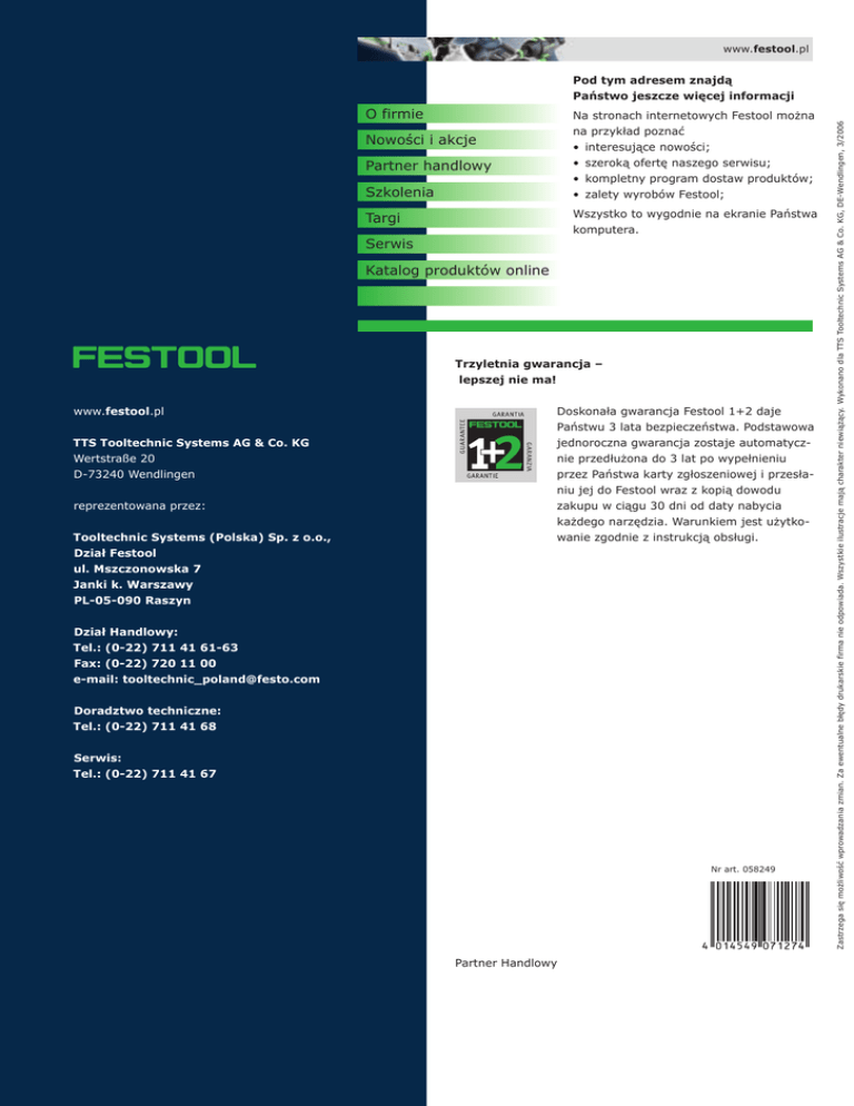 www.festool.pl O firmie Na stronach internetowych Festool można na przykład poznać • interesujące nowości; • szeroką ofertę naszego serwisu; • kompletny program dostaw produktów; • zalety wyrobów Festool; Nowości i akcje Partner handlowy Szkolenia Wszystko to wygodnie na ekranie Państwa komputera. Targi Serwis Katalog produktów online Trzyletnia gwarancja – lepszej nie ma! www.festool.pl TTS Tooltechnic Systems AG & Co. KG Wertstraße 20 D-73240 Wendlingen reprezentowana przez: Tooltechnic Systems (Polska) Sp. z o.o., Dział Festool ul. Mszczonowska 7 Janki k. Warszawy PL-05-090 Raszyn Doskonała gwarancja Festool 1+2 daje Państwu 3 lata bezpieczeństwa. Podstawowa jednoroczna gwarancja zostaje automatycznie przedłużona do 3 lat po wypełnieniu przez Państwa karty zgłoszeniowej i przesłaniu jej do Festool wraz z kopią dowodu zakupu w ciągu 30 dni od daty nabycia każdego narzędzia. Warunkiem jest użytkowanie zgodnie z instrukcją obsługi. Dział Handlowy: Tel.: (0-22) 711 41 61-63 Fax: (0-22) 720 11 00 e-mail: [email protected] Doradztwo techniczne: Tel.: (0-22) 711 41 68 Serwis: Tel.: (0-22) 711 41 67 Nr art. 058249 Partner Handlowy Zastrzega się możliwość wprowadzania zmian. Za ewentualne błędy drukarskie firma nie odpowiada. Wszystkie ilustracje mają charakter niewiążący. Wykonano dla TTS Tooltechnic Systems AG & Co. KG, DE-Wendlingen, 3/2006 Pod tym adresem znajdą Państwo jeszcze więcej informacji Festool Cristal: Zdzieranie może być tak efektywne Niezwykle agresywny – do wszystkich szlifowań zgrubnych Narzędzia spełniające najwyższe wymagania Materiał ścierny do superszybkiego szlifowania zgrubnego Festool Cristal: nowy mistrz zdzierania Czasami chodzi tylko o jedno: zdzieranie, zdzieranie, zdzieranie. Dobrze mieć wtedy pod ręką wysokowydajny materiał ścierny Festool Cristal. Oddaje on doskonałe usługi w każdej sytuacji, kiedy muszą Państwo szlifować szybko i agresywnie, a większa chropowatość nie odgrywa roli. Dodatkowym plusem jest mniejsze zużycie krążków ściernych i prosta ich wymiana. Pewne wyniki szlifowania W całym zakresie ziarnistości uzyskują Państwo tę samą jakość zeszlifowywania, gdyż nasyp ziaren ściernych jest optymalnie dostosowany do danego zakresu ziarnistości. Długi okres użytkowania Ziarna ścierne z tlenku glinu są bardzo wytrzymałe i zachowują swój geometryczny kształt niezależnie od tego, jak twarde są obrabiane przez Państwa materiały. Ten rodzaj ziaren zapewnia maksimum intensywności zdzierania – przy minimalnym zużywaniu. Najwyższa intensywność zdzierania w szlifowaniu zgrubnym* Stosując materiały ścierne Cristal uzyskują Państwo wzrost intensywności zdzierania nawet o 40 %* przy jednoczesnej znacznej redukcji zaszlichcania. Co nadaje Cristal taką efektywność zeszlifowywania? Nasyp otwarty ziaren ściernych. Niewielkie zaszlichcanie Dzięki zasadzie Jetstream krążki ścierne użytkuje się intensywniej i przede wszystkim dłużej. Dodatkowe kanały powietrzne w talerzu szlifierskim zapobiegają powstawaniu podciśnienia. Dzięki temu nie dochodzi do silnego nagrzewania powierzchni podczas szlifowania ani zaszlichcania materiału ściernego. Wyjątkowa trwałość Specjalne lepiszcze, w skład którego wchodzą żywice fenolowe, zapewnia wysoką wytrzymałość, a także elastyczność materiału ściernego. Efekt: długotrwałe złączenie ziaren ściernych z materiałem nośnika. Szybka wymiana Najprościej jak można: system rzepów StickFix Festool mocuje krążek ścierny do talerza szlifierskiego i zapewnia zawsze płaskie przyleganie do szlifowanej powierzchni. Chcąc zmienić krążek ścierny, wystarczy go ściągnąć i przyłożyć następny – gotowe! * W stosunku do Brilliant 2 i Titan 2 Laboratorium Testowe Festool wrzesień/październik 2005. Pracujcie Państwo z systemem! Rynek materiałów ściernych jest duży, krążków ściernych po cenach dumpingowych można kupić wiele. Tylko jednego często im brakuje: optymalnego dostosowania do talerzy szlifierskich i maszyny. Całkiem po prostu dlatego, że większość tych materiałów ściernych ma pasować do możliwie wielu narzędzi. Specjalnie do szlifowania wstępnego Tak jak różne są wymagania, tak różne są w danym przypadku najlepsze rozwiązania. Dlatego uzupełniliśmy nasz program dostaw materiałów ściernych o specjalistę do szlifowania wstępnego: Festool Cristal. Otwarty nasyp ziaren sprawia, że ten materiał ścierny jest tak efektywny w zdzieraniu, jak chyba żaden inny, i tworzy najlepsze warunki do drugiego szlifowania. Lepiej już nie możecie Państwo przygotować obrabianych przedmiotów! W Festool tak nie jest: nasze materiały ścierne są doskonale dostosowane do naszych narzędzi i do konkretnych zastosowań. Dzięki temu uzyskują Państwo lepsze wyniki. Po pierwsze dlatego, że wszystko idealnie współgra tu ze sobą: od materiału ściernego, poprzez talerz szlifierski, a skończywszy na odkurzaczu. Po drugie ważna jest jakość materiałów ściernych - pozwala ona jeszcze lepiej wykorzystać techniczne zalety naszych narzędzi. Aby mogli Państwo szybciej i łatwiej dojść do celu. Nasyp otwarty – na nowo zdefiniowany Dotychczas materiały ścierne z nasypem otwartym miały pewne wady - ale teraz mogą o nich Państwo zapomnieć. Poprzez doskonałe zgranie maszyny, talerzy szlifierskich i materiałów ściernych Festool w zadziwiający sposób zminimalizowane zostaje powstawanie wyżłobień oraz wysiłek, jakiego wymaga szlifowanie. Najlepiej to wypróbować! Zawsze perfekcyjnie zaprojektowane pod kątem maszyn Festool: materiały ścierne Festool Cristal, Brilliant 2, Titan 2, Rubin, Saphir, Platin 2 i Vlies. Niewielkie wyżłobienia mimo otwartej struktury: umożliwia to kombinacja Cristal ze sprawdzonymi maszynami Festool. Państwa najszybsza droga do najlepszego wyniku: • Do wstępnego szlifowania: Festool Cristal • Dla doskona