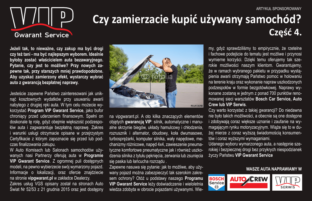 ARTYKUŁ SPONSOROWANY Czy zamierzacie kupić używany samochód? Część 4. Jeżeli tak, to nieważne, czy zakup ma być drogi czy też tani - ma być najlepszym wyborem. Idealnie byłoby zostać właścicielem auta bezawaryjnego. Pytanie, czy jest to możliwe? Przy nowych zapewne tak, przy starszych mniej prawdopodobne. Aby uzyskać zamierzony efekt, wystarczy wybrać auto z gwarancją bezpłatnej naprawy. Jesteście zapewne Państwo zainteresowani jak uniknąć kosztownych wydatków przy usuwaniu awarii nabytego z drugiej ręki auta. W tym celu możecie wykorzystać Program VIP Gwarant Service, jako bufor chroniący przed uderzeniem finansowym. Spełni on doskonale tę rolę, gdyż obejmie większość podzespołów auta i zagwarantuje bezpłatną naprawę. Zakres i warunki usługi otrzymacie opisane w przejrzystym Certyfikacie z którym zapoznacie się przed lub podczas finalizowania zakupu. W Auto Komisach lub Salonach samochodów używanych nasi Partnerzy oferują auta w Programie VIP Gwarant Service. Z ogromnej puli dostępnych modeli, na pewno wybierzecie swój wymarzony pojazd. Informacje o lokalizacji, oraz ofercie znajdziecie na stronie vipgwarant.pl w zakładce Dealerzy. Zakres usług VGS opisany został na stronach Auto Świat Nr 52/53 z 21 grudnia 2015 oraz jest dostępny na vipgwarant.pl. A oto kilka znaczących elementów objętych gwarancją VIP: silnik, automatyczne i manualne skrzynie biegów, układy hamulcowy i chłodzenia, rozrusznik i alternator, obudowy, koła dwumasowe, turbosprężarki, komputer silnika, wały napędowe, mechanizmy różnicowe, napęd 4x4, zawieszenie pneumatyczne komfortowe pneumatyczne jak i również uszkodzenia silnika z tytułu pęknięcia, zerwania lub zsunięcia się paska lub łańcucha rozrządu . Zapewne nasuwa się pytanie: jak to możliwe, aby używany pojazd można zabezpieczyć tak szerokim zakresem ochrony? Otóż u podstawy naszego Programu VIP Gwarant Service leży doświadczenie i wieloletnia wiedza zdobyta w obrocie pojazdami używanymi. Wie- my, gdyż sprawdziliśmy to empirycznie, że rzetelne i fachowe podejście do tematu jest możliwe i przynosi wymierne korzyści. Dzięki temu oferujemy tak szerokie możliwości naszym klientom. Gwarantujemy, że w ramach wybranego pakietu w przypadku wystąpienia awarii otrzymają Państwo pomoc w holowaniu na terenie kraju oraz wykonanie napraw uszkodzonych podzespołów w formie bezgotówkowej. Naprawy wykonane zostaną w jednym z ponad 700 punktów renomowanej sieci warsztatów Bosch Car Service, Auto Crew lub VIP Serwis. Czy warto korzystać z takiej gwarancji? Do niedawna nie było takich możliwości, a obecnie są one dostępne i zdobywają coraz większe uznanie i zaufanie na wymagającym rynku motoryzacyjnym. Wiąże się to w dużej mierze z coraz wyższą świadomością konsumentów i coraz wyższymi wymaganiami. Udanego wyboru wymarzonego auta, a następnie szerokiej i bezpiecznej drogi bez przykrych niespodzianek życzy Państwu VIP Gwarant Service WASZE AUTA NAPRAWIAMY W