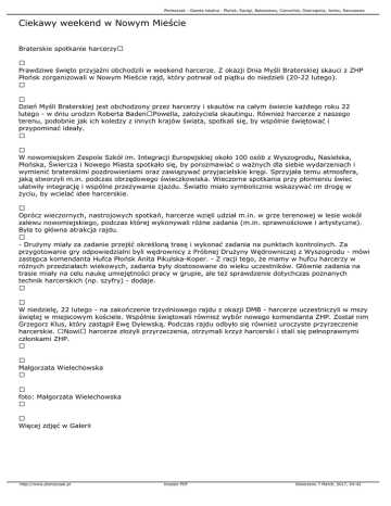 Płońszczak - Gazeta lokalna - Płońsk, Raciąż, Baboszewo, Czerwińsk, Dzierzążnia, Joniec, Naruszewo Ciekawy weekend w Nowym Mieście Braterskie spotkanie harcerzy Prawdziwe święto przyjaźni obchodzili w weekend harcerze. Z okazji Dnia Myśli Braterskiej skauci z ZHP Płońsk zorganizowali w Nowym Mieście rajd, który potrwał od piątku do niedzieli (20-22 lutego). Dzień Myśli Braterskiej jest obchodzony przez harcerzy i skautów na całym świecie każdego roku 22 lutego - w dniu urodzin Roberta BadenPowella, założyciela skautingu. Również harcerze z naszego terenu, podobnie jak ich koledzy z innych krajów świata, spotkali się, by wspólnie świętować i przypominać ideały. W nowomiejskim Zespole Szkół im. Integracji Europejskiej około 100 osób z Wyszogrodu, Nasielska, Płońska, Świercza i Nowego Miasta spotkało się, by porozmawiać o ważnych dla siebie wydarzeniach i wymienić braterskimi pozdrowieniami oraz zawiązywać przyjacielskie kręgi. Sprzyjała temu atmosfera, jaką stworzyli m.in. podczas obrzędowego świeczkowiska. Wieczorne spotkania przy płomieniu świec ułatwiły integrację i wspólne przeżywanie zjazdu. Światło miało symbolicznie wskazywać im drogę w życiu, by wcielać idee harcerskie. Oprócz wieczornych, nastrojowych spotkań, harcerze wzięli udział m.in. w grze terenowej w lesie wokół zalewu nowomiejskiego, podczas której wykonywali różne zadania (m.in. sprawnościowe i artystyczne). Była to główna atrakcja rajdu. - Drużyny miały za zadanie przejść określoną trasę i wykonać zadania na punktach kontrolnych. Za przygotowanie gry odpowiedzialni byli wędrownicy z Próbnej Drużyny Wędrowniczej z Wyszogrodu - mówi zastępca komendanta Hufca Płońsk Anita Pikulska-Koper. - Z racji tego, że mamy w hufcu harcerzy w różnych przedziałach wiekowych, zadania były dostosowane do wieku uczestników. Głównie zadania na trasie miały na celu naukę umiejętności pracy w grupie, ale też sprawdzenie dotychczas poznanych technik harcerskich (np. szyfry) - dodaje. W niedzielę, 22 lutego - na zakończenie trzydniowego rajdu z okazji DMB - harcerze uczestniczyli w mszy świętej w miejscowym kościele. Wspólnie świętowali również wybór nowego komendanta ZHP. Został nim Grzegorz Klus, który zastąpił Ewę Dylewską. Podczas rajdu odbyło się również uroczyste przyrzeczenie harcerskie. Nowi harcerze złożyli przyrzeczenia, otrzymali krzyż harcerski i stali się pełnoprawnymi członkami ZHP. Małgorzata Wielechowska foto: Małgorzata Wielechowska Więcej zdjęć w Galerii http://www.plonszczak.pl Kreator PDF Utworzono 7 March, 2017, 04:42