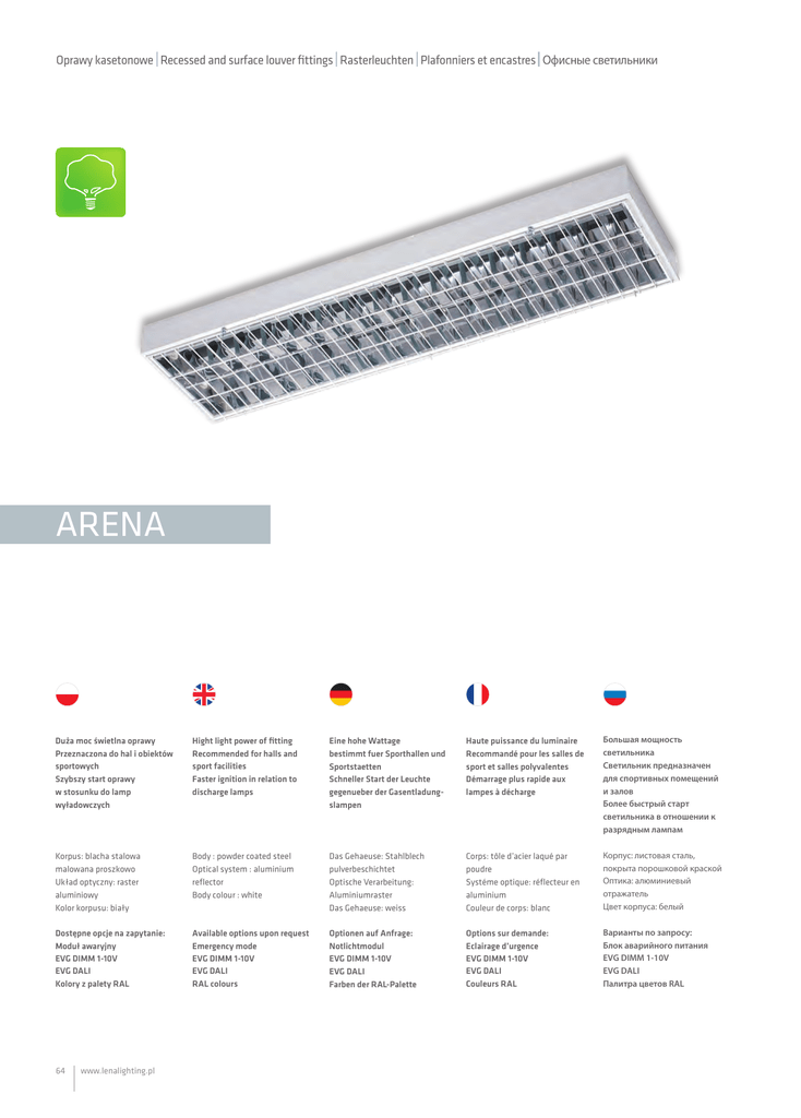 Oprawy kasetonowe Recessed and surface louver fittings Rasterleuchten Plafonniers et encastres Oфисные светильники ARENA Duża moc świetlna oprawy Przeznaczona do hal i obiektów sportowych Szybszy start oprawy w stosunku do lamp wyładowczych Hight light power of fitting Recommended for halls and sport facilities Faster ignition in relation to discharge lamps Eine hohe Wattage bestimmt fuer Sporthallen und Sportstaetten Schneller Start der Leuchte gegenueber der Gasentladungslampen Haute puissance du luminaire Recommandé pour les salles de sport et salles polyvalentes Démarrage plus rapide aux lampes à décharge Большая мощность светильника Светильник предназначен для спортивных помещений и залов Более быстрый старт светильника в отношении к разрядным лампам Korpus: blacha stalowa malowana proszkowo Układ optyczny: raster aluminiowy Kolor korpusu: biały Body : powder coated steel Optical system : aluminium reflector Body colour : white Das Gehaeuse: Stahlblech pulverbeschichtet Optische Verarbeitung: Aluminiumraster Das Gehaeuse: weiss Corps: tôle d’acier laqué par poudre Systéme optique: réflecteur en aluminium Couleur de corps: blanc Корпус: листовая сталь, покрыта порошковой краской Оптика: алюминиевый отражатель Цвет корпуса: белый Dostępne opcje na zapytanie: Moduł awaryjny EVG DIMM 1-10V EVG DALI Kolory z palety RAL Available options upon request Emergency mode EVG DIMM 1-10V EVG DALI RAL colours Optionen auf Anfrage: Notlichtmodul EVG DIMM 1-10V EVG DALI Farben der RAL-Palette Options sur demande: Eclairage d’urgence EVG DIMM 1-10V EVG DALI Couleurs RAL Варианты по запросу: Блок аварийного питания EVG DIMM 1-10V EVG DALI Палитра цветов RAL 64 www.lenalighting.pl Oфисные светильники Plafonniers et encastres Rasterleuchten Recessed and surface louver fittings Oprawy kasetonowe index index max moc max power 043550 2x54W 043536 4x55W 043512 trzonek end cap siatka net rodzaj odbłyśnika type of reflector EVG/VVG waga netto net weight wymiary produktu product dimensions A/B/C wymiary montażowe installation dimensions G5 PAR EVG 4,40 1215/315/82 1005/220 2G11 PAR EVG 4,40 1215/315/82 1005/220 4x80W 2G11 PAR EVG 4,40 1215/315/82 1005/220 043543 2x54W G5 PAR EVG 4,80 1215/315/83 1005/220 x 043529 4x55W 2G11 PAR EVG 4,80 1215/315/83 1005/220 x 043505 4x80W 2G11 PAR EVG 4,80 1215/315/83 1005/220 x 1 ARENA 4x55W 180° 105° 105° 90° 90° 75° 75° 60° 60° 45° 45° 30° cd/klm CO - C180 15° 0° 15° 30° C9O - C270 www.lenalighting.pl 65