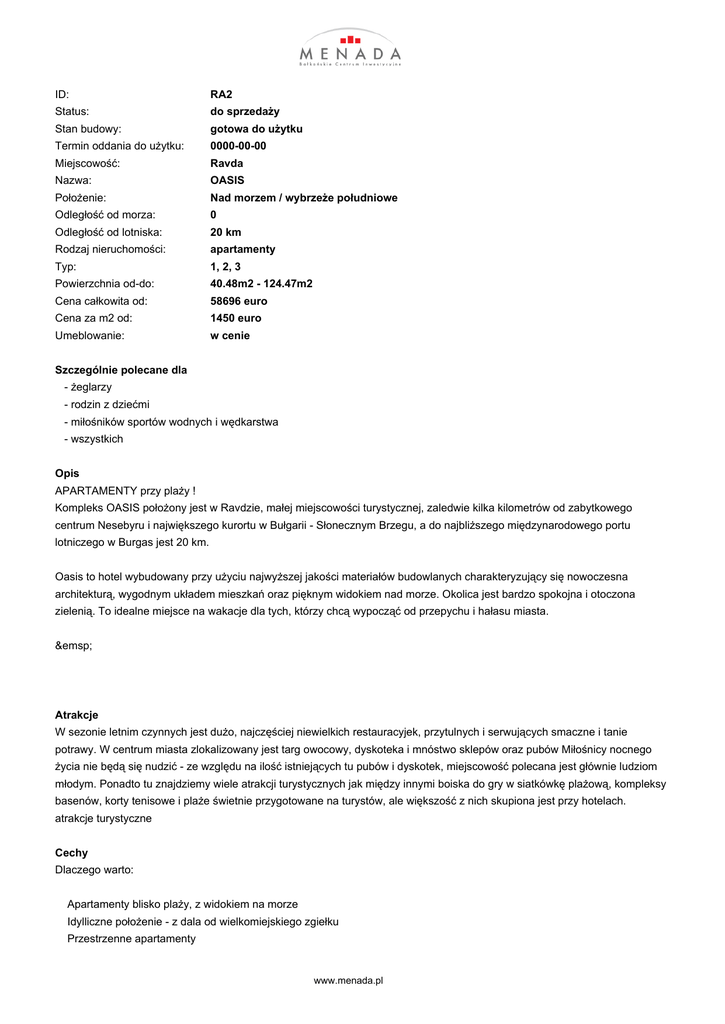 ID: RA2 Status: do sprzedaży Stan budowy: gotowa do użytku Termin oddania do użytku: 0000-00-00 Miejscowość: Ravda Nazwa: OASIS Położenie: Nad morzem / wybrzeże południowe Odległość od morza: 0 Odległość od lotniska: 20 km Rodzaj nieruchomości: apartamenty Typ: 1, 2, 3 Powierzchnia od-do: 40.48m2 - 124.47m2 Cena całkowita od: 58696 euro Cena za m2 od: 1450 euro Umeblowanie: w cenie Szczególnie polecane dla - żeglarzy - rodzin z dziećmi - miłośników sportów wodnych i wędkarstwa - wszystkich Opis APARTAMENTY przy plaży ! Kompleks OASIS położony jest w Ravdzie, małej miejscowości turystycznej, zaledwie kilka kilometrów od zabytkowego centrum Nesebyru i największego kurortu w Bułgarii - Słonecznym Brzegu, a do najbliższego międzynarodowego portu lotniczego w Burgas jest 20 km. Oasis to hotel wybudowany przy użyciu najwyższej jakości materiałów budowlanych charakteryzujący się nowoczesna architekturą, wygodnym układem mieszkań oraz pięknym widokiem nad morze. Okolica jest bardzo spokojna i otoczona zielenią. To idealne miejsce na wakacje dla tych, którzy chcą wypocząć od przepychu i hałasu miasta.   Atrakcje W sezonie letnim czynnych jest dużo, najczęściej niewielkich restauracyjek, przytulnych i serwujących smaczne i tanie potrawy. W centrum miasta zlokalizowany jest targ owocowy, dyskoteka i mnóstwo sklepów oraz pubów Miłośnicy nocnego życia nie będą się nudzić - ze względu na ilość istniejących tu pubów i dyskotek, miejscowość polecana jest głównie ludziom młodym. Ponadto tu znajdziemy wiele atrakcji turystycznych jak między innymi boiska do gry w siatkówkę plażową, kompleksy basenów, korty tenisowe i plaże świetnie przygotowane na turystów, ale większość z nich skupiona jest przy hotelach. atrakcje turystyczne Cechy Dlaczego warto: Apartamenty blisko plaży, z widokiem na morze Idylliczne położenie - z dala od wielkomiejskiego zgiełku Przestrzenne apartamenty www.menada.pl Cechy: Basen Bar przy basenie Kawiarnia Restauracja Sklepy Plac zabaw dla dzieci Parking strzeżony Całodobowa ochrona   Usługi Całoroczna opłata za zarządzanie: 6,5 Euro/m2 bez Vat Nieruchomość jest utrzymywana przez zarządcę w czystości i porządku. Oczywiście deweloper zapewnia zarządzanie obiektem, ochronę obiektu. Nasza firma również dba o utrzymanie apartamentu w ciągu roku - Dla naszych Klientów zapewniamy utrzymanie nieruchomości, ochronę 24 h przez cały rok, oświetlenie, bezpieczeństwo elektryczne i wodne, naprawy, sprzątanie i czyszczenie części wspólnych, zieleni, czyszczenie apartamentu czy też płatności rachunków. Uzyskiwanie dodatkowych dochodów z ewentualnego wynajmu apartamentu - Zapewniamy bowiem również organizację wynajmu apartamentu. obsługa posprzedażowa Zasady płatności PLAN PŁATNOŚCI: Depozyt (do uzgodnienia) 100% od 4 do 6 tygodni (w zależności od klienta do uzgodnienia z deweloperem) Koszty: Należy pamiętać, iż oprócz ceny za nieruchomość dochodzi koszt związany z opłatą notarialną u Notariusza (jest to maksymalnie 3,5 - 4% wartości zakupu). www.menada.pl
