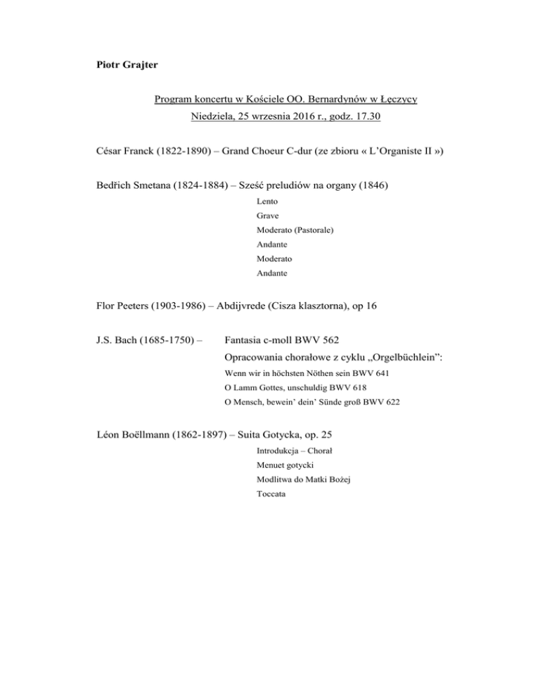 Piotr Grajter Program koncertu w Kościele OO. Bernardynów w Łęczycy Niedziela, 25 wrzesnia 2016 r., godz. 17.30 César Franck (1822-1890) – Grand Choeur C-dur (ze zbioru « L’Organiste II ») Bedřich Smetana (1824-1884) – Sześć preludiów na organy (1846) Lento Grave Moderato (Pastorale) Andante Moderato Andante Flor Peeters (1903-1986) – Abdijvrede (Cisza klasztorna), op 16 J.S. Bach (1685-1750) – Fantasia c-moll BWV 562 Opracowania chorałowe z cyklu „Orgelbüchlein”: Wenn wir in höchsten Nöthen sein BWV 641 O Lamm Gottes, unschuldig BWV 618 O Mensch, bewein’ dein’ Sünde groß BWV 622 Léon Boëllmann (1862-1897) – Suita Gotycka, op. 25 Introdukcja – Chorał Menuet gotycki Modlitwa do Matki Bożej Toccata Nota biograficzna Piotr Grajter, ur. w 1955 r. w Łodzi, ukończył studia w tutejszej Akademii Muzycznej uzyskując w latach 1980 i 1981 dyplomy z wyróżnieniem w zakresie gry na organach (klasa prof. Mirosława Pietkiewicza) i teorii muzyki (praca dyplomowa pod kierunkiem prof. Antoniego Kędry), a następnie w r. 1984 dyplom w zakresie kompozycji (klasa prof. Jerzego Bauera). Jako stypendysta fundacji "Rotary-Club" odbył w roku akad. 1981/82 gościnne studia w klasie organów prof. Ernst-Ulricha von Kameke w Hamburgu. Brał udział w kursach mistrzowskich interpretacji organowej prof. prof. Johannesa-Ernsta Köhlera w Weimarze, Milana Šlechty w Pradze i Flora Peetersa w Mechelen. Koncertuje od roku 1980, uczestnicząc w wielu krajowych i zagranicznych festiwalach muzyki organowej. Poza Polską występował z recitalami organowymi w Belgii, Czechach, Danii, Francji, Mołdawii, Niemczech, Rosji, Słowacji i na Ukrainie. Był jurorem Międzynarodowych Konkursów Organowych: im. Mikaela Tariverdieva w Kaliningradzie (1999) oraz im. Jana Kucharskiego w Łodzi (2008, 2014). W latach 1992-2001 sprawował opiekę artystyczną nad Festiwalem Muzyki Organowej w Inowrocławiu. Jest profesorem sztuk muzycznych. Prowadzi klasy organów w Akademiach Muzycznych w Łodzi i w Bydgoszczy. W łódzkiej uczeln pełnił w latach 2003-2005 funkcję kierownika Katedry Organów, Klawesynu i Muzyki Dawnej.
