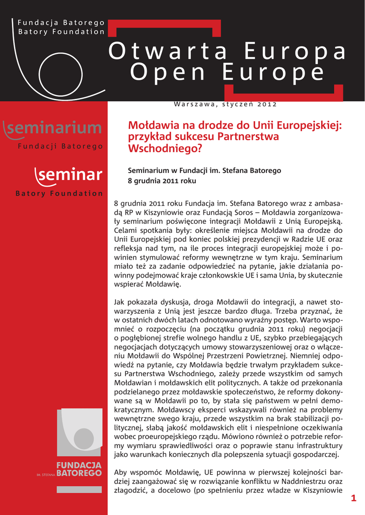 Fundacja Batorego Batory Foundation Otwarta Europa Open Europe Wa r s z a wa , s t yc ze ń 2 0 1 2 seminarium Fundacji Batorego seminar Mołdawia na drodze do Unii Europejskiej: przykład sukcesu Partnerstwa Wschodniego? Seminarium w Fundacji im. Stefana Batorego 8 grudnia 2011 roku Batory Foundation 8 grudnia 2011 roku Fundacja im. Stefana Batorego wraz z ambasadą RP w Kiszyniowie oraz Fundacją Soros – Mołdawia zorganizowały seminarium poświęcone integracji Mołdawii z Unią Europejską. Celami spotkania były: określenie miejsca Mołdawii na drodze do Unii Europejskiej pod koniec polskiej prezydencji w Radzie UE oraz refleksja nad tym, na ile proces integracji europejskiej może i powinien stymulować reformy wewnętrzne w tym kraju. Seminarium miało też za zadanie odpowiedzieć na pytanie, jakie działania powinny podejmować kraje członkowskie UE i sama Unia, by skutecznie wspierać Mołdawię. Jak pokazała dyskusja, droga Mołdawii do integracji, a nawet stowarzyszenia z Unią jest jeszcze bardzo długa. Trzeba przyznać, że w ostatnich dwóch latach odnotowano wyraźny postęp. Warto wspomnieć o rozpoczęciu (na początku grudnia 2011 roku) negocjacji o pogłębionej strefie wolnego handlu z UE, szybko przebiegających negocjacjach dotyczących umowy stowarzyszeniowej oraz o włączeniu Mołdawii do Wspólnej Przestrzeni Powietrznej. Niemniej odpowiedź na pytanie, czy Mołdawia będzie trwałym przykładem sukcesu Partnerstwa Wschodniego, zależy przede wszystkim od samych Mołdawian i mołdawskich elit politycznych. A także od przekonania podzielanego przez mołdawskie społeczeństwo, że reformy dokonywane są w Mołdawii po to, by stała się państwem w pełni demokratycznym. Mołdawscy eksperci wskazywali również na problemy wewnętrzne swego kraju, przede wszystkim na brak stabilizacji politycznej, słabą jakość mołdawskich elit i niespełnione oczekiwania wobec proeuropejskiego rządu. Mówiono również o potrzebie reformy wymiaru sprawiedliwości oraz o poprawie stanu infrastruktury jako warunkach koniecznych dla polepszenia sytuacji gospodarczej. Aby wspomóc Mołdawię, UE powinna w pierwszej kolejności bardziej zaangażować się w rozwiązanie konfliktu w Naddniestrzu oraz złagodzić, a docelowo (po spełnieniu przez władze w Kiszyniowie seminarium»seminar zobowiązań ujętych w planie działań) znieść obowiązek wizowy dla obywateli Mołdawii. W trakcie dyskusji wskazywano również na kluczową dla Mołdawii współpracę z Polską, która może odegrać rolę skutecznego adwokata w procesie zbliżania tego kraju z UE – od liberalizacji reżimu wizowego aż do członkostwa w UE. W spotkaniu uczestniczyli przedstawiciele najważniejszych mołdawskich think tanków i organizacji pozarządowych oraz mołdawskiego Ministerstwa Spraw Zagranicznych i Integracji Europejskiej, a także eksperci z Polski, Niemiec i Wielkiej Brytanii. Wprowadzenie Paweł Bagiński (Fundacja im. Stefana Batorego): Chyba niewielu z nas zdaje sobie sprawę z tego, jak geograficznie bliskim Polsce krajem jest Mołdawia – nasze państwa dzieli zaledwie 400 km. Mimo niewielkiej odległości Mołdawia jest w Polsce bardzo mało znana. Dlatego zależało nam na zorganizowaniu seminarium, które pomogłoby przybliżyć polskiej opinii publicznej problemy i wyzwania stojące dziś przed tym krajem. Moment, w którym się spotykamy, jest szczególny – to końcówka polskiej prezydencji, która splata się z bodajże największym kryzysem Unii od początku jej istnienia. Dokładnie dziś [8 grudnia 2011 roku, red.] w Brukseli zaczyna się szczyt Rady Europejskiej, który być może zadecyduje o przyszłości strefy euro i Unii jako takiej. W tym czasie ze wschodniej strony kontynentu płyną do nas niezbyt optymistyczne sygnały. Ukraina, Białoruś i Rosja zdają się oddalać od europejskich wartości. Wydaje się, że dziś cała Europa potrzebuje pozytywnego przesłania. Stąd oczekiwania wobec Mołdawii, Szczyt Rady Europejskiej odbył się w Brukseli 8–9 grudnia 2011 roku i poświęcony był przede wszystkim trudnej sytuacji gospodarczej państw unii walutowej. 26 spośród 27 krajów członkowskich otworzyło drogę do zawarcia traktatu międzyrządowego mającego na celu stabilizację gospodarczą UE. Głównymi tematami rozmów były: zadłużenie i deficyt, zagwarantowanie stabilności finansowej strefy euro, wzrost gospodarczy i zatrudnienie oraz rozszerzenie UE o nowe kraje. które pojawiły się już na początku polskiej prezydencji – kraj ten miał stać się źródłem pozytywnego myślenia o Europie. Sprawując prezydencję w Radzie UE, Polska pokłada w Mołdawii wielkie nadzieje. O Mołdawii jako przykładzie sukcesu wielokrotnie mówił minister spraw zagranicznych Radosław Sikorski. I co ważne, te oczekiwania znajdują potwierdzenie w faktach. Badania i analizy – jak choćby wydany niedawno przez ukraińską Międzynarodową Fundację Renesans Indeks integracji europejskiej krajów Partnerstwa Wschodniego – wskazują, że to właśnie Mołdawia jest najbardziej zintegrowana z UE spośród wszystkich państw PW. Podobne wnioski znajdziemy w raporcie dotyczącym wdrażania Europejskiej Polityki Sąsiedztwa, opublikowanym wiosną 2011 roku przez Komisję Europejską. Oczywiście to tylko jedna strona medalu. Doskonale zdajemy sobie sprawę z tego, że Mołdawia boryka się z wieloma problemami i wyzwaniami. Do najważniejszych należy zaliczyć: niestabilność polityczną, niski poziom życia, głębokie podziały społeczne. W wielu obszarach proces wdrażania reform powinien zostać przyspieszony. Tak więc przed władzami w Kiszyniowie stoją konkretne wyzwania i bardzo wiele decyzji do podjęcia, o których – mam nadzieję – będziemy mogli dziś porozmawiać. Jednak Mołdawii nie należy pozostawiać samej sobie. Wesprzeć ją powinna przede wszystkim Unia Europejska, i to pomimo swoich wewnętrznych trudności. Niestety, problem