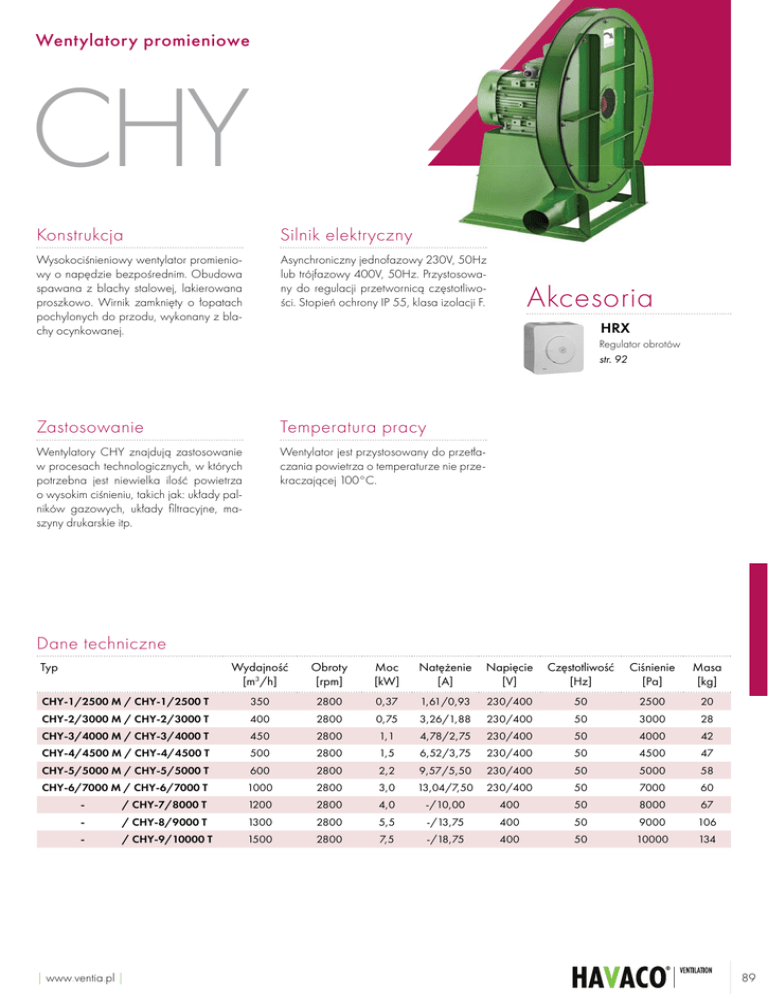 Wentylatory promieniowe CHY Konstrukcja Silnik elektryczny Wysokociśnieniowy wentylator promieniowy o napędzie bezpośrednim. Obudowa spawana z blachy stalowej, lakierowana proszkowo. Wirnik zamknięty o łopatach pochylonych do przodu, wykonany z blachy ocynkowanej. Asynchroniczny jednofazowy 230V, 50Hz lub trójfazowy 400V, 50Hz. Przystosowany do regulacji przetwornicą częstotliwości. Stopień ochrony IP 55, klasa izolacji F. Akcesoria HRX Regulator obrotów str. 92 Zastosowanie Temperatura pracy Wentylatory CHY znajdują zastosowanie w procesach technologicznych, w których potrzebna jest niewielka ilość powietrza o wysokim ciśnieniu, takich jak: układy palników gazowych, układy filtracyjne, maszyny drukarskie itp. Wentylator jest przystosowany do przetłaczania powietrza o temperaturze nie przekraczającej 100°C. Dane techniczne Typ Wydajność [m3/h] Obroty [rpm] Moc [kW] Natężenie [A] Napięcie [V] Częstotliwość [Hz] Ciśnienie [Pa] Masa [kg] CHY-1/2500 M / CHY-1/2500 T 350 2800 0,37 1,61/0,93 230/400 50 2500 20 CHY-2/3000 M / CHY-2/3000 T 400 2800 0,75 3,26/1,88 230/400 50 3000 28 CHY-3/4000 M / CHY-3/4000 T 450 2800 1,1 4,78/2,75 230/400 50 4000 42 CHY-4/4500 M / CHY-4/4500 T 500 2800 1,5 6,52/3,75 230/400 50 4500 47 CHY-5/5000 M / CHY-5/5000 T 600 2800 2,2 9,57/5,50 230/400 50 5000 58 CHY-6/7000 M / CHY-6/7000 T 1000 2800 3,0 13,04/7,50 230/400 50 7000 60 - / CHY-7/8000 T 1200 2800 4,0 -/10,00 400 50 8000 67 - / CHY-8/9000 T 1300 2800 5,5 -/13,75 400 50 9000 106 - / CHY-9/10000 T 1500 2800 7,5 -/18,75 400 50 10000 134 | www.ventia.pl | 89 Rysunek techniczny Wymiary [mm] Typ A B C D E F 490 50 270 55 310 420 CHY-2/3000 570 50 290 55 370 490 CHY-3/4000 600 50 290 55 390 520 CHY-4/4500 640 50 340 55 430 560 CHY-5/5000 690 60 380 65 440 600 CHY-6/7000 700 70 440 75 460 600 CHY-7/8000 770 70 470 75 550 670 CHY-1/2500 CHY-8/9000 810 70 530 75 620 720 CHY-9/10000 900 85 580 90 660 820 Charakterystyki CHY-1/2500 90 CHY-2/3000 | www.ventia.pl | Charakterystyki CHY-4/4500 CHY-3/4000 CHY-5/5000 CHY-6/7000 CHY-7/8000 CHY-8/9000 CHY-9/10000 | www.ventia.pl | 91