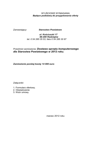 WYJŚCIOWE WYMAGANIA Będące podstawą do przygotowania oferty Zamawiający: Starostwo Powiatowe ul. Kościuszki 17 88-200 Radziejów tel. 0 54 285 35 53, faks 0 54 285 30 87 Przedmiot zamówienia: Dostawa sprzętu komputerowego dla Starostwa Powiatowego w 2012 roku. Zamówienie poniżej kwoty 14 000 euro Załączniki: 1. Formularz ofertowy. 2. Oświadczenie 3. Wzór umowy marzec 2012 roku WYMAGANIA WYJŚCIOWE STANOWIĄCE PODSTAWĘ DO PRZYGOTOWANIA OFERTY Zamawiający: Starostwo Powiatowe ul. Kościuszki 17 88-200 Radziejów 1. Opis przedmiotu zamówienia. Przedmiot zamówienia obejmuje – dostawę sprzętu komputerowego dla Starostwa Powiatowego w Radziejowie. Dostawa obejmuje: 1. monitor – 3 sztuki 21,5'' Flatron E2211S-BN LED gwarancja 24 miesiące w serwisie zewnętrznym technologia wykonania TN rodzaj podświetlenia LED rozdzielczość nominalna 1920 x 1080 piksele jasność 250 cd/m² wielkość plamki 0.25 mm czas reakcji plamki 5 ms kąt widzenia pion 160 ° kąt widzenia poziom 170 ° ilość wyświetlanych kolorów 16.7 mln analogowe złącze D-Sub 15-pin tak zgodność z technologią HDCP nie spełniane normy jakościowe TUV-GS TCO 2006 TCO 2003 ISO 13406-2 szerokość 509 mm wysokość 399 mm głębokość 210 mm waga 4.35 kg kolor obudowy czarny 2. urządzenie wielofunkcyjne – 1 sztuka Color LaserJet CM2320nf MFP gwarancja 12 miesięcy w serwisie zewnętrznym technologia druku laserowa kolorowa maks. rozmiar nośnika A4 rozdzielczość druku w czerni 600 x 600 dpi rozdzielczość druku w kolorze 600 x 600 dpi maks. szybkość druku mono 20 str./min. maks. szybkość druku kolor 20 str./min. typ skanera skaner typu CCD | skaner płaski rozdzielczość skanera 1200 dpi głębia koloru 42 bit rozdzielczość kopiarki 600 x 600 dpi funkcje specjalne kopiarki liczba kopii 1-99 szybkość transmisji faksu 33.6 kbps rozdzielczość faksu 300 x 300 dpi interfejs USB 2.0 Ethernet 10/100 Mbps szerokość 497 mm głębokość 492 mm wysokość 550 mm waga 26.9 kg normatywne obciążenie 40000 str./mies. Urządzenie wielofunkcyjne fax Język panelu urządzenia – POLSKI (wyświetlacz, obudowa) 3. Drukarka FS-1120DN – 1 sztuka Gwarancja 24miesiące nominalna prędkość druku 30 str./min. rozdzielczość w pionie 1200 dpi rozdzielczość w poziomie 1200 dpi normatywny cykl pracy 20000 str./mies. gramatura papieru 60 - 220 g/m² pojemność podajnika papieru 250 szt. maks. pojemność podajników 550 szt. zainstalowana pamięć 32 MB maks. pojemność pamięć 544 MB prędkość procesora 360 MHz maks. rozmiar nośnika A4 złącza zewnętrzne USB 2.0 Ethernet 10/100 Mbps obsługiwane języki PreScribe PostScript v3 KPDL3 emulacje języków PostScript v3 IBM ProPrinter Epson LQ-850 Diablo 630 AES druk dwustronny [dupleks] tak praca w sieci [serwer wydruku] tak interfejs sieciowy (serwer druku) dupleks (moduł druku dwustronnego) szerokość 375 mm głębokość 393 mm wysokość 250 mm waga 12 kg symbol tonera TK-160 Wydajność tonera 2500 stron A4 4. FAX KX-MB 2030 – 1 sztuka Zgodność Super G3 Podajnik Dokumentów 20.0 Pojemność Pamięci Obrazu 3.5 MB Prędkość modemu (kbps) 33.6 Multi-Function Network Compatible Tak 10/100BASE-T Compatible Tak Oprogramowanie OCR Tak Caller ID Data Transfer Tak PC Fax Phone Directory Tak PC Scanner (dpi) Do 600 x 600 dpi (optyczna) Do 9600 x 9600 dpi (interpolowana) PC Printer (dpi) 600 x 600 dpi Interfejs USB Tak PC Printer / Printer Print engine Laserowa Czas nagrzewania (sekundy) 16.0 Rozdzielczość wydruku (DPI) 600 x 600 dpi Emulacja druku GDI PC Interface USB 2.0 high-speed ,10/100Base-T OS Windows® 2000 / XP / Windows Vista® Pamięć 32 MB PC Scanner Skanowanie kolorowe (input/output bits) 48/24 bits Skanowanie monochromatyczne (input/output bits) 16/8 bits OCR Tak Duplikat Nie TWAIN Compatible Tak Interfejsy USB 2.0 high-speed ,10/100Base-T Funkcje kopiarki Prędkość kopiowania (CPM) 24.0 Rozdzielczość (dpi) 600 x 600 dpi Multi-Kopia 99 stron Redukcja Rozszerzenia 25 % - 400 % (z krokiem co 1%) N in 1 / Card Copy Rozdzielanie N-na-1 Plakat Plakat 1x2/2x2/3x3 Dane ogólne Pobór mocy [W] Maximum 1000.0 Stan oczekiwania 11.0 Zasilanie AC 220 - 240V, 50/60 Hz Wymiary (mm) Szerokość 420.0 Głębokość 432.0 Wysokość 305.0 Masa (kg) 12.0 Ekran LCD 16 znaków / 2 linie Przycisk nawigacyjny Tak ADF Yes (20 arkuszy) Compatible Language Ekran LCD 16 znaków / 2 linie Papier Size Letter, Legal, A4 Pojemność 250.0 Język panelu urządzenia – POLSKI (wyświetlacz, obudowa) Zamówienia nie można realizować w częściach. Zamawiający nie przewiduje usług uzupełniających. 2. Wymagany termin wykonania zamówienia: w ciągu 10 dni od podpisania umowy. 3. Opis warunków udziału w postępowaniu: Oferent spełnia warunki: Oferent posiada uprawnienia do wykonywania działalności objętej przedmiotem zamówienia. Oferent zapewni wykonanie zamówienia zgodnie z opisem zawartym w punkcie I . Nie spełnienie któregokolwiek ze wskazanych wyżej warunków i wymogów skutkować będzie odrzuceniem oferty. 4. Wyjaśnienia dotyczące wyjściowych wymagań Wyjaśnienia udzielane będą min. 4 dni przed terminem składania ofert. W niniejszym postępowaniu wszelkie oświadczenia, wnioski, zawiadomienia oraz informacje Zamawiający i Oferenci przekazują pisemnie, faksem. W przypadku oświadczeń, wniosków, zawiadomień lub informacji przekazywanych faksem, każda ze stron na żądanie drugiej niezwłocznie potwierdza fakt ich otrzymania. 5. Osoby uprawnione do kontaktu z Wykonawcami: Osobą upoważnioną do kontaktu z Wykonawcami jest: Pan - Mariusz Paczkowski 6.Termin związania ofertą. Oferenci składający oferty będą związani złożonymi przez siebie ofertami przez 30 dni. Bieg terminu związania ofertą rozpoczyna się wraz z upływem terminu składania ofert. 7. Opis sposobu przygotowywania oferty. 7.1.Oferent może złożyć tylko jedną ofertę. 7.2.Oferenci mogą wspólnie ubiegać się o udzielenie zamówienia. W takim pr