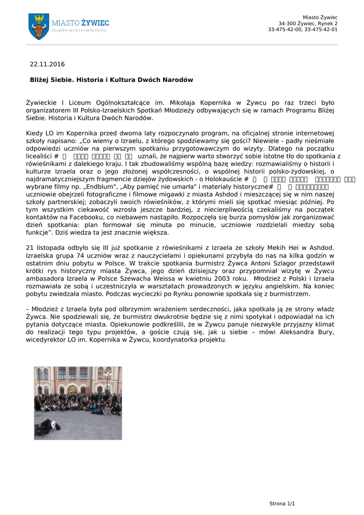 Miasto Żywiec 34-300 Żywiec, Rynek 2 33-475-42-00, 33-475-42-01 22.11.2016 Bliżej Siebie. Historia i Kultura Dwóch Narodów Żywieckie I Liceum Ogólnokształcące im. Mikołaja Kopernika w Żywcu po raz trzeci było organizatorem III Polsko-Izraelskich Spotkań Młodzieży odbywających się w ramach Programu Bliżej Siebie. Historia i Kultura Dwóch Narodów. Kiedy LO im Kopernika przed dwoma laty rozpoczynało program, na oficjalnej stronie internetowej szkoły napisano: „Co wiemy o Izraelu, z którego spodziewamy się gości? Niewiele - padły nieśmiałe odpowiedzi uczniów na pierwszym spotkaniu przygotowawczym do wizyty. Dlatego na początku licealiści #℣佐⌡⌀搀眀椀攀 欀氀愀猀礀 䤀䤀⌡⍃倣℣ uznali, że najpierw warto stworzyć sobie istotne tło do spotkania z rówieśnikami z dalekiego kraju. I tak zbudowaliśmy wspólną bazę wiedzy: rozmawialiśmy o historii i kulturze Izraela oraz o jego złożonej współczesności, o wspólnej historii polsko-żydowskiej, o najdramatyczniejszym fragmencie dziejów żydowskich - o Holokauście #℣佐⌡⌀眀 挀稀礀洀 瀀漀洀漀持Ԁ 猁䈀甁簀礁䈀礀 渀愀m wybrane filmy np. „Endblum", „Aby pamięć nie umarła" i materiały historyczne#℣䍐⌡⌀⸀ 一愀猀琁ᤀ瀀渀椀e uczniowie obejrzeli fotograficzne i filmowe migawki z miasta Ashdod i mieszczącej się w nim naszej szkoły partnerskiej; zobaczyli swoich rówieśników, z którymi mieli się spotkać miesiąc później. Po tym wszystkim ciekawość wzrosła jeszcze bardziej, z niecierpliwością czekaliśmy na początek kontaktów na Facebooku, co niebawem nastąpiło. Rozpoczęła się burza pomysłów jak zorganizować dzień spotkania: plan formował się minuta po minucie, uczniowie rozdzielali miedzy sobą funkcje”. Dziś wiedza ta jest znacznie większa. 21 listopada odbyło się III już spotkanie z rówieśnikami z Izraela ze szkoły Mekih Hei w Ashdod. Izraelska grupa 74 uczniów wraz z nauczycielami i opiekunami przybyła do nas na kilka godzin w ostatnim dniu pobytu w Polsce. W trakcie spotkania burmistrz Żywca Antoni Szlagor przedstawił krótki rys historyczny miasta Żywca, jego dzień dzisiejszy oraz przypomniał wizytę w Żywcu ambasadora Izraela w Polsce Szewacha Weissa w kwietniu 2003 roku. Młodzież z Polski i Izraela rozmawiała ze sobą i uczestniczyła w warsztatach prowadzonych w języku angielskim. Na koniec pobytu zwiedzała miasto. Podczas wycieczki po Rynku ponownie spotkała się z burmistrzem. – Młodzież z Izraela była pod olbrzymim wrażeniem serdeczności, jaka spotkała ją ze strony władz Żywca. Nie spodziewali się, że burmistrz dwukrotnie będzie się z nimi spotykał i odpowiadał na ich pytania dotyczące miasta. Opiekunowie podkreślili, że w Żywcu panuje niezwykle przyjazny klimat do realizacji tego typu projektów, a goście czują się, jak u siebie – mówi Aleksandra Bury, wicedyrektor LO im. Kopernika w Żywcu, koordynatorka projektu. Strona 1/1 Powered by TCPDF (www.tcpdf.org)