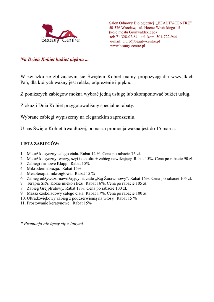 Salon Odnowy Biologicznej „BEAUTY-CENTRE” 50-376 Wrocław, ul. Hoene-Wrońskiego 15 (koło mostu Grunwaldzkiego) tel: 71 328-02-84, tel. kom. 501-722-944 e-mail: [email protected] www.beauty-centre.pl Na Dzień Kobiet bukiet piękna ... W związku ze zbliżającym się Świętem Kobiet mamy propozycję dla wszystkich Pań, dla których ważny jest relaks, odprężenie i piękno. Z poniższych zabiegów można wybrać jedną usługę lub skomponować bukiet usług. Z okazji Dnia Kobiet przygotowaliśmy specjalne rabaty. Wybrane zabiegi wypiszemy na eleganckim zaproszeniu. U nas Święto Kobiet trwa dłużej, bo nasza promocja ważna jest do 15 marca. LISTA ZABIEGÓW: 1. Masaż klasyczny całego ciała. Rabat 12 %. Cena po rabacie 75 zł. 2. Masaż klasyczny twarzy, szyi i dekoltu + zabieg nawilżający. Rabat 15%. Cena po rabacie 90 zł. 3. Zabiegi firmowe Klapp. Rabat 15% 4. Mikrodermabrazja. Rabat 15% 5. Mezoterapia mikroigłowa. Rabat 15 % 6. Zabieg odżywczo-nawilżający na ciało „Raj Żurawinowy”. Rabat 16%. Cena po rabacie 105 zł. 7. Terapia SPA. Kozie mleko i liczi. Rabat 16%. Cena po rabacie 105 zł. 8. Zabieg Grejpfrutowy. Rabat 17%. Cena po rabacie 100 zł. 9. Masaż czekoladowy całego ciała. Rabat 17%. Cena po rabacie 100 zł. 10. Ultradźwiękowy zabieg z podczerwienią na włosy. Rabat 15 % 11. Prostowanie keratynowe. Rabat 15% * Promocja nie łączy się z innymi.