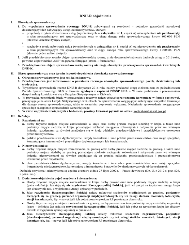 DNU-R objaśnienia I. Obowiązek sprawozdawczy 1. Do wypełnienia sprawozdania rocznego DNU-R zobowiązani są rezydenci – podmioty gospodarki narodowej dostarczający i/lub nabywający usługi od nierezydentów, których: – przychody z tytułu dostarczania usług (wymienionych w załączniku nr 1, części A) nierezydentom nie przekroczyły w roku poprzedzającym rok sprawozdawczy oraz w ciągu danego roku sprawozdawczego kwoty 800 000 PLN (słownie: osiemset tysięcy złotych) i – rozchody z tytułu nabywania usług (wymienionych w załączniku nr 1, części A) od nierezydentów nie przekroczyły w roku poprzedzającym rok sprawozdawczy oraz w ciągu danego roku sprawozdawczego kwoty 1 000 000 PLN (słownie: jeden milion złotych). 2. Jeśli przedsiębiorstwo zostało objęte sprawozdawczością roczną, a nie dostarczało/nabywało żadnych usług w 2016 roku, powinno odpowiedzieć „NIE” na pytania filtrujące (strona 1 formularza). 3. Przedsiębiorstwa objęte sprawozdawczością roczną nie mają obowiązku przekazywania sprawozdań kwartalnych DNU-K. II. Okres sprawozdawczy oraz termin i sposób dopełnienia obowiązku sprawozdawczego 1. Okresem sprawozdawczym jest rok kalendarzowy. 2. Przedsiębiorstwo jest informowane o powstaniu rocznego obowiązku sprawozdawczego pocztą elektroniczną lub tradycyjną. 3. Wypełnione sprawozdanie roczne DNU-R dotyczące 2016 roku należy przekazać drogą elektroniczną za pośrednictwem Portalu Sprawozdawczego GUS w terminie zgodnym z zapisami PBSSP 2016 r. W razie problemów z przekazaniem danych należy kontaktować się z Urzędem Statystycznym w Kielcach. 4. W przypadku popełnienia błędu w sprawozdaniu rocznym należy złożyć sprawozdanie korygujące w formie papierowej, przesyłając je na adres Urzędu Statystycznego w Kielcach. W sprawozdaniu korygującym należy ująć wszystkie transakcje dla danego okresu sprawozdawczego, także te wcześniej poprawnie wykazane. Nadesłanie sprawozdania korygującego spowoduje zastąpienie sprawozdania wcześniejszego. 5. W razie wątpliwości związanych z badaniem, prosimy kierować pytania na adres: [email protected]. III. Definicje 1. Rezydentami są: a. osoby fizyczne mające miejsce zamieszkania w kraju oraz osoby prawne mające siedzibę w kraju, a także inne podmioty mające siedzibę w kraju, posiadające zdolność zaciągania zobowiązań i nabywania praw we własnym imieniu; rezydentami są również znajdujące się w kraju oddziały, przedstawicielstwa i przedsiębiorstwa utworzone przez nierezydentów, b. polskie przedstawicielstwa dyplomatyczne, urzędy konsularne i inne polskie przedstawicielstwa oraz misje specjalne, korzystające z immunitetów i przywilejów dyplomatycznych lub konsularnych. 2. Nierezydentami są: a. osoby fizyczne mające miejsce zamieszkania za granicą oraz osoby prawne mające siedzibę za granicą, a także inne podmioty mające siedzibę za granicą, posiadające zdolność zaciągania zobowiązań i nabywania praw we własnym imieniu; nierezydentami są również znajdujące się za granicą oddziały, przedstawicielstwa i przedsiębiorstwa utworzone przez rezydentów, b. obce przedstawicielstwa dyplomatyczne, urzędy konsularne i inne obce przedstawicielstwa oraz misje specjalne i organizacje międzynarodowe, korzystające z immunitetów i przywilejów dyplomatycznych lub konsularnych. Definicje rezydenta i nierezydenta są zgodne z ustawą z dnia 27 lipca 2002 r. – Prawo dewizowe (Dz. U. z 2012 r. poz. 826, z późn. zm.). 3. Dodatkowe objaśnienia pojęć rezydenta i nierezydenta: a. Osoby fizyczne mające miejsce zamieszkania w kraju, osoby prawne oraz inne podmioty mające siedzibę w kraju (patrz – definicja 1a) stają się nierezydentami Rzeczypospolitej Polskiej, jeśli ich pobyt na terytorium innego kraju jest dłuższy niż rok, z wyjątkiem sytuacji opisanej w punkcie b. b. Jako rezydentów Rzeczypospolitej Polskiej należy traktować studentów studiujących za granicą, pacjentów leczących się za granicą, personel organizacji międzynarodowych czy też załogi statków morskich, lotniczych, stacji kosmicznych, itp. – nawet jeśli ich pobyt poza terytorium RP przekracza okres roku. c. Osoby fizyczne mające miejsce zamieszkania za granicą, osoby prawne oraz inne podmioty mające siedzibę za granicą (patrz – definicja 2a) stają się rezydentami Rzeczypospolitej Polskiej, jeśli ich pobyt na terytorium kraju jest dłuższy niż rok, z wyjątkiem sytuacji opisanej w punkcie d. d. Jako nierezydentów Rzeczypospolitej Polskiej należy traktować studentów zagranicznych, pacjentów (obcokrajowców), personel organizacji międzynarodowych czy też załogi statków morskich, lotniczych, stacji kosmicznych, itp. – nawet jeśli ich pobyt na terytorium RP przekracza okres roku. 1 4. Usługa w wymianie międzynarodowej Usługą w wymianie międzynarodowej jest usługa, w której jeden podmiot transakcji (dostarczenia/nabycia usługi) ma swoją siedzibę/miejsce zamieszkania w Polsce, natomiast drugi podmiot transakcji ma swoją siedzibę/miejsce zamieszkania za granicą, jest organizacją międzynarodową lub jednostką dyplomatyczną (ambasadą, konsulatem) obcego państwa. Nie jest istotne miejsce świadczenia usług, a fakt zawarcia transakcji pomiędzy rezydentem a nierezydentem (np. wymiana transgraniczna usług, konsumpcja usług za granicą, świadczenie usług przez osoby fizyczne na terytorium innego kraju). Należy także uwzględnić usługi świadczone między podmiotami wewnątrz grupy kapitałowej. 5. Przychody i rozchody (koszty) Definicje przychodów i rozchodów (kosztów) należy stosować zgodnie z ustawą z dnia 29 września 1994 r. o rachunkowości (Dz. U. z 2013 r. poz. 330, z późn. zm.). IV. Objaśnienia ogólne do Działu 1. Usługi dostarczone nierezydentom i Działu 2. Usługi nabyte od nierezydentów 1. Dane wykazane w formularzu dotyczące usług w wymianie międzynarodowej powinny być zgodn