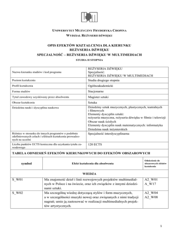 UNIWERSYTET MUZYCZNY FRYDERYKA CHOPINA WYDZIAŁ REŻYSERII DŹWIĘKU OPIS EFEKTÓW KSZTAŁCENIA DLA KIERUNKU REŻYSERIA DŹWIĘKU SPECJALNOŚĆ – REŻYSERIA DŹWIĘKU W MULTIMEDIACH STUDIA II STOPNIA Nazwa kierunku studiów i kod programu REŻYSERIA DŹWIĘKU Specjalność: REŻYSERIA DŹWIĘKU W MULTIMEDIACH Poziom kształcenia Studia drugiego stopnia Profil kształcenia Ogólnoakademicki Forma studiów Stacjonarne Tytuł zawodowy uzyskiwany przez absolwenta Magister sztuki Obszar kształcenia Sztuka Dziedzina nauki i dyscyplina naukowa Dziedziny sztuk muzycznych, plastycznych, teatralnych i filmowych Elementy dyscyplin sztuki: reżyseria muzyczna, reżyseria dźwięku w filmie i telewizji Obszar nauk ścisłych Elementy dyscyplin nauk matematycznych: informatyka Dziedzina nauk inżynierskich Specjalność interdyscyplinarna Różnice w stosunku do innych programów o podobnie zdefiniowanych celach i efektach kształcenia prowadzonych na uczelni Liczba punktów ECTS konieczna dla uzyskania tytułu zawodowego 120 ECTS TABELA ODNIESIEŃ EFEKTÓW KIERUNKOWYCH DO EFEKTÓW OBSZAROWYCH symbol Efekt kształcenia dla absolwenta Odniesienie do obszarowych efektów kształcenia WIEDZA S_W01 S_W02 Ma znajomość dzieł i linii rozwojowych projektów multimedialnych w Polsce i na świecie, oraz ich związków z innymi dziedzinami sztuki. Ma szczególną wiedzę dotyczącą stylów i form muzycznych, a w szczególności muzyki nowej oraz związanych z nimi tradycji nagrań; umie ją zastosować w realizacji multimedialnych projektów artystycznych. A2_W01 A_W17 A2_W04 A2_W08 1 S_W03 S_W04 S_W05 S_W06 S_W07 S_W08 S_W09 S_W10 S_W11 S_W12 Zna polskie i światowe osiągnięcia realizacyjne w dziedzinie kreacji warstwy dźwiękowej w formach audiowizualnych, projektach multimedialnych i interaktywnych oraz historię rozwoju wykorzystania środków komputerowych w sztuce i muzyce. Ma podstawową wiedzę dotyczącą elementów wzorców formalnych dzieła muzycznego, filmowego, multimedialnego i interaktywnego, umożliwiającą tworzenie multimedialnych prac artystycznych o wysokim stopniu oryginalności. Ma pogłębioną wiedzę z zakresu środków warsztatowych w stopniu niezbędnym do realizacji własnych projektów artystycznych, osiągniętą przez indywidualną pracę i poszukiwania. Ma szeroką wiedzę dotyczącą technologii i narzędzi stosowanych do tworzenia form multimedialnych, w tym programów komputerowych do tworzenia, nagrywania, przekształcania i edycji dźwięku i obrazu, zna języki programowania interaktywnego oraz ma świadomość rozwoju technologicznego w zakresie reżyserii dźwięku w multimediach. Zna narzędzia i technologie stosowane do prezentacji projektów multimedialnych i interaktywnych. Zna metodykę i kryteria oceny estetycznej i technicznej jakości warstwy dźwiękowej i wizualnej form multimedialnych i interaktywnych oraz stosuje je podczas realizacji własnych projektów artystycznych. Zna i rozumie związki między teoretycznymi i praktycznymi aspektami reżyserii dźwięku w multimediach oraz wykorzystuje tę wiedzę do realizacji zadań artystycznych. Zna i ma świadomość zasad funkcjonowania uregulowań prawnych dotyczących prawa własności intelektualnej i działalności medialnej. Zna zagadnienia dotyczące metodologii i organizacji procesu badawczego stosowane w rozwiązywaniu problemów artystycznych i naukowych w zakresie reżyserii dźwięku w multimediach. Zna narzędzie i technologie tworzenia projektów multimedialnych wykorzystujących możliwości i właściwości Internetu. A2_W03 A2_W09 A2_W02 A2_W10 A_W18 A2_W05 A_W22 A2_W05 A_W22 A2_W12 A2_W05 A_W24 A_W23 A_W05 A_W22 X2A_W04 UMIEJĘTNOŚCI S_U01 S_U02 S_U03 Posiada rozwiniętą osobowość artystyczną, umie tworzyć i realizować własne koncepcje artystyczne z zakresu reżyserii dźwięku w multimediach oraz dysponuje umiejętnościami potrzebnymi do ich wyrażania. Potrafi samodzielnie formułować zadanie artystyczne i podejmować decyzje odnośnie projektowania, realizacji i prezentacji dźwięku i obrazu w formach multimedialnych. Posiada swobodę w posługiwaniu się wiedzą teoretyczną, techniczną, umiejętnościami warsztatowymi i orientacją artystyczną w kontekście tworzenia własnych projektów multimedialnych. A2_U01 A2_U02 A2_U13 InzP2_U08 A2_U03 2 Jest przygotowany do pełnienia wiodącej roli w zespole twórców dzieła multimedialnego. Potrafi wyróżnić i zinterpretować wartości artystyczne dzieła multimedialnego, oraz ocenić je według kryteriów poprawności warsztatowej. Umie świadomie posługiwać się narzędziami warsztatu artystycznego, w tym programami komputerowymi, zasobami sieci i technikami komunikacji sieciowej w realizacji i prezentacji projektu multimedialnego i doskonali te umiejętności w miarę rozwoju technologicznego. Posiada umiejętność przygotowania rozbudowanych prac pisemnych i wystąpień ustnych, dotyczących zagadnień związanych z reżyserią dźwięku i z dyscyplinami pokrewnymi. Ma umiejętności językowe i potrafi posługiwać się fachową terminologią w zakresie reżyserii dźwięku i dyscyplin pokrewnych, zgodnie z wymaganiami określonymi dla poziomu B2+ Europejskiego Systemu Opisu Kształcenia Językowego. A2_U04 A_U29 S_U09 Umie dokonać publicznej prezentacji własnej pracy artystycznej. A2_U08 S_U10 Potrafi sprawnie działać w warunkach stresu i pod presją czasu, skutecznie reagować na zmieniające się warunki techniczne lub artystyczne podczas realizacji projektu multimedialnego. Potrafi dostrzec nowy problem artystyczny, badawczy lub technologiczny i poddać go profesjonalnej analizie i opracowaniu. A2_U09 S_U04 S_U05 S_U06 S_U07 S_U08 S_U11 A2_U03 A2_U05 A2_U16 A2_U06 A2_U07 A2_U06 KOMPETENCJE SPOŁECZNE Rozumie potrzebę ustawicznego kształcenia się z racji szybkiej ewolucji technologii realizacji form audytywnych i audiowizualnych, potrafi inspirować i organizować proces uczenia się innych osób. Posiada u