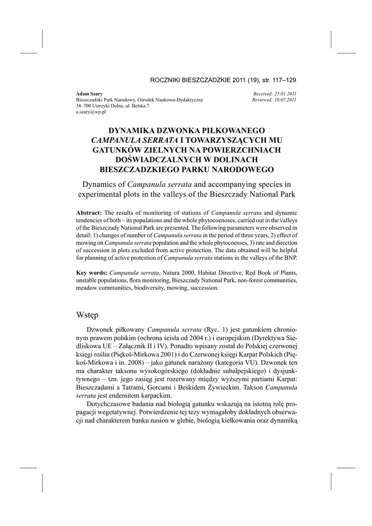 117 ROCZNIKI BIESZCZADZKIE 2011 (19), str. 117–129 Adam Szary Bieszczadzki Park Narodowy, Ośrodek Naukowo-Dydaktyczny 38–700 Ustrzyki Dolne, ul. Bełska 7 [email protected] Received: 25.01.2011 Reviewed: 18.07.2011 Dynamika dzwonka piłkowanego Campanula serrata i towarzyszących mu gatunków zielnych na powierzchniach doświadczalnych w dolinach Bieszczadzkiego Parku Narodowego Dynamics of Campanula serrata and accompanying species in experimental plots in the valleys of the Bieszczady National Park Abstract: The results of monitoring of stations of Campanula serrata and dynamic tendencies of both – its populations and the whole phytocoenoses, carried out in the valleys of the Bieszczady National Park are presented. The following parameters were observed in detail: 1) changes of number of Campanula serrata in the period of three years, 2) effect of mowing on Campanula serrata population and the whole phytocoenses, 3) rate and direction of succession in plots excluded from active protection. The data obtained will be helpful for planning of active protestion of Campanula serrata stations in the valleys of the BNP. Key words: Campanula serrata, Natura 2000, Habitat Directive, Red Book of Plants, unstable populations, flora monitoring, Bieszczady National Park, non-forest communities, meadow communities, biodiversity, mowing, succession. Wstęp Dzwonek piłkowany Campanula serrata (Ryc. 1) jest gatunkiem chronionym prawem polskim (ochrona ścisła od 2004 r.) i europejskim (Dyrektywa Siedliskowa UE – Załącznik II i IV). Ponadto wpisany został do Polskiej czerwonej księgi roślin (Piękoś-Mirkowa 2001) i do Czerwonej księgi Karpat Polskich (Piękoś-Mirkowa i in. 2008) – jako gatunek narażony (kategoria VU). Dzwonek ten ma charakter taksonu wysokogórskiego (dokładnie subalpejskiego) i dysjunktywnego – tzn. jego zasięg jest rozerwany między wyższymi partiami Karpat: Bieszczadami a Tatrami, Gorcami i Beskidem Żywieckim. Takson Campanula serrata jest endemitem karpackim. Dotychczasowe badania nad biologią gatunku wskazują na istotną rolę propagacji wegetatywnej. Potwierdzenie tej tezy wymagałoby dokładnych obserwacji nad charakterem banku nasion w glebie, biologią kiełkowania oraz dynamiką 118 ROCZNIKI BIESZCZADZKIE 2011 (19) populacji (Korzeniak 2010). Właśnie ostatnie z wymienionych zagadnień stało się celem niniejszych badań, które dodatkowo poszerzono o problematykę ekologiczną i fitosocjologiczną. Ryc. 1. Dzwonek piłkowany Campanula serrata – typowy pokrój rośliny. Fig. 1. Campanula serrata – typical appearance of plant. Cele i metody Badania prowadzono w terenie, gdzie roślinność i flora były już dokładnie rozpoznane i opisane w monografiach (Denisiuk, Korzeniak 1999; Zemanek, Winnicki 1999). Doświadczenie zostało założone metodą „split-plots”. Obserwacje populacji dzwonka piłkowanego realizowano w obrębie dwóch dużych stanowisk tego gatunku: u podnóża Tarnicy w Wołosatem i u podnóża Rawki w Berehach Górnych (Ryc. 2) – na 52 zastabilizowanych powierzchniach kwadratowych – każda 1m x 1m (Ryc. 3). Pierwszą inwentaryzację stanowisk i kartografię fitocenoz przeprowadzono w 2007 roku, ostatnią – w trzy lata później, w roku 2010. Międzyczasie prowadzono regularny zabieg koszenia na połowie założonych kwadratów (poletka zabiegowe – 26 powierzchni), wyłączając z wszelkiej ingerencji drugą połowę powierzchni (poletka kontrolne). W obrębie obydwu grup poletek dwukrotnie liczono osobniki dzwonka piłkowanego i wykonywano zdjęcia fitosocjologiczne – w dwóch seriach: w 2007 i 2010 roku. W tych samych latach, z trzyletnim przesunięciem czasowym, skartowano roślinność w otoczeniu kwadratów, wydzielając płaty na podstawie dwóch gatunków dominujących – zgodnie ze stosowaną wcześniej metodyką (Szary A. Szary — Dynamika dzwonka piłkowanego... 119 Ryc. 2. Lokalizacja powierzchni badawczych. 1 – lokalizacja poletek badawczych (w 2 grupach po 26 kwadratów w każdym z oznaczonych stanowisk), 2 – granica BdPN, 3 – granica państwa, 4 – obszary leśne, 5 – obszary nieleśne. Fig. 2. Location of sampling plots. 1 – location of sampling plots (2 groups, 26 squares in each from particular localities), 2 – boundary of the BNP, 3 – state border, 4 – forests, 5 – non forest areas. Ryc. 3. Poletka badawcze (kwadraty 1m x 1m) – kompleks powierzchni pod Rawką: pojedyncze paliki – powierzchnie zabiegowe (koszone), kwadraty ogrodzone – poletka kontrolne (niekoszone). Fig. 3. Sampling plots (squares 1m x 1m) – group of plots near Rawka: single poles – experimental plots (mowed), fenced squares – control plots (not mowed). 120 ROCZNIKI BIESZCZADZKIE 2011 (19) 2002, 2008). Po trzech latach wyniki zestawiono i porównano: liczby osobników na każdej powierzchni, tabele z procentowym pokryciem gatunków oraz mapy roślinności z płatami dominantów. Materiał porównawczy podzielono na trzy kolejno omówione rozdziały: zestawienie inwentaryzacyjne liczebności dzwonka z początku i końca prac terenowych, porównanie zdjęć fitosocjologicznych, wnioski z porównawczego zestawienia map po trzech latach prowadzonego zabiegu. Wszystkie zagadnienia prowadzono w ten sam sposób na terenie obydwu dolin – Wołosatego pod Tarnicą i Berehów pod Rawką. Kartowanie roślinności na polanach odbywało się metodą znakowania punktów odbiornikiem GPS oraz domiarów do tychże punktów za pomocą taśmy mierniczej i kompasu. Weryfikacji przestrzennej dokonywano w oparciu o zdjęcia lotnicze z 2009 roku, sporządzone na zamówienie Bieszczadzkiego Parku. Płaty roślinności wyróżniono według gatunków dominujących w obrębie poszczególnych fitocenoz: Agrostis capillaris, Deschampsia caespitosa, Poa chaixii, Nardus stricta, Festuca rubra, Achillea millefolium, Hypericum maculatum. Wyniki A) Dynamika populacji dzwonka na powierzchniach stałych (Ryc. 4). W zakresie zestawi