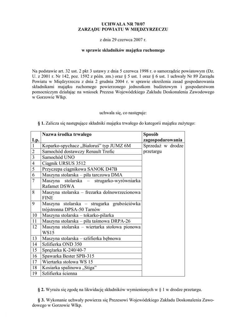 UCHWAŁA NR 70/07 ZARZĄDU POWIATU W MIĘDZYRZECZU z dnia 29 czerwca 2007 r. w sprawie składników majątku ruchomego Na podstawie art. 32 ust. 2 pkt 3 ustawy z dnia 5 czerwca 1998 r. o samorządzie powiatowym (Dz. U. z 2001 r. Nr 142, poz. 1592 z późn. zm.) oraz § 5 ust. 1 oraz § 6 ust. 1 uchwały Nr 89 Zarządu Powiatu w Międzyrzeczu z dnia 2 grudnia 2004 r. w sprawie określenia zasad gospodarowania składnikami majątku ruchomego powierzonego jednostkom budżetowym i gospodarstwom pomocniczym działając na wniosek Prezesa Wojewódzkiego Zakładu Doskonalenia Zawodowego w Gorzowie Wlkp. uchwala się, co następuje: § 1. Zalicza się następujące składniki majątku trwałego do kategorii majątku zużytego: Nazwa środka trwałego Lp. 1 2 3 4 5 6 7 8 9 10 11 12 13 14 15 16 17 18 19 Koparko-spychacz „Białoruś” typ JUMZ 6M Samochód dostawczy Renault Trofic Samochód UNO Ciągnik URSUS 3512 Przyczepa ciągnikowa SANOK D47B Maszyna stolarska – piła tarczowa DMA Maszyna stolarska – strugarko-wyrówniarka Rafamet DSWA Maszyna stolarska – frezarka dolnowrzecionowa FINE Maszyna stolarska – strugarka grubościówka trójstronna DPSA-50 Tarnów Maszyna stolarska – tokarko-pilarka Maszyna stolarska – piła taśmowa DRPA-26 Maszyna stolarska – wiertarka stołowa pionowa WS15 Maszyna stolarska – szlifierka bębnowa Szlifierka OND 350 Sprężarka K-240/40-7 Spawarka Bester SPB-315 Wiertarka stołowa WS 15 Kosiarka spalinowa „Stiga” Szlifierka ścienna Sposób zagospodarowania Sprzedaż w drodze przetargu § 2. Wyraża się zgodę na likwidację składników wymienionych w § 1 w drodze przetargu. § 3. Wykonanie uchwały powierza się Prezesowi Wojewódzkiego Zakładu Doskonalenia Zawodowego w Gorzowie Wlkp. § 4. Uchwała wchodzi w życie z dniem podjęcia. ZARZĄD: 1. Grzegorz Gabryelski 2. Grażyna Filipek 3. Wacława Kuczyńska