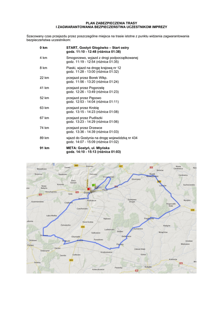 PLAN ZABEZPIECZENIA TRASY I ZAGWARANTOWANIA BEZPIECZEŃSTWA UCZESTNIKOM IMPREZY Szacowany czas przejazdu przez poszczególne miejsca na trasie istotne z punktu widzenia zagwarantowania bezpieczeństwa uczestnikom: 0 km START, Gostyń Głogówko – Start ostry godz. 11:10 - 12:48 (róŜnica 01:38) 4 km Smogorzewo, wyjazd z drogi podporządkowanej godz. 11:19 - 12:54 (róŜnica 01:35) 8 km Piaski, wjazd na drogę krajową nr 12 godz. 11:28 - 13:00 (róŜnica 01:32) 22 km przejazd przez Borek Wlkp. godz. 11:56 - 13:20 (róŜnica 01:24) 41 km przejazd przez Pogorzelę godz. 12:26 - 13:49 (róŜnica 01:23) 52 km przejazd przez Pępowo godz. 12:53 - 14:04 (róŜnica 01:11) 63 km przejazd przez Krobię godz. 13:15 - 14:23 (róŜnica 01:08) 67 km przejazd przez Pudliszki godz. 13:23 - 14:29 (róŜnica 01:06) 74 km przejazd przez Drzewce godz. 13:36 - 14:39 (róŜnica 01:03) 89 km wjazd do Gostynia na drogę wojewódzką nr 434 godz. 14:07 - 15:09 (róŜnica 01:02) 91 km META: Gostyń, ul. Młyńska godz. 14:10 - 15:13 (róŜnica 01:03) 1. Z racji przeprowadzenia zawodów w ruchu otwartym, na trasie umieszczone zostaną tablice informujące uŜytkowników dróg (kierowców) o wzmoŜonym ruchu rowerowym, zawierające następujący komunikat: „UWAGA - ZAWODY KOLARSKIE”. Tablice umieszczone zostaną pod wybranymi znakami drogowymi w kilkunastu newralgicznych miejscach. 2. Trasa zostanie oznakowania, symbolami poziomymi, umieszczonymi na asfalcie w kolorze Ŝółtym: - strzałka w lewo strzałka w prawo wykrzykniki - trójkąt skręt w lewo, skręt w prawo, zachowaj ostroŜność (przejazd kolejowy, ostry skręt, nagłe zwęŜenie drogi, gorszej jakości nawierzchnia), ustąp pierwszeństwa (droga podporządkowana). 3. Dla zagwarantowania druŜynom efektywnego finiszu, finałowy kilometr do mety na odcinku od ul. Energetyka do ul. Młyńskiej, zostanie wyłączony z ruchu i stosownie oznakowany. Czasowe wyłączenie tego fragmentu drogi w Ŝadnym znaczącym stopniu nie utrudni komunikacji w obrębie miasta. 1. Finałowe 300 metrów do mety i 200 metrów za metą zabezpieczone zostanie płotkami i taśmami. 2. KaŜdej z druŜyn na całej trasie zawodów towarzyszyć będzie motocyklista, który pełnić będzie rolę obserwatora i sędziego pomocniczego, zwiększając bezpieczeństwo przejazdu druŜyn na trasie. Wszyscy motocykliści oznakowani będą specjalnymi kamizelkami. Na trasie znajdą się takŜe dwa oznakowane wozy techniczne. Pierwszy jadący z przodu (pojazd inspekcyjny), informujący o ewentualnych problemach występujących na trasie i informujący mieszkańców o odbywającym się wyścigu. Drugi zamykający wyścig. W obu znajdą się ratownicy medyczni. Łączność pomiędzy wozami technicznymi a organizatorem (biuro zawodów) odbywać się będzie poprzez radiotelefony, a z motocyklistami poprzez telefony komórkowe. 3. Wszyscy uczestnicy poinstruowani zostaną o konieczności zachowaniu naleŜytego bezpieczeństwa i przestrzegana zasad ruchu drogowego oraz o konieczności podporządkowania się zasadom określonym w Regulaminie zawodów, w tym złoŜenia oświadczenia o zapoznaniu się z Regulaminem i znajomością przepisów o ruchu drogowym. 4. Rozmieszczenie słuŜb porządkowych i mundurowych: - - 5. O fakcie organizacji i przeprowadzeniu zawodów poinformowane zostaną słuŜby medyczne na terenie wszystkich powiatów w obrębie, których wyznaczona została trasa. Lista szpitali będących w kontakcie z organizatorem, w których moŜna uzyskać stosowną pomoc bądź informacje: - 6. na linii startu oraz finiszowym kilometrze do mety: 6 osób w wyznaczonych punktach na trasie: 24 osoby przejazdy w miejscowościach: 1. Smogorzewo, 2. Borek Wlkp., 3. Pogorzela, 4. Pępowo, 5. Krobia, 6. Pudliszki, 7. Drzewca. zabezpieczone zostaną przez Ochotniczą StraŜ PoŜarną. przejazd przez: 1. Piaski 2. Gostyń • Głogówko, • ul. Wielkopolska i Wrocławska do Energetyka zabezpieczone zostaną przez Policję i StraŜ Miejską. słuŜby poruszające się po trasie: 1. 50 motocyklistów, 2. 2 samochody inspekcyjne organizatora. Szpital im. Karola Marcinkowskiego w Gostyniu, Pl. Karola Marcinkowskiego 8/9, tel. 65 572 67 00. Szpital w Krotoszynie, ul. Młyńska 2, tel. 62 588 03 90. O utrudnieniach w ruchu drogowym, związanym z przeprowadzeniem zawodów, organizator poinformuje za pośrednictwem lokalnych środków masowego przekazu. Gostyń, ul. Młyńska: Start do rundy honorowej, Głogówko: Start ostry. Przejazd: 1,5 km Smogorzewo Skręt w prawo, wyjazd z drogi podporządkowanej Piaski Wjazd na drogę krajową nr 12 Borek Wlkp. Przejazd drogą wojewódzką nr 438, 22 km ostry i ciasny zakręt w prawo Pogorzela Na wjeździe do miasta, przejazd przez drogę z pierwszeństwem przejazdu. Pępowo Na wjeździe do miasta, przejazd przez drogę z pierwszeństwem przejazdu. Krobia Przejazd przez rynek, 63 km wjazd na rondo. Pudliszki Zjazd w kierunku Rokosowa (odcinek o nieco gorszej nawierzchni), 66,5 km ostry skręt w prawo, 67,5 km w lewo w dół. Drzewce Skręt w prawo, zjazd z drogi podporządkowanej. Gostyń ul. Wielkopolska – zjazd w dół do ul. Wrocławskiej ul. Energetyka, Nowe Wrota, Łąkowa, Młyńska – odcinek finałowy wyłączony z ruchu.