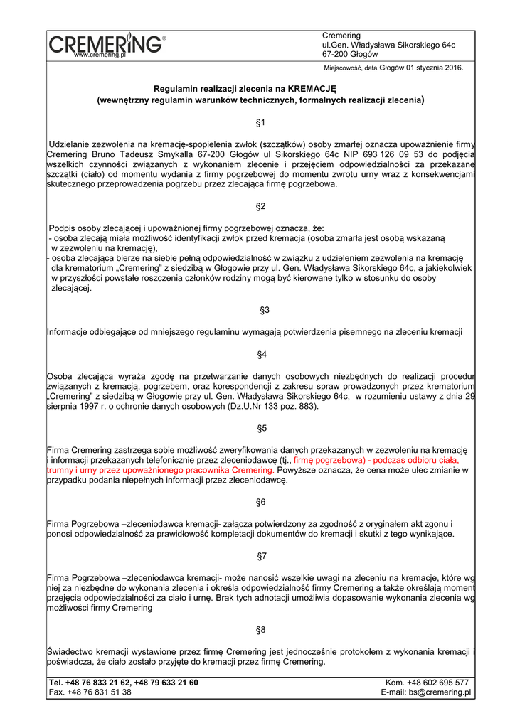 Cremering ul.Gen. Władysława Sikorskiego 64c 67-200 Głogów www.cremering.pl Miejscowość, data. Głogów 01 stycznia 2016. Regulamin realizacji zlecenia na KREMACJĘ (wewnętrzny regulamin warunków technicznych, formalnych realizacji zlecenia) §1 Udzielanie zezwolenia na kremację-spopielenia zwłok (szczątków) osoby zmarłej oznacza upoważnienie firmy Cremering Bruno Tadeusz Smykalla 67-200 Głogów ul Sikorskiego 64c NIP 693 126 09 53 do podjęcia wszelkich czynności związanych z wykonaniem zlecenie i przejęciem odpowiedzialności za przekazane szczątki (ciało) od momentu wydania z firmy pogrzebowej do momentu zwrotu urny wraz z konsekwencjami skutecznego przeprowadzenia pogrzebu przez zlecająca firmę pogrzebowa. §2 Podpis osoby zlecającej i upoważnionej firmy pogrzebowej oznacza, że: - osoba zlecają miała możliwość identyfikacji zwłok przed kremacja (osoba zmarła jest osobą wskazaną w zezwoleniu na kremację), - osoba zlecająca bierze na siebie pełną odpowiedzialność w związku z udzieleniem zezwolenia na kremację dla krematorium „Cremering” z siedzibą w Głogowie przy ul. Gen. Władysława Sikorskiego 64c, a jakiekolwiek w przyszłości powstałe roszczenia członków rodziny mogą być kierowane tylko w stosunku do osoby zlecającej. §3 Informacje odbiegające od mniejszego regulaminu wymagają potwierdzenia pisemnego na zleceniu kremacji §4 Osoba zlecająca wyraża zgodę na przetwarzanie danych osobowych niezbędnych do realizacji procedur związanych z kremacją, pogrzebem, oraz korespondencji z zakresu spraw prowadzonych przez krematorium „Cremering” z siedzibą w Głogowie przy ul. Gen. Władysława Sikorskiego 64c, w rozumieniu ustawy z dnia 29 sierpnia 1997 r. o ochronie danych osobowych (Dz.U.Nr 133 poz. 883). §5 Firma Cremering zastrzega sobie możliwość zweryfikowania danych przekazanych w zezwoleniu na kremację i informacji przekazanych telefonicznie przez zleceniodawcę (tj., firmę pogrzebowa) - podczas odbioru ciała, trumny i urny przez upoważnionego pracownika Cremering. Powyższe oznacza, że cena może ulec zmianie w przypadku podania niepełnych informacji przez zleceniodawcę. §6 Firma Pogrzebowa –zleceniodawca kremacji- załącza potwierdzony za zgodność z oryginałem akt zgonu i ponosi odpowiedzialność za prawidłowość kompletacji dokumentów do kremacji i skutki z tego wynikające. §7 Firma Pogrzebowa –zleceniodawca kremacji- może nanosić wszelkie uwagi na zleceniu na kremacje, które wg niej za niezbędne do wykonania zlecenia i określa odpowiedzialność firmy Cremering a także określają moment przejęcia odpowiedzialności za ciało i urnę. Brak tych adnotacji umożliwia dopasowanie wykonania zlecenia wg możliwości firmy Cremering §8 Świadectwo kremacji wystawione przez firmę Cremering jest jednocześnie protokołem z wykonania kremacji i poświadcza, że ciało zostało przyjęte do kremacji przez firmę Cremering. Tel. +48 76 833 21 62, +48 79 633 21 60 Fax. +48 76 831 51 38 Kom. +48 602 695 577 E-mail: [email protected]