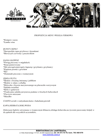 PROPOZYCJA MENU WIGILIA FIRMOWA *Kompot z suszu *Lamka wina BUFET CIEPŁY *Staropolska zupa grzybowa z łazankami *Barszczyk czerwony z pasztecikiem DANIA GŁÓWNE *Pstrąg pieczony w migdałach, *Karp panierowany *Mix pierogów(pierogów kapustą i grzybami,z grzybami,) *Kapusta postna z grochem *Ryż *Ziemniaki pieczone z rozmarynem ZIMNA PŁYTA *Śledzie z kwaśną śmietaną i jabłkiem *Śledzie w oleju z cebulką *Różyczka z łososia marynowanego na placuszku warzywnym *Sałatka tortellini *Ryba w galarecie *Tradycyjna sałatka jarzynowa podana w kruchych babeczkach *Pieczywo mieszane *Masełko CIASTO-sernik z rodzynkami,kutia z bakaliami,piernik KAWA,HERBATA,SOKI,WODA Dekoracja bufetów utrzymana w świątecznym klimacie,obsługa kelnerska,na życzenie puszczamy kolędy w tle,opłatek dla wszystkich uczestników, RESTAURACJA LASTRADA, ul. Wału Dwernickiego 117/121, 42-200 Częstochowa, tel. 34 373 10 70; kom. 793 469 979 www.lastrada.czest.pl