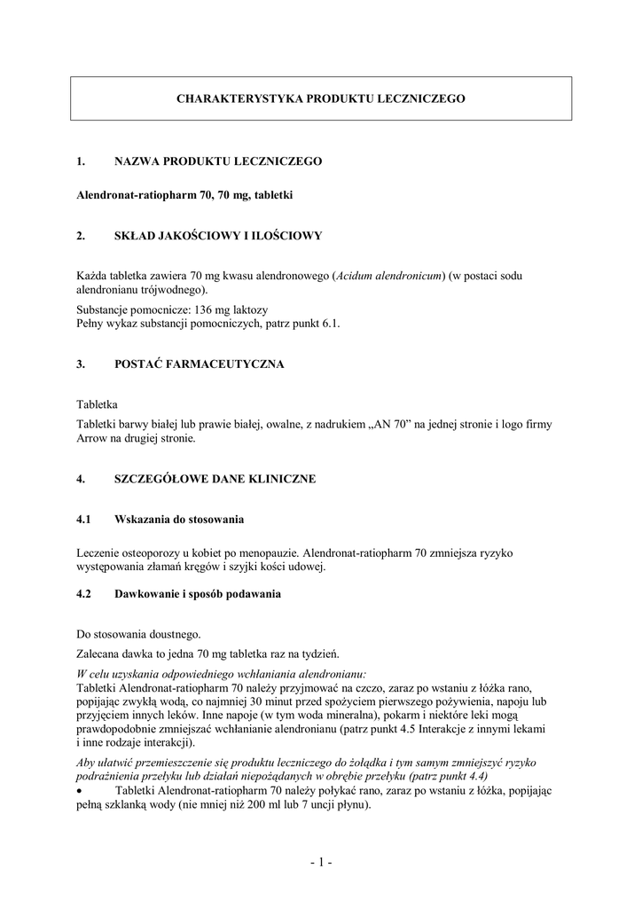 CHARAKTERYSTYKA PRODUKTU LECZNICZEGO 1. NAZWA PRODUKTU LECZNICZEGO Alendronat-ratiopharm 70, 70 mg, tabletki 2. SKŁAD JAKOŚCIOWY I ILOŚCIOWY Każda tabletka zawiera 70 mg kwasu alendronowego (Acidum alendronicum) (w postaci sodu alendronianu trójwodnego). Substancje pomocnicze: 136 mg laktozy Pełny wykaz substancji pomocniczych, patrz punkt 6.1. 3. POSTAĆ FARMACEUTYCZNA Tabletka Tabletki barwy białej lub prawie białej, owalne, z nadrukiem „AN 70” na jednej stronie i logo firmy Arrow na drugiej stronie. 4. SZCZEGÓŁOWE DANE KLINICZNE 4.1 Wskazania do stosowania Leczenie osteoporozy u kobiet po menopauzie. Alendronat-ratiopharm 70 zmniejsza ryzyko występowania złamań kręgów i szyjki kości udowej. 4.2 Dawkowanie i sposób podawania Do stosowania doustnego. Zalecana dawka to jedna 70 mg tabletka raz na tydzień. W celu uzyskania odpowiedniego wchłaniania alendronianu: Tabletki Alendronat-ratiopharm 70 należy przyjmować na czczo, zaraz po wstaniu z łóżka rano, popijając zwykłą wodą, co najmniej 30 minut przed spożyciem pierwszego pożywienia, napoju lub przyjęciem innych leków. Inne napoje (w tym woda mineralna), pokarm i niektóre leki mogą prawdopodobnie zmniejszać wchłanianie alendronianu (patrz punkt 4.5 Interakcje z innymi lekami i inne rodzaje interakcji). Aby ułatwić przemieszczenie się produktu leczniczego do żołądka i tym samym zmniejszyć ryzyko podrażnienia przełyku lub działań niepożądanych w obrębie przełyku (patrz punkt 4.4) Tabletki Alendronat-ratiopharm 70 należy połykać rano, zaraz po wstaniu z łóżka, popijając pełną szklanką wody (nie mniej niż 200 ml lub 7 uncji płynu). -1- Tabletki Alendronat-ratiopharm 70 należy połknąć w całości. Tabletek nie należy kruszyć, żuć, ssać lub przetrzymywać w jamie ustnej z powodu ryzyka wystąpienia owrzodzeń błony śluzowej jamy ustnej lub gardła. Pacjenci nie powinni kłaść się do spożycia pierwszego posiłku, który można spożyć, co najmniej 30 minut po połknięciu tabletki. Pacjenci nie powinni kłaść się przez 30 minut po przyjęciu tabletek Alendronat-ratiopharm 70. Tabletki Alendronat-ratiopharm 70 nie należy przyjmować przed położeniem się spać lub rano, przed wstaniem z łóżka. Pacjenci powinni przyjmować preparaty wapnia i witaminy D w przypadku nieodpowiedniej diety (patrz punkt 4.4). Stosowanie u pacjentów w podeszłym wieku W badaniach klinicznych nie stwierdzono związanych z wiekiem różnic dotyczących profilu skuteczności i bezpieczeństwa alendronianu. W związku z tym zmiana dawkowania nie jest konieczna u pacjentów w podeszłym wieku. Stosowanie u pacjentów z zaburzeniami czynności nerek Zmiana dawkowania nie jest konieczna u pacjentów, u których wskaźnik przesączania kłębuszkowego (ang. GFR) jest większy niż 35 ml/min. Alendronian nie jest zalecany u pacjentów z ciężkimi zaburzeniami czynności nerek, u których wartość GFR jest mniejsza niż 35 ml/min ze względu na brak odpowiednich badań klinicznych. Stosowanie u pacjentów z zaburzeniami czynności wątroby Zmiana dawkowania nie jest konieczna. Stosowanie u dzieci (poniżej 18 lat): Alendronian był badany na małej grupie pacjentów z wrodzoną łamliwością kości (osteogenesis imperfecta) poniżej 18 lat . Badania są niewystarczające aby można było stosować produkt leczniczy u dzieci. Nie ma danych klinicznych dotyczących stosowania Alendronat-ratiopharm 70 w leczeniu osteoporozy wywołanej glikokortykosteroidami. 4.3 Przeciwwskazania Choroby przełyku i (lub) inne patologie opóźniające proces opróżniania przełyku, takie jak zwężenie lub achalazja. Niemożność utrzymania pozycji stojącej lub siedzącej, przez co najmniej 30 minut. Nadwrażliwość na alendronian, inne bisfosfoniany lub którykolwiek ze składników produktu leczniczego. Hipokalcemia. Patrz również punkt 4.4. 4.4 Specjalne ostrzeżenia i środki ostrożności dotyczące stosowania Alendronian może powodować miejscowe podrażnienie błony śluzowej górnego odcinka przewodu pokarmowego. Z powodu ryzyka zaostrzenia choroby podstawowej należy zachować ostrożność podczas stosowania alendronianu u pacjentów z czynnymi schorzeniami górnego odcinka przewodu pokarmowego, takimi jak trudności w połykaniu, choroby przełyku, zapalenie błony śluzowej żołądka lub dwunastnicy, choroba wrzodowa, bądź w przypadku niedawno przebytych (w ciągu ostatniego roku) ciężkich chorób przewodu pokarmowego, takich jak owrzodzenie żołądka, czynne krwawienie lub zabieg chirurgiczny w obrębie górnego odcinka przewodu pokarmowego z wyjątkiem plastyki wpustu żołądka (patrz punkt 4.3). U pacjentów, u których stwierdzono przełyk Barretta lekarz -2- powinien rozważyć korzyści i możliwe ryzyko z zastosowania alendronianiu na podstawie indywidualnej oceny pacjenta. Działania niepożądane w obrębie przełyku (w niektórych przypadkach ciężkie i wymagające leczenia szpitalnego) takie jak: zapalenie, owrzodzenia lub nadżerki, w rzadkich przypadkach prowadzące do zwężenia przełyku, obserwowano u pacjentów stosujących alendronian. Lekarz dlatego powinien obserwować, czy występują u pacjenta jakiekolwiek objawy (przedmiotowe i podmiotowe), które mogą świadczyć o wystąpieniu działań niepożądanych w obrębie przełyku. Należy pouczyć pacjenta o konieczności przerwania leczenia alendronianem i skontaktowania się z lekarzem w przypadku wystąpienia objawów podrażnienia przełyku, takich jak trudności lub ból podczas połykania, ból zamostkowy lub pojawienie się lub nasilenie zgagi. Ryzyko wystąpienia ciężkich działań niepożądanych dotyczących przełyku wydaje się większe u pacjentów, którzy nie stosują alendronianu w sposób prawidłowy i (lub) kontynuują leczenie alendronianem pomimo wystąpienia objawów podrażnienia przełyku. Jest bardzo ważne, aby pacjent otrzymał wszystkie zalecenia dotyczące stosowania produktu lec