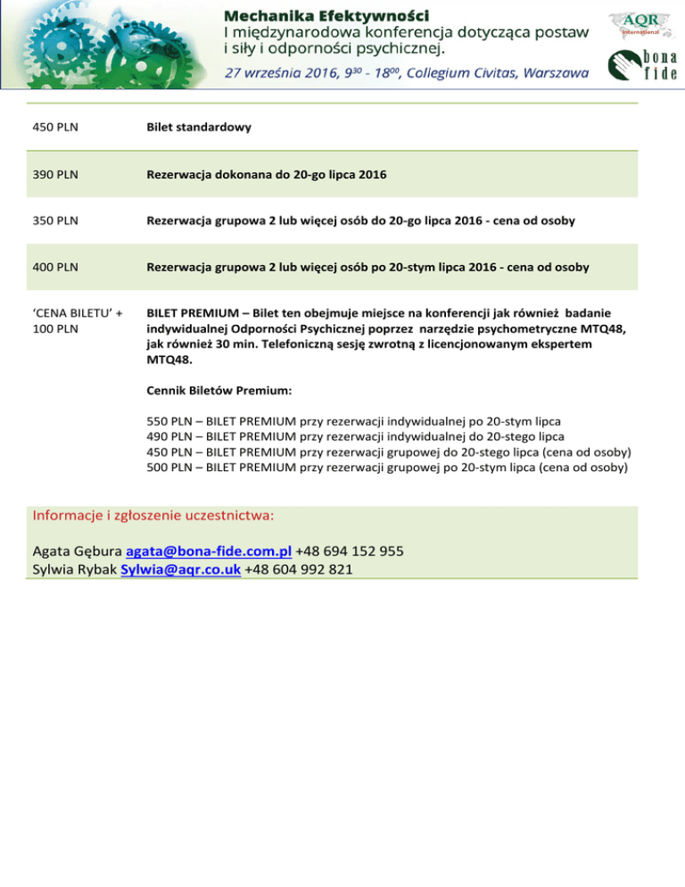 450 PLN Bilet standardowy 390 PLN Rezerwacja dokonana do 20-go lipca 2016 350 PLN Rezerwacja grupowa 2 lub więcej osób do 20-go lipca 2016 - cena od osoby 400 PLN Rezerwacja grupowa 2 lub więcej osób po 20-stym lipca 2016 - cena od osoby ‘CENA BILETU’ + 100 PLN BILET PREMIUM – Bilet ten obejmuje miejsce na konferencji jak również badanie indywidualnej Odporności Psychicznej poprzez narzędzie psychometryczne MTQ48, jak również 30 min. Telefoniczną sesję zwrotną z licencjonowanym ekspertem MTQ48. Cennik Biletów Premium: 550 PLN – BILET PREMIUM przy rezerwacji indywidualnej po 20-stym lipca 490 PLN – BILET PREMIUM przy rezerwacji indywidualnej do 20-stego lipca 450 PLN – BILET PREMIUM przy rezerwacji grupowej do 20-stego lipca (cena od osoby) 500 PLN – BILET PREMIUM przy rezerwacji grupowej po 20-stym lipca (cena od osoby) Informacje i zgłoszenie uczestnictwa: Agata Gębura [email protected] +48 694 152 955 Sylwia Rybak [email protected] +48 604 992 821