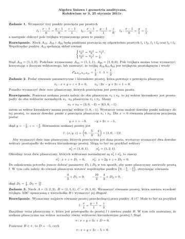 Algebra liniowa i geometria analityczna, Kolokwium nr 3, 25 stycznia 2011r. Zadanie 1. Wyznaczyć trzy punkty przecięcia par prostych x−1 y−1 z−1 x−1 y−1 z l1 : = = , l2 : = = , 0 0 1 0 1 0 a następnie obliczyć pole trójkąta wyznaczonego przez te punkty. l3 : x−1 y z = = , 0 1 1 Rozwiązanie. Niech A12 , A13 i A23 będą punktami przecięcia się odpowiednio prostych l1 i l2 , l1 i l3 oraz l2 i l3 . Współrzędne punktu A12 spełniają układ równań ( x−1 0 x−1 0 = = y−1 0 y−1 1 = z−1 1 , z = 0. Stąd A12 = (1, 1, 0). Podobnie wyznaczamy A13 = (1, 1, 1), A23 = (1, 0, 0). Pole trójkąta można teraz wyznaczyć, korzystając z iloczynu wektorowego, lub zauważyć, że trójką A12 A13 A23 jest trójkątem prostokątnym i wtedy 1 1 P∆A12 A13 A23 = · 1 · 1 = . 2 2 Zadanie 2. Podać równanie parametryczne i kierunkowe prostej, która powstaje z przecięcia płaszczyzn π1 : x + y + z + 3 = 0, π2 : 2x − y + 2z + 1 = 0. Ponadto wyznaczyć dwie inne płaszczyzny, których przecięciem jest powyższa prosta. Rozwiązanie. Ponieważ szukana prosta należy do obu płaszczyzn π1 i π2 , to jej wektor kierunkowy jest prostopadły do obu wektorów normalnych n1 , n2 płaszczyzn π1 i π2 . Mamy n1 × n2 = (3, 0, −3) = 3(1, 0, −1). zatem za wektor kierunkowy można przyjąć wektor (1, 0, −1). Wystarczy teraz znaleźć dowolny punkt należący do tej prostej, to znaczy dowolny punkt z przecięcia płaszczyzn π1 i π2 . Dla x = 0 równania płaszczyzn przyjmują postać y + z = −3, −y + 2z = −1, skąd y = − 35 , z = − 34 . Równaniem szukanej prostej jest 5 4 l : (x, y, z) = 0, − , − + (1, 0, −1)t. 3 3 Aby wyznaczyć dwie inne płaszczyzny, których przecięciem jest dana prosta, wystarczy wyznaczyć dwa dowolne wektory prostopadłe do wektora kierunkowego prostej. Mogą to być na przykład wektory n01 = (1, 0, 1), n02 = (1, 2, 1). Określmy teraz dwie płaszczyzny, których wektorami normalnymi są n01 i n02 , to znaczy π10 : x + z + D1 = 0, π20 : x + 2y + z + D2 = 0. Do zakończenia potrzeba jeszcze dobrać parametry D1 i D2 w ten sposób, aby nowe płaszczyzny zawierały prostą 5 4 l. W tym calu należy do równań płaszczyzn wstawić współrzędne punktu 0, − 3 , − 3 , otrzymując równania 4 − + D1 = 0, 3 skąd D1 = 43 , D2 = − 10 4 − + D2 = 0, 3 3 14 3 . Zadanie 3. Niech A = (1, 2, 3), B = (1, 1, 1), C = (0, 1, 0). Wyznaczyć równanie prostej, która zawiera wysokość trójkąta ABC opuszczoną z wierzchołka B i wyznaczyć jej długość. Rozwiązanie. Wyznaczmy najpierw równanie prostej przechodzącej przez punkty A i C. Może to być na przykład x y−1 z l: = = . 1 1 3 Znajdźmy teraz płaszczyznę π, która jest prostopadła do prostej l i zawiera punkt B. W tym celu zauważmy, że szukana płaszczyzna ma wektor normalny równy wektorowi kierunkowemu prostej l. Stąd π : x + y + 3z + D = 0. Ponieważ B ∈ π, to D = −5, czyli π : x + y + 3z − 5 = 0. Wystarczy teraz znaleźć punkt przecięcia prostej l i płaszczyzny π. Prosta l ma równanie parametryczne l: x = t, y = 1 + t, z = 3t. Zatem po wstawieniu do równania płaszczyzny, otrzymujemy 11t − 4 = 0, skąd t = 4 11 . Szukanym punktem l ∩ π jest 4 15 12 11 , 11 , 11 . Zatem prosta zawierająca wysokość trójkąta ABC opusz- czoną z wierzchołka B jest prostą przechodzącą przez punkt B oraz 4 15 12 11 , 11 , 11 , to znaczy 7 −4 −1 t. , , 11 11 11 Długość wysokości jest oczywiście równa odległości powyższych punktów. (x, y, z) = (1, 1, 1) + Zadanie 4. Wyznaczyć punkt na prostej l: x y+7 z−1 = = , 1 2 1 który leży najbliżej punktu (3, 2, 6). Rozwiązanie. Uwaga. Zadanie to można rozwiązać niemal identycznie jak zadanie 3. Można również posłużyć się iloczynem skalarnym wektorów aby wyznaczyć rzut punktu (3, 2, 6) na prostą l. 13 5 16 Szukanym punktem jest 3 , 3 , 3 . Zadanie 5. Przez punkt przecięcia płaszczyzny π :x+y+z−1=0 z prostą l: x = t, y = 1, z = −1, poprowadzić prostą, która leży w płaszczyźnie π i jest prostopadła do prostej l. Rozwiązanie. Wektor kierunkowy v szukanej prostej musi być prostopadły do wektora normalnego płaszczyzny π oraz do wektora kierunkowego prostej l. Stąd v = (1, 1, 1) × (1, 0, 0) = (0, 1, −1). Wystarczy jeszcze znaleźć punkt przecięcia płaszczyzny π prostą l. Wstawiając równania parametryczne prostej do równania płaszczyzny, otrzymujemy t − 1 = 0. Zatem t = 1 i π ∩ l = (1, 1, −1), co oznacza, że szukaną prostą jest x = 1, y = 1 + t, z = −1 − t.