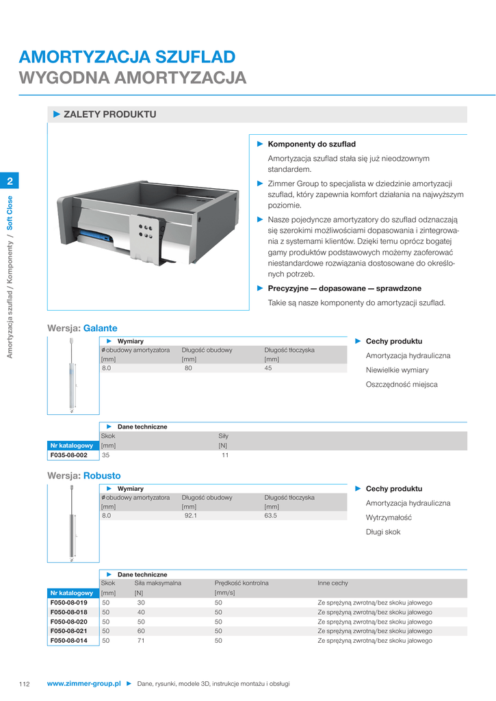 AMORTYZACJA SZUFLAD WYGODNA AMORTYZACJA ►►ZALETY PRODUKTU ►► Komponenty do szuflad Amortyzacja szuflad stała się już nieodzownym standardem. 2 Amortyzacja szuflad / Komponenty / Soft Close ►► Zimmer Group to specjalista w dziedzinie amortyzacji szuflad, który zapewnia komfort działania na najwyższym poziomie. ►► Nasze pojedyncze amortyzatory do szuflad odznaczają się szerokimi możliwościami dopasowania i zintegrowania z systemami klientów. Dzięki temu oprócz bogatej gamy produktów podstawowych możemy zaoferować niestandardowe rozwiązania dostosowane do określonych potrzeb. ►► Precyzyjne — dopasowane — sprawdzone Takie są nasze komponenty do amortyzacji szuflad. Wersja: Galante ►► Wymiary ∅ obudowy amortyzatora [mm] 8.0 Długość obudowy [mm] 80 ►► Cechy produktu Długość tłoczyska [mm] 45 Amortyzacja hydrauliczna Niewielkie wymiary Oszczędność miejsca Nr katalogowy F035-08-002 ►► Dane techniczne Skok [mm] 35 Siły [N] 11 Wersja: Robusto ►► Wymiary ∅ obudowy amortyzatora [mm] 8.0 Długość obudowy [mm] 92.1 ►► Cechy produktu Długość tłoczyska [mm] 63.5 Amortyzacja hydrauliczna Wytrzymałość Długi skok Nr katalogowy F050-08-019 F050-08-018 F050-08-020 F050-08-021 F050-08-014 112 ►► Dane techniczne Skok Siła maksymalna [mm] 50 50 50 50 50 [N] 30 40 50 60 71 Prędkość kontrolna [mm/s] 50 50 50 50 50 www.zimmer-group.pl ► Dane, rysunki, modele 3D, instrukcje montażu i obsługi Inne cechy Ze sprężyną zwrotną/bez skoku jałowego Ze sprężyną zwrotną/bez skoku jałowego Ze sprężyną zwrotną/bez skoku jałowego Ze sprężyną zwrotną/bez skoku jałowego Ze sprężyną zwrotną/bez skoku jałowego Wersja: Piccolo ►► Wymiary ∅ obudowy amortyzatora [mm] 9.2 ►► Cechy produktu Długość obudowy [mm] 68 Amortyzacja pneumatyczna Małe wymiary Trwałość [mm] 35 Głowica cylindryczna Masa do wyhamowania Skok jałowy [kg] 15 Tak Wbudowany kanał Materiał tłoczyska sprężyny Nie Wersja: Calmo ►► Wymiary ∅ obudowy amortyzatora [mm] 10.4 Amortyzacja szuflad / Komponenty / Soft Close Nr katalogowy A035-09-019 ►► Dane techniczne Skok Kształt głowicy/połączenie 2 Tworzywo sztuczne ►► Cechy produktu Długość obudowy [mm] 69.6 Amortyzacja pneumatyczna Łatwy montaż Wygodne użytkowanie ►► Dane techniczne Skok Kształt głowicy/połączenie Nr katalogowy [mm] A042-10-006 42 Głowica tulejowa, śr. wewn. = 4 mm, śr. zewn. = 7 mm A042-10-011 42 Głowica magnetyczna z magnesem A042-10-012 A042-10-014 A042-10-016 A042-10-020 Masa do wyhamowania [kg] Skok jałowy Wbudowany kanał sprężyny Materiał tłoczyska Inne cechy 20 Tak Nie Stal Bez kołnierza (krótszy) 20 Tak Nie Stal 42 42 42 Stalowe tłoczysko 1,5 mm bez głowicy 20 Głowica magnetyczna z magnesem 20 Głowica magnetyczna z magnesem 20 Tak Tak Tak Nie Nie Nie Stal Stal Stal Bez kołnierza (krótszy) odpowiedni do kontaktu z żywnością 42 Głowica magnetyczna z magnesem 20 Tak Nie Stal Wersja: Bajo ►► Wymiary ∅ obudowy amortyzatora [mm] 10.4 Bez kołnierza (krótszy) Głowica magnetyczna sfazowana ►► Cechy produktu Długość obudowy [mm] 78.1 Amortyzacja pneumatyczna Prostota Uniwersalność Siła ►► Dane techniczne Skok Kształt głowicy/połączenie Nr katalogowy A048-10-000 [mm] 48 Głowica kulowa Masa do wyha- Skok mowania jałowy [kg] 25 Tak A048-10-006 48 Głowica kulowa 25 A048-10-008 A048-10-009 A048-10-010 48 48 48 Tłoczysko kątowe 90° 25 Tak Nie Stal Głowica magnetyczna z magnesem 25 Tak Nie Stal Stalowe tłoczysko 1,5 mm bez głowicy 25 Tak Nie Stal Dane, rysunki, modele 3D, instrukcje montażu i obsługi ◄ www.zimmer-group.pl Tak Wbudowany kanał sprężyny Materiał tłoczyska Nie Stal Nie Stal Inne cechy Odpowiedni do kontaktu z żywnością 113 AMORTYZACJA SZUFLAD WYGODNA AMORTYZACJA Wersja: Placido ►► Wymiary ∅ obudowy amortyzatora [mm] 10.4 ►► Cechy produktu Długość obudowy [mm] 95.5 Amortyzacja pneumatyczna Miękkość Trwałość Amortyzacja szuflad / Komponenty / Soft Close 2 Nr katalogowy A050-10-001 A050-10-002 A050-10-022 114 ►► Dane techniczne Skok Kształt głowicy/połączenie [mm] 50 50 50 Głowica kulowa Głowica cylindryczna Głowica kulowa Masa do wyhamowania Skok jałowy [kg] 25 25 25 Tak Tak Tak www.zimmer-group.pl ► Dane, rysunki, modele 3D, instrukcje montażu i obsługi Wbudowany kanał Materiał tłoczyska sprężyny Tak Tak Tak Tworzywo sztuczne Tworzywo sztuczne Stal
