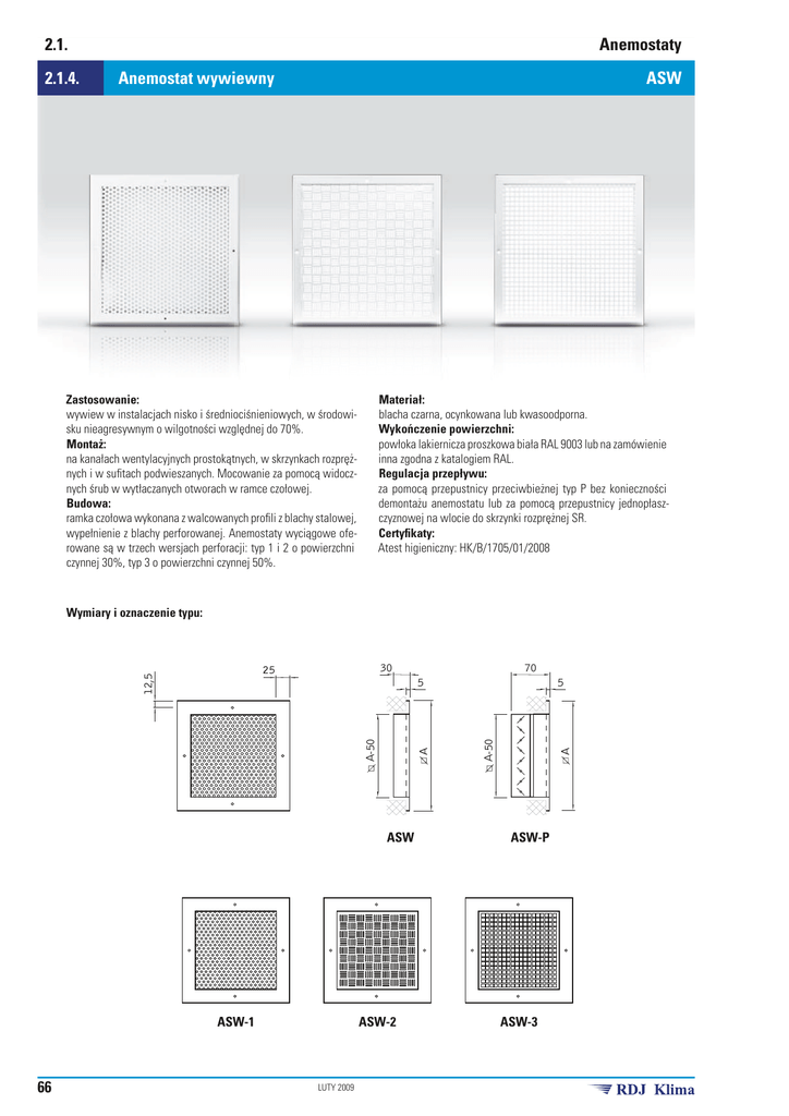 2.1. 2.1.4. Anemostaty Anemostat wywiewny ASW Zastosowanie: wywiew w instalacjach nisko i średniociśnieniowych, w środowisku nieagresywnym o wilgotności względnej do 70%. Montaż: na kanałach wentylacyjnych prostokątnych, w skrzynkach rozprężnych i w sufitach podwieszanych. Mocowanie za pomocą widocznych śrub w wytłaczanych otworach w ramce czołowej. Budowa: ramka czołowa wykonana z walcowanych profili z blachy stalowej, wypełnienie z blachy perforowanej. Anemostaty wyciągowe oferowane są w trzech wersjach perforacji: typ 1 i 2 o powierzchni czynnej 30%, typ 3 o powierzchni czynnej 50%. Materiał: blacha czarna, ocynkowana lub kwasoodporna. Wykończenie powierzchni: powłoka lakiernicza proszkowa biała RAL 9003 lub na zamówienie inna zgodna z katalogiem RAL. Regulacja przepływu: za pomocą przepustnicy przeciwbieżnej typ P bez konieczności demontażu anemostatu lub za pomocą przepustnicy jednopłaszczyznowej na wlocie do skrzynki rozprężnej SR. Certyfikaty: Atest higieniczny: HK/B/1705/01/2008 Wymiary i oznaczenie typu: 12,5 30 ASW-1 ASW-2 LUTY 2009 5 A-50 A-50 ASW 66 70 5 ASW-P ASW-3 2.1. 2.1.5. Anemostaty Anemostat wywiewny kasetonowy Zastosowanie: wywiew w instalacjach nisko i średniociśnieniowych, w środowisku nieagresywnym o wilgotności względnej do 70%. Montaż: na kanałach wentylacyjnych prostokątnych, w skrzynkach rozprężnych i w sufitach podwieszanych. Mocowanie za pomocą widocznych śrub w wytłaczanych otworach w ramce czołowej. Budowa: ramka czołowa wykonana z walcowanych profili z blachy stalowej, panel czołowy z blachy perforowanej. Anemostaty wyciągowe oferowane są w trzech wersjach perforacji: typ 1 i 2 o powierzchni czynnej 30%, typ 3 o powierzchni czynnej 50%. ASW-K Materiał: blacha czarna, ocynkowana lub kwasoodporna. Wykończenie powierzchni: powłoka lakiernicza proszkowa biała RAL 9003 lub na zamówienie inna zgodna z katalogiem RAL. Regulacja przepływu: za pomocą przepustnicy przeciwbieżnej typ P bez konieczności demontażu anemostatu lub za pomocą przepustnicy jednopłaszczyznowej na wlocie do skrzynki rozprężnej SR. Certyfikaty: Atest higieniczny: HK/B/1705/01/2008 Wymiary i oznaczenie typu: 50 90 6 595 A-50 595 A-50 6 6 A 6 595 ASW-K LUTY 2009 ASW-K-P 67 Anemostaty - dane techniczne Diagram doboru dla anemostatów wywiewnych ASW max. prędkość powietrza (m/s) w zasięgu L (m) od osi 68 wielkość strumienia przepływu (m³/h) LUTY 2009 Anemostaty - dane techniczne Instrukcja korzystania z diagramu doboru dla anemostatów wywiewnych ASW max. prędkość powietrza (m/s) w zasięgu L (m) od osi wielkość strumienia przepływu (m³/h) Przykład korzystania z diagramu doboru: Dane: – wydatek 300 m³/h (l. czerwona) – prędkość przepływu 0,25 m/s w zasięgu L=1,5 m (l. niebieska) Odczyt z diagramu: – wielkość anemostatu 498x498 (l. żółta) – prędkość wypływu 3,5 m/s (l. pomarańczowa) LUTY 2009 69