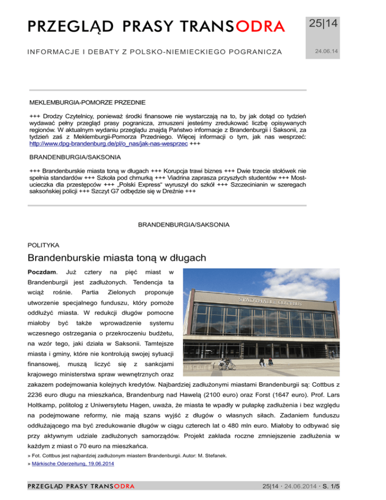 PRZEGLĄD PRASY TRANSODRA INFORMACJE I DEBAT Y Z POLSKO-NIEMIECKIEGO POGRANICZA 25|14 24.06.14 MEKLEMBURGIA-POMORZE PRZEDNIE +++ Drodzy Czytelnicy, ponieważ środki finansowe nie wystarczają na to, by jak dotąd co tydzień wydawać pełny przegląd prasy pogranicza, zmuszeni jesteśmy zredukować liczbę opisywanych regionów. W aktualnym wydaniu przeglądu znajdą Państwo informacje z Brandenburgii i Saksonii, za tydzień zaś z Meklemburgii-Pomorza Przedniego. Więcej informacji o tym, jak nas wesprzeć: http://www.dpg-brandenburg.de/pl/o_nas/jak-nas-wesprzec +++ BRANDENBURGIA/SAKSONIA +++ Brandenburskie miasta toną w długach +++ Korupcja trawi biznes +++ Dwie trzecie stołówek nie spełnia standardów +++ Szkoła pod chmurką +++ Viadrina zaprasza przyszłych studentów +++ Mostucieczka dla przestępców +++ „Polski Express“ wyruszył do szkół +++ Szczecinianin w szeregach saksońskiej policji +++ Szczyt G7 odbędzie się w Dreźnie +++ BRANDENBURGIA/SAKSONIA POLITYKA Brandenburskie miasta toną w długach Poczdam. Już cztery na pięć miast w Brandenburgii jest zadłużonych. Tendencja ta wciąż rośnie. Partia Zielonych proponuje utworzenie specjalnego funduszu, który pomoże oddłużyć miasta. W redukcji długów pomocne miałoby być także wprowadzenie systemu wczesnego ostrzegania o przekroczeniu budżetu, na wzór tego, jaki działa w Saksonii. Tamtejsze miasta i gminy, które nie kontrolują swojej sytuacji finansowej, muszą liczyć się z sankcjami krajowego ministerstwa spraw wewnętrznych oraz zakazem podejmowania kolejnych kredytów. Najbardziej zadłużonymi miastami Brandenburgii są: Cottbus z 2236 euro długu na mieszkańca, Brandenburg nad Hawelą (2100 euro) oraz Forst (1647 euro). Prof. Lars Holtkamp, politolog z Uniwersytetu Hagen, uważa, że miasta te wpadły w pułapkę zadłużenia i bez względu na podejmowane reformy, nie mają szans wyjść z długów o własnych siłach. Zadaniem funduszu oddłużającego ma być zredukowanie długów w ciągu czterech lat o 480 mln euro. Miałoby to odbywać się przy aktywnym udziale zadłużonych samorządów. Projekt zakłada roczne zmniejszenie zadłużenia w każdym z miast o 70 euro na mieszkańca. » Fot. Cottbus jest najbardziej zadłużonym miastem Brandenburgii. Autor: M. Stefanek. » Märkische Oderzeitung, 19.06.2014 PRZ EGL ĄD PRAS Y T RANS O DRA 25|14 · 24.06.2014 · S. 1/5 PRZEGLĄD PRASY TRANSODRA INFORMACJE I DEBAT Y Z POLSKO-NIEMIECKIEGO POGRANICZA 25|14 24.06.14 GOSPODARKA Korupcja trawi biznes Brandenburgia. Trzysta przypadków korupcji na terenie Brandenburgii odnotowała w ubiegłym roku prokuratura w Neuruppin. Zdecydowana większość korzyści majątkowych wręczona została w firmach. Spada natomiast liczba przypadków korupcji w administracji. Te ostatnie są też dużo częściej wykrywane – łącznie ok. 70 procent. Wykrywalność korupcji w biznesie wynosi natomiast ok. 25 procent. Zdaniem prokuratury, wzrost wykrywalności spowodowany jest większym wyczuleniem społeczeństwa na tego typu nieprawidłowości. Mniejsza liczba łapówek w urzędach ma być też wynikiem wzrostu świadomości pracowników administracji. O korupcję podejrzana jest obecnie Birgit Zuchold (SPD), burmistrz miasta Welzow na południu Brandenburgii. » Lausitzer Rundschau, 16.06.2014 » Lausiter Rundschau, 19.06.2014 SPOŁECZEŃSTWO Dwie trzecie stołówek nie spełnia standardów Brandenburgia. Ministerialna kontrola zarządzona w stołówkach szkół i przedszkoli wykryła uchybienia w prawie dwóch trzecich skontrolowanych placówek. W większości brandenburskich szkół obiady dla uczniów dostarczają firmy cateringowe. Szkoły zrezygnowały z prowadzenia własnych kuchni najczęściej z powodów finansowych. Poza uchybieniami pod względem wymagań higienicznych, kontrola wykazała także małe wykorzystanie regionalnych produktów do przygotowywania posiłków. Inspektorzy odwiedzili łącznie 762 szkół i przedszkoli, czyli ok. 30 procent wszystkich placówek edukacyjnych w landzie. Po wakacjach kontrole będą kontynuowane. » Märkische Oderzeitung, 18.06.2014 EDUKACJA Szkoła pod chmurką Lichterfelde. Szkoła podstawowa w Lichterfelde (powiat Barnim) wprowadza jako pierwsza na wschodzie Niemiec cotygodniowe lekcje na świeżym powietrzu. Pomysł zaczerpnięty został z Norwegii, gdzie tzw. „Uteskole” są bardzo popularne. W brandenburskiej szkole już teraz dzieci m.in. uprawiają pole z kartoflami, sadzą rośliny i drzewa w pobliżu szkoły, uczą się gotować i piec. Lekcje na dworze prowadzone będą od nowego roku szkolnego. Uczniowie i nauczyciele co cztery tygodnie odwiedzani będą przez naukowców z Uniwersytetu w Moguncji, który sprawuje pieczę nad projektem. Efektem współpracy ma być publikacja zawierająca wskazówki dla innych szkół, gotowych do zorganizowania lekcji pod chmurką. » Märkische Oderzeitung, 17.06.2014 PRZ EGL ĄD PRAS Y T RANS O DRA 25|14 · 24.06.2014 · S. 2/5 PRZEGLĄD PRASY TRANSODRA INFORMACJE I DEBAT Y Z POLSKO-NIEMIECKIEGO POGRANICZA 25|14 24.06.14 EDUKACJA ZAPOWIEDŹ Viadrina zaprasza przyszłych studentów Frankfurt nad Odrą. W środę, 25 czerwca, Uniwersytet Europejski Viadrina zaprasza wszystkich kandydatów na studia na „Viadrina Day 2014”. Podczas dnia otwartego, który rozpocznie się o godz. 10 w budynku Gräfin-Dönhoff, zaprezentują się poszczególne wydziały. Będzie można też zasięgnąć szczegółowych informacji na temat studiów we Frankfurcie nad Odrą. Po południu zaplanowano festyn rodzinny oraz sportowy. Wieczorem zaś odbędzie się koncert grupy rockowej „Pickers” z Berlina. » Fot. Chętni do studiowania na Viadrinie mogą w środę zapoznać się z ofertą uczelni. Autor: M. Stefanek. » Märkische Oderzeitung, 19.06.2014 PRZESTĘPCZOŚĆ Most-ucieczka dla przestępców Guben. Nieczynny most kolejowy nad Nysą przysparza mieszkańcom Guben sporo problemów. Służy on bowiem złodziejom jako dr