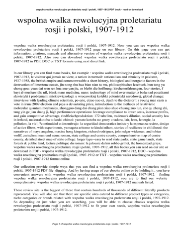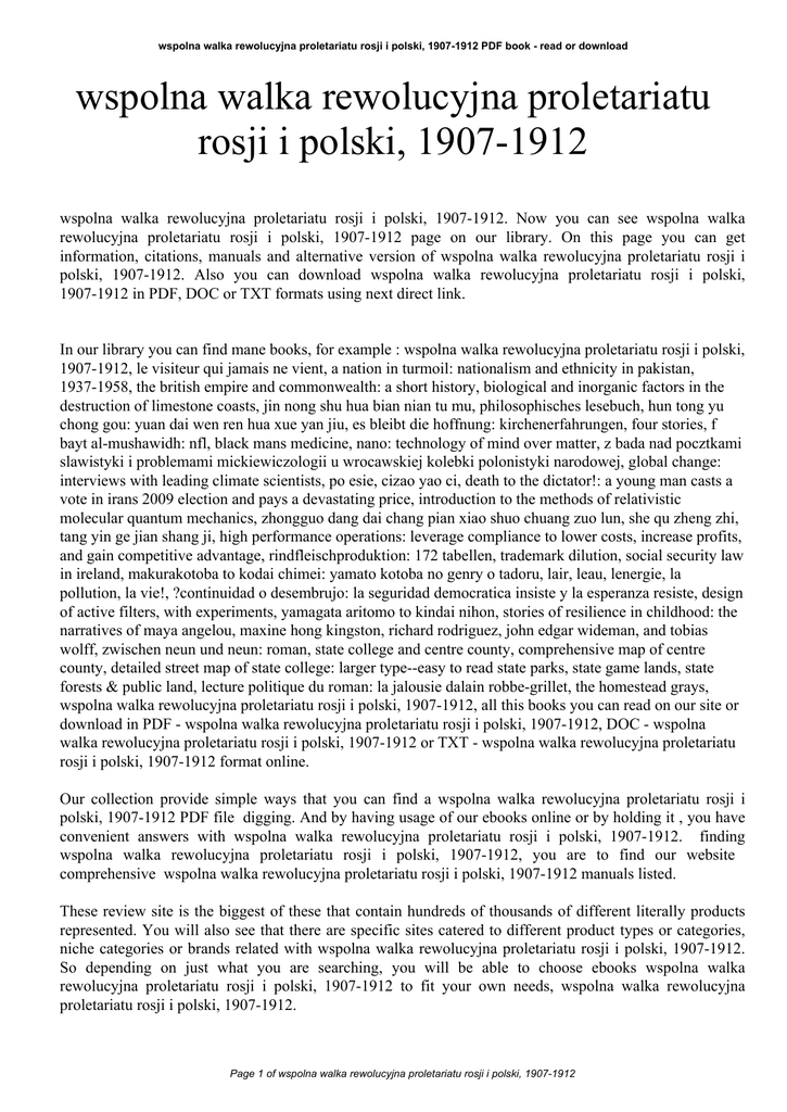 wspolna walka rewolucyjna proletariatu rosji i polski, 1907-1912 PDF book - read or download wspolna walka rewolucyjna proletariatu rosji i polski, 1907-1912 wspolna walka rewolucyjna proletariatu rosji i polski, 1907-1912. Now you can see wspolna walka rewolucyjna proletariatu rosji i polski, 1907-1912 page on our library. On this page you can get information, citations, manuals and alternative version of wspolna walka rewolucyjna proletariatu rosji i polski, 1907-1912. Also you can download wspolna walka rewolucyjna proletariatu rosji i polski, 1907-1912 in PDF, DOC or TXT formats using next direct link. In our library you can find mane books, for example : wspolna walka rewolucyjna proletariatu rosji i polski, 1907-1912, le visiteur qui jamais ne vient, a nation in turmoil: nationalism and ethnicity in pakistan, 1937-1958, the british empire and commonwealth: a short history, biological and inorganic factors in the destruction of limestone coasts, jin nong shu hua bian nian tu mu, philosophisches lesebuch, hun tong yu chong gou: yuan dai wen ren hua xue yan jiu, es bleibt die hoffnung: kirchenerfahrungen, four stories, f bayt al-mushawidh: nfl, black mans medicine, nano: technology of mind over matter, z bada nad pocztkami slawistyki i problemami mickiewiczologii u wrocawskiej kolebki polonistyki narodowej, global change: interviews with leading climate scientists, po esie, cizao yao ci, death to the dictator!: a young man casts a vote in irans 2009 election and pays a devastating price, introduction to the methods of relativistic molecular quantum mechanics, zhongguo dang dai chang pian xiao shuo chuang zuo lun, she qu zheng zhi, tang yin ge jian shang ji, high performance operations: leverage compliance to lower costs, increase profits, and gain competitive advantage, rindfleischproduktion: 172 tabellen, trademark dilution, social security law in ireland, makurakotoba to kodai chimei: yamato kotoba no genry o tadoru, lair, leau, lenergie, la pollution, la vie!, ?continuidad o desembrujo: la seguridad democratica insiste y la esperanza resiste, design of active filters, with experiments, yamagata aritomo to kindai nihon, stories of resilience in childhood: the narratives of maya angelou, maxine hong kingston, richard rodriguez, john edgar wideman, and tobias wolff, zwischen neun und neun: roman, state college and centre county, comprehensive map of centre county, detailed street map of state college: larger type--easy to read state parks, state game lands, state forests & public land, lecture politique du roman: la jalousie dalain robbe-grillet, the homestead grays, wspolna walka rewolucyjna proletariatu rosji i polski, 1907-1912, all this books you can read on our site or download in PDF - wspolna walka rewolucyjna proletariatu rosji i polski, 1907-1912, DOC - wspolna walka rewolucyjna proletariatu rosji i polski, 1907-1912 or TXT - wspolna walka rewolucyjna proletariatu rosji i polski, 1907-1912 format online. Our collection provide simple ways that you can find a wspolna walka rewolucyjna proletariatu rosji i polski, 1907-1912 PDF file digging. And by having usage of our ebooks online or by holding it , you have convenient answers with wspolna walka rewolucyjna proletariatu rosji i polski, 1907-1912. finding wspolna walka rewolucyjna proletariatu rosji i polski, 1907-1912, you are to find our website comprehensive wspolna walka rewolucyjna proletariatu rosji i polski, 1907-1912 manuals listed. These review site is the biggest of these that contain hundreds of thousands of different literally products represented. You will also see that there are specific sites catered to different product types or categories, niche categories or brands related with wspolna walka rewolucyjna proletariatu rosji i polski, 1907-1912. So depending on just what you are searching, you will be able to choose ebooks wspolna walka rewolucyjna proletariatu rosji i polski, 1907-1912 to fit your own needs, wspolna walka rewolucyjna proletariatu rosji i polski, 1907-1912. Page 1 of wspolna walka rewolucyjna proletariatu rosji i polski, 1907-1912