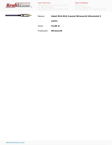 Salon Bemowo Salon Białołęka Powstańców Śląskich 87 lok. U10 B 01-466 Warszawa Tel. (22)427-89-95, (22)398-73-32 Kabrioletu 4 03-117 Warszawa Tel. (22)490-31-43, (22)243-36-05 Nazwa: Kabel RCA-RCA Coaxial Wireworld Ultraviolet 5 (UVV) akcesoriamuzyczne.pl Cena: 32,00 zł Producent: Wireworld