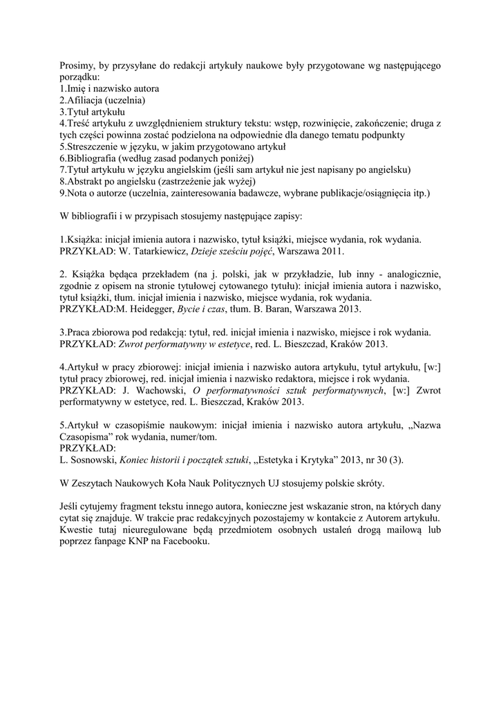 Prosimy, by przysyłane do redakcji artykuły naukowe były przygotowane wg następującego porządku: 1.Imię i nazwisko autora 2.Afiliacja (uczelnia) 3.Tytuł artykułu 4.Treść artykułu z uwzględnieniem struktury tekstu: wstęp, rozwinięcie, zakończenie; druga z tych części powinna zostać podzielona na odpowiednie dla danego tematu podpunkty 5.Streszczenie w języku, w jakim przygotowano artykuł 6.Bibliografia (według zasad podanych poniżej) 7.Tytuł artykułu w języku angielskim (jeśli sam artykuł nie jest napisany po angielsku) 8.Abstrakt po angielsku (zastrzeżenie jak wyżej) 9.Nota o autorze (uczelnia, zainteresowania badawcze, wybrane publikacje/osiągnięcia itp.) W bibliografii i w przypisach stosujemy następujące zapisy: 1.Książka: inicjał imienia autora i nazwisko, tytuł książki, miejsce wydania, rok wydania. PRZYKŁAD: W. Tatarkiewicz, Dzieje sześciu pojęć, Warszawa 2011. 2. Książka będąca przekładem (na j. polski, jak w przykładzie, lub inny - analogicznie, zgodnie z opisem na stronie tytułowej cytowanego tytułu): inicjał imienia autora i nazwisko, tytuł książki, tłum. inicjał imienia i nazwisko, miejsce wydania, rok wydania. PRZYKŁAD:M. Heidegger, Bycie i czas, tłum. B. Baran, Warszawa 2013. 3.Praca zbiorowa pod redakcją: tytuł, red. inicjał imienia i nazwisko, miejsce i rok wydania. PRZYKŁAD: Zwrot performatywny w estetyce, red. L. Bieszczad, Kraków 2013. 4.Artykuł w pracy zbiorowej: inicjał imienia i nazwisko autora artykułu, tytuł artykułu, [w:] tytuł pracy zbiorowej, red. inicjał imienia i nazwisko redaktora, miejsce i rok wydania. PRZYKŁAD: J. Wachowski, O performatywności sztuk performatywnych, [w:] Zwrot performatywny w estetyce, red. L. Bieszczad, Kraków 2013. 5.Artykuł w czasopiśmie naukowym: inicjał imienia i nazwisko autora artykułu, „Nazwa Czasopisma” rok wydania, numer/tom. PRZYKŁAD: L. Sosnowski, Koniec historii i początek sztuki, „Estetyka i Krytyka” 2013, nr 30 (3). W Zeszytach Naukowych Koła Nauk Politycznych UJ stosujemy polskie skróty. Jeśli cytujemy fragment tekstu innego autora, konieczne jest wskazanie stron, na których dany cytat się znajduje. W trakcie prac redakcyjnych pozostajemy w kontakcie z Autorem artykułu. Kwestie tutaj nieuregulowane będą przedmiotem osobnych ustaleń drogą mailową lub poprzez fanpage KNP na Facebooku.