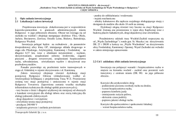 KONCEPCJA PROGRAMOWA dla inwestycji : „Rozbudowa Trasy Wschód-Zachód na odcinku od Węzła Zachodniego do Węzła Wschodniego w Bydgoszczy.” CZĘŚĆ OPISOWA 2. Opis zadania inwestycyjnego 2.1 Lokalizacja i zakres inwestycji Projektowana inwestycja zlokalizowana jest w województwie kujawsko-pomorskim w granicach administracyjnych miasta Bydgoszcz w jego północnym obszarze. Obszar ten rozciąga się od zachodu na wschód i obejmuje następujące dzielnice: Flisy, Okole, Jachcie, Bocianowo, Zawisza, Osiedle Leśne, Bielawy, Bartodzieje, Bydgoszcz Wschód. Inwestycja polegać będzie na rozbudowie , do parametrów dwujezdniowej ulicy klasy GP, istniejącego układu drogowego w ciągu ulic Pileckiego, Artyleryjskiej, Kamiennej i Fordońskiej na długości 8,57 km, wraz z obiektami inżynierskimi , węzłami, skrzyżowaniami, urządzeniami ochrony środowiska, ciągami pieszymi , drogami rowerowymi, urządzeniami bezpieczeństwa ruchu, odwodnieniem, oświetleniem węzłów i skrzyżowań oraz przebudową mediów. Ponadto przewiduje się przełożenie torów tramwajowych w ciągu ul. Gdańskiej w rejonie skrzyżowania z ul. Kamienną. Zakres inwestycji obejmuje również dyslokację stacji postojowej Bydgoszcz Główna (zlokalizowanej wzdłuż ul. Artyleryjskiej) kolidującej z projektowaną Trasą W-Z. Przeniesione zostaną tory stacji postojowej i umieszczone w rejonie stacji Bydgoszcz Towarowa. Zapewniona zostanie wszelka niezbędna infrastruktura techniczna dla obsługi spółek przewozowych tj.: - tory boczne o ilości i długości użytkowej nie mniejszej od obecnych z kanałami rewizyjnymi dla obsługi taboru oraz siecią trakcyjną dla obsługi jednostek elektrycznych - drogi dojazdowe i wewnętrzne - oświetlenie terenu stacji postojowej - przyłącza 240/400 V - urządzenia grzewcze i zasilania powietrzem - punkty do odfekalniania i wodowania - myjnia mechaniczna - obiekty kubaturowe dla zaplecza socjalnego obsługującego stację z dostępem do mediów dla około 10 osób na zmianę. Dyslokacji ulegną również tory boczne na stacji Bydgoszcz Wschód. Zostaną one przeniesione w rejon ulicy Kaplicznej wraz z budową placów ładunkowych, drogi dojazdowej oraz oświetlenia. Przedmiotowy odcinek trasy Wschód-Zachód rozpoczyna się od „Węzła Zachodniego” ( rondo gen. St. Maczka ) na skrzyżowaniu DK 25 i DK80 a kończy na „Węźle Wschodnim” na skrzyżowaniu ulicy Fordońskiej, Kamiennej i Spornej. Węzeł Zachodni nie wchodzi w zakres niniejszego opracowania 2.2 Cel i zakładany efekt zadania inwestycyjnego Inwestycja ma polepszyć warunki i bezpieczeństwo ruchu w mięście na kierunku wschód - zachód oraz przenieść ruch tranzytowy z centrum miasta (DK 80) na jego północne obrzeża . Korzyści dla użytkowników dróg: - podniesienie poziomu swobody ruchu na drodze, - wzrost bezpieczeństwa ruchu, - poprawa komfortu jazdy - zmniejszenie zużycia paliwa, - skrócenie czasu podróży - poprawa jakości obsługi ruchu. Korzyści dla społeczeństwa i społeczności lokalnej: - wzrost bezpieczeństwa ruchu, Transprojekt Gdański Sp. z o.o. 10 KONCEPCJA PROGRAMOWA dla inwestycji : „Rozbudowa Trasy Wschód-Zachód na odcinku od Węzła Zachodniego do Węzła Wschodniego w Bydgoszczy.” CZĘŚĆ OPISOWA - zmniejszenie negatywnego oddziaływania ruchu z istniejącej drogi na otoczenie poprzez zastosowania urządzeń ochrony środowiska - przeniesienie ruchu tranzytowego na kierunku wschódzachód z centrum miasta (DK 80) na jego północne obrzeża . 2.3 Funkcja ulicy w sieci ulic miasta Przedmiotowy odcinek Trasy Wschód-Zachód (Trasa W-Z) przebiegający w ciąg ulic Pileckiego, Artyleryjskiej, Kamiennej i Fordońskiej, łączy dwa najważniejsze węzły transportowe Bydgoszczy: Węzeł Wschód i Węzeł Zachód. Trasa ta jest jedną z dwóch osi transportowych miasta na kierunku wschód – zachód. Jednakże jedyną nie przebiegającą przez centrum miasta. Ze względu na funkcję Trasy W-Z w układzie transportowym miasta przewidziano dla niej wysoką klasę funkcjonalno-techniczną – ulica główna ruchu przyspieszonego (GP), oraz wysoką kategorię administracyjną drogi – droga krajowa. Obecnie projektowanym odcinkiem Trasy Wschód –Zachód prowadzona jest droga kategorii administracyjnej – powiatowa. Trasa nie spełnia warunków technicznych dla klasy technicznej GP. Długość projektowanego odcinka Trasy Wschód - Zachód wynosi około 8,5km. - DK 25 Bobolice -Człuchów -Bydgoszcz-KaliszOleśnica ( ul. Nad Torem, Grunwaldzka, Kujawska) - DK80 Pawłówek -Bydgoszcz –Toruń - Lubicz Dolny (Grunwaldzka, Toruńska, Fordońska) drogi wojewódzkie –nie występują drogi i ulice powiatowe - w ciągu Trasy W-Z - ul. Pileckiego, Artyleryjska, Kamienna - krzyżujące się z Trasą W-Z – ul. Żeglarska, Kąpielowa, Zaświat, Gdańska, Sułkowskiego, Gajowa, Inwalidów, Łęczycka, Sporna, Przemysłowa. - w rejonie Trasy W-Z - ul. Inwalidów, Lewińskiego, Pod wiaduktem. drogi i ulice lokalne - krzyżujące się z Trasą W-Z – ul. Kmicica, Rynkowska, Lelewela, Pułaskiego, Fabryczna, Wyścigowa Istniejącą sieć drogową w rejonie Trasy w-Z z uwzględnieniem kategorii i klas dróg przedstawiono na rysunku nr 1b 3.2 Istniejąca Trasa W-Z oraz zagospodarowanie i charakterystyka terenu wzdłuż projektowanej drogi (projektowany pas drogowy i teren przyległy) 3. Istniejące zagospodarowanie terenu 3.1 Istniejąca sieć drogowa W rejonie projektowanej Trasy W-Z nie występują drogi szybkiego ruchu. Układ drogowy tworzą: drogi krajowe - DK5 węzeł Nowe Marzy (A1) – Bydgoszcz -Pozna – Wrocław- Lubawka- granica państwa ( ul. Wyszyńskiego) Opis ogólny W niniejszym opracowaniu początek kilometrażu lokalnego (km 0+000) przyjęto w środku wyspy centralnej Węzła Zachodniego. W węźle tym przecinają się dwie drogi krajowe: DK 25 (Nad Torem, Grunwaldzka) i DK 80 (Grunwaldzka) z drogą powiatową ( Trasa WZ , ulica rot. Pileckiego). Węze