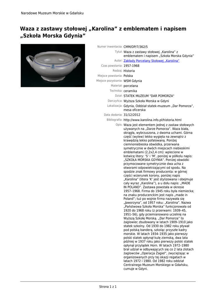 Narodowe Muzeum Morskie w Gdańsku Waza z zastawy stołowej „Karolina” z emblematem i napisem „Szkoła Morska Gdynia” Numer inwentarza: CMM/DP/7/362/5 Tytuł: Waza z zastawy stołowej „Karolina” z emblematem i napisem „Szkoła Morska Gdynia” Autor: Zakłady Porcelany Stołowej „Karolina” Czas powstania: 1957-1968 Rodzaj: Historia Miejsce powstania: Polska Miejsce pozyskania: WSM Gdynia Materiał: porcelana Technika: ceramika Dział: STATEK MUZEUM "DAR POMORZA" Darczyńca: Wyższa Szkoła Morska w Gdyni Lokalizacja: Gdynia, Oddział statek-muzeum „Dar Pomorza”, mesa oficerska Data dodania: 31/12/2012 Bibliografia: http://www.karolina.info.pl/historia.html Opis: Waza jest elementem jednej z zastaw stołowych używanych na „Darze Pomorza”. Waza biała, okrągła, wybrzuszona, z dwoma uchami. Górna część (wylew) lekko wygięta na zewnątrz z krawędzią lekko pofalowaną. Poniżej ciemnoniebieska obwódka, przerwana symetrycznie w dwóch miejscach niebieskimi emblematami (2,2x2,4 cm): wplecione w kotwicę litery: ‘S’ i ‘M’, poniżej w półkolu napis: „SZKOŁA MORSKA GDYNIA”. Poniżej obwódki przymocowane symetrycznie dwa ucha z otworami odpowietrzającymi od spodu. Na spodzie znak firmowy producenta: w górnej części wizerunek korony, poniżej napis „Karolina” (litera ‘K’ jest stylizowana i obejmuje cały wyraz „Karolina”), a u dołu napis: „MADE IN POLAND”. Zastawa powstała w okresie 1957–1968. Firma do 1945 roku była niemiecka; na znaku producenckim jest napis „made in Poland”; tuż po wojnie firma nazywała się „Jaworzyna”, od 1957 roku: „Karolina”. Nazwa „Państwowa Szkoła Morska” funkcjonowała od 1920 do 1968 roku (z przerwami: 1939–45, 1951–56), gdy przemianowano uczelnię na Wyższą Szkołę Morską. „Dar Pomorza” to żaglowiec zbudowany w latach 1909–1910 jako statek szkolny. Od 1930 do 1982 roku pływał pod polską banderą, szkoląc przyszłe kadry morskie. W latach 1934–1935 jako pierwszy polski statek opłynął kulę ziemską, dwa lata później w 1937 roku jako pierwszy polski statek opłynął przylądek Horn. W latach 1972–1980 brał udział w odbywających się co 2 lata zlotach żaglowców „Operacja Żagiel”, zwyciężając w organizowanych przy tej okazji regatach w latach 1972 i 1980. Od 1982 roku oddział Centralnego Muzeum Morskiego w Gdańsku, cumuje w Gdyni. Strona 1 z 1