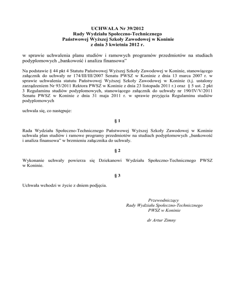 Uchwala nr 39 2012 ws. studiow podyplomowych bankowosc