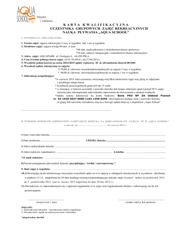 Nauka i zabawa … KARTA KWALIFIKACYJNA UCZESTNIKA GRUPOWYCH ZAJĘĆ REKREACYJNYCH NAUKA PŁYWANIA „AQUA SCHOOL” I. INFORMACJA ORGANIZATORA . 1. Forma zajęć: zajęcia rekreacyjne 2 razy w tygodniu lub 1 raz w tygodniu 2. Struktura zajęć: zajęcia trwają 90 min. w tym: *60 min. nauka pływania z instruktorem (basen sportowy) *30 min. zabawy integracyjne z instruktorem (basen rekreacyjny) 3. Adres zajęć: AQUAPARK ul. Grottgera 4, 64-920 PIŁA 4. Czas trwania pełnego kursu zajęć: od 01.10.2014 r. do 27.06.2015 r. 5. Wysokość jednorazowej na sezon 2014/2015 opłaty wpisowej 20 zł. (dwadzieścia złotych 00/100) 6. Wysokość opłaty miesięcznej za zajęcia: *170,00 zł. (słownie: stosiedemdziesiątzłotych) za zajęcia 2 razy w tygodniu, * 90,00 zł. (słownie: dziewięćdziesiątzłotych) za zajęcia 1 raz w tygodniu, 7. Informacje uzupełniające: *w czerwcu 2015 roku uczestnicy otrzymują certyfikat ukończenia zajęć oraz płytę ze zdjęciami z przebiegu całego kursu. * liczebność poszczególnych grup od 8 do 15 osób. * w miesiącu, w którym uczestnik z powodu choroby lub innego zdarzenia opuści ponad 50 % zajęć, otrzyma jako rekompensatę indywidualne zaproszenie do skorzystania z atrakcji wodnych. *wpłaty należy dokonywać na konto bankowe: Bank PKO BP SA Oddział Poznań nr 63 1020 4027 0000 1102 1259 9256 obowiązkowo podając imię i nazwisko dziecka, nr grupy lub nazwisko instruktora oraz m-c którego opłata dotyczy z dopiskiem „Aqua School” ____________________________________________________________ II. WNIOSEK RODZICÓW (OPIEKUNÓW) O PRZYJĘCIE DZIECKA NA ZORGANIZOWANE ZAJĘCIA NP W „AQUA SCHOOL” w okresie od ……………………………… do czerwca 2015 r. 1.Imię i nazwisko dziecka ........................................................................................................................................................................... 2.Data urodzenia .......................................................... 3.PESEL dziecka ....................................................................................... 4.Adres zamieszkania dziecka .................................................................................................................................................................... 5.Adres rodziców (opiekunów): ................................................................................... 6.telefon …………………................................. 7.E-mail rodziców: ……………..………………………………………………………………………………………….…………… 8.Poziom umiejętności pływackich dziecka: początkujący / średni / zaawansowany.* 9. Ilość zajęć w tygodniu: ………………………………………………………………………………………………………………. 10.Zobowiązuję się do terminowego uiszczania wszystkich opłat za w/w zajęcia w odstępach miesięcznych w wysokości określonej w punkcie I.5 i 6. (najpóźniej do 30 dnia każdego miesiąca poprzedzającego miesiąc zajęć (wyjątek - opłata za październik 2014 do 5 października 2014 oraz za marzec 2015 najpóźniej do dnia 28 luty 2015 r.) 11.Oświadczam, ze zapoznałem(am) się z zapisami regulaminu w/w zajęć oraz regulaminami obiektu i zobowiązuję się do ich przestrzegania. ................................................ (miejscowość i data) Załączniki: 1. Zaświadczenie lekarskie / oświadczenie rodzica (opiekuna) 2. Oświadczenie- zgoda na wykorzystywanie wizerunku. *niepotrzebne skreślić ............................................................ ( podpis rodzica lub opiekuna) Nauka i zabawa … ……………………………………. pieczęć Z A ŚWIAD C ZE N I E LE KAR S KI E Nazwisko i imię: .………………………………………………………..…………………………………………………. Data urodzenia: ……………………….……….. PESEL ………………………………………………………………. Zamieszkały(a) ……………………………………………………………………………………………………………. ……………………………………………………………………………………………………………. Cel wydania zaświadczenia: brak przeciwwskazań zdrowotnych do czynnego udziału w wodnych zorganizowanych zajęciach rekreacyjnych z nauką pływania w Aquapark w Pile na sezon 2014/2015. Piła dnia …………………….. pieczęć i podpis lekarza ……………………………………………………………..... ______________________________________________________________________________________________ Nauka i zabawa … O ŚWIAD C ZE N I E R O D ZI CA Nazwisko i imię: .………………………………………………………..…………………………………………………. Data urodzenia: ……………………….……….. PESEL ………………………………………………………………. Zamieszkały(a) ……………………………………………………………………………………………………………. ……………………………………………………………………………………………………………. Oświadczamy, że stan zdrowia naszego dziecka nie budzi obaw, co do czynnego udziału w wodnych zorganizowanych zajęciach rekreacyjnych z nauką pływania w Aquapark w Pile - sezon 2014/2015. Piła dnia …………………….. podpis rodzica ……………………………………………………………..... Nauka i zabawa … ZGODA NA WYKORZYSTANIE WIZERUNKU DZIECKA Udzielam Zarządowi Centrum Rekreacji Wodnej „Aqua-Pil” Spółka z o.o. w Pile ul. Artura Grottgera 4 64-920 PIŁA nieodwołalnego i nieodpłatnego prawa wielokrotnego wykorzystywania zdjęć i filmików z wizerunkiem moje