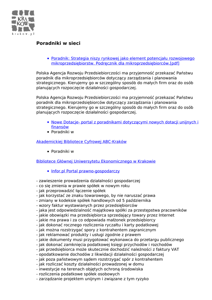 Poradniki w sieci Poradnik: Strategia niszy rynkowej jako element potencjału rozwojowego mikroprzedsiębiorstw. Podręcznik dla mikroprzedsiębiorców.[pdf] Polska Agencja Rozwoju Przedsiebiorczości ma przyjemność przekazać Państwu poradnik dla mikroprzedsiębiorców dotyczący zarządzania i planowania strategicznego. Kierujemy go w szczególny sposób do małych firm oraz do osób planujących rozpoczęcie działalności gospodarczej. Polska Agencja Rozwoju Przedsiebiorczości ma przyjemność przekazać Państwu poradnik dla mikroprzedsiębiorców dotyczący zarządzania i planowania strategicznego. Kierujemy go w szczególny sposób do małych firm oraz do osób planujących rozpoczęcie działalności gospodarczej. Nowe Dotacje- portal z poradnikami dotyczącymi nowych dotacji unijnych i finansów Poradniki w Akademickiej Bibliotece Cyfrowej ABC-Kraków Poradniki w Bibliotece Głównej Uniwersytetu Ekonomicznego w Krakowie Infor.pl Portal prawno-gospodarczy - zawieszenie prowadzenia działalności gospodarczej co się zmienia w prawie spółek w nowym roku jak przeprowadzić łączenie spółek jak korzystać ze znaku towarowego, by nie naruszać prawa zmiany w kodeksie spółek handlowych od 5 października wzory faktur wystawianych przez przedsiębiorców jaka jest odpowiedzialność majątkowa spółki za przestępstwa pracowników jakie obowiązki ma przedsiębiorca sprzedający towary przez Internet jakie ma prawa i za co odpowiada małżonek przedsiębiorcy jak dokonać rocznego rozliczenia ryczałtu i karty podatkowej jak można rozstrzygać spory z kontrahentem zagranicznym jak reklamować produkty i usługi zgodnie z prawem jakie dokumenty musi przygotować wykonawca do przetargu publicznego jak dokonać zamknięcia podatkowej księgi przychodów i rozchodów jak przedsiębiorca może skutecznie dochodzić należności z faktury VAT opodatkowanie dochodów z likwidacji działalności gospodarczej jak poza państwowym sądem rozstrzygać spór z kontrahentem jak rozliczać koszty działalności prowadzonej w domu inwestycje na terenach objętych ochroną środowiska rozliczenia podatkowe spółek osobowych zarządzanie projektem unijnym i związane z tym ryzyko Polska Agencja Rozwoju Przedsiębiorczości http://www.parp.gov.pl/ Różne poradniki dla przedsiębiorców: - Sektorowe Programy Operacyjne - Procesy inwestycyjne i strategie przedsiębiorstw w czasie kryzysu - Bezpieczne zawieranie umów przez fundusz pożyczkowy - Dotacje na innowacje- przewodnik po działaniach Programu Operacyjnego Innowacyjna Gospodarka - Prowadzenie i rozliczanie projektu w ramach Programu Operacyjnego Innowacyjna Gospodarka - Uzbekistan - przewodnik dla przedsiębiorców - Ukraina - przewodnik dla przedsiębiorców - Poradniki bezpieczeństwo i higiena pracy w małych i średnich przedsiębiorstwach budowlanych - Kazachstan - przewodnik dla przedsiębiorców - Zarządzanie należnościami w MSP - Zamówienia publiczne agencji systemu narodów zjednoczonych - Prawa autorskie i prawa pokrewne- poradnik przedsiębiorcy - Ochrona własności przemysłowej - Leasing - poradnik przedsiębiorcy - Własność przemysłowa w działalności gospodarczej - Sektor spożywczy i handlu artykułami spożywczymi - dostosowanie MSP do wymogów Unii Europejskiej - Ochrona środowiska, ochrona wód - poradnik przedsiębiorcy - Gospodarka odpadami- poradnik przedsiębiorcy - Szkolenia internetowe Akademii PARP Centralny Instytut Ochrony Pracy - Państwowy Instytut Badawczy Poradniki dotyczące BHP: - Powszechnie obowiązujące przepisy BHP - Przepisy BHP w umowach międzynarodowych Twoja-firma.pl - wortal dla MSP Poradnik "poznaj tajniki prowadzenia firmy" Zakład Ubezpieczeń Społecznych Poradniki w "Bazie wiedzy Zakłądu Ubezpieczeń Społecznych" Poradnik http://biznes.pl/firma z zakresu: podatków, rozpoczynania działalności gospodarczej, prowadzenia działalności, finansowania działalności, ubezpieczeń społecznych, Pracuj.pl Poradniki dla zamierzających lub prowadzących przedsiębiorstwo: Ministerstwo Finansów Broszury informacyjne dla przedsiębiorców Główny Inspektorat Sanitarny Poradniki z zakresu bezpieczeństwa żywności i żywienia: - Pięć kroków do bezpiecznej żywności - Akty prawne związane z bezpieczeństwem żywności i żywienia - Zasady systemu HACCP i GHP/GMP w zakładach produkcji i obrotu żywnością - Żywność genetycznie zmodyfikowana - Nowa żywność Komisja Nadzoru Finansowego Publikacje dotyczące rynku kapitałowego: - Prawa i obowiązki akcjonariuszy spółek publicznych - Klient domu maklerskiego- prawa i obowiązki - Akcje i obligacje korporacyjne- oferta publiczna i rynek regulowany - Prawa uczestnika funduszu inwestycyjnego i sposób ich realizacji - Poradnik inwestora- jak inwestować w UE - Poradnik- jak uczestniczyć w Walnym Zgromadzeniu Akcjonariuszy - Poradnik- jak czytać prospekt emisyjny - W co inwestować czyli ABC inwestycji - Jak zacząć inwestować - Jaki wybrać fundusz inwestycyjny Fundacja Edukacji Rynku Kapitałowego Publikacje dotyczące rynku kapitałowego i przedsiębiorczości: - Rynek kapitałowy i terminowy - Prezentacje edukacyjne do przedmiotu podstawy przedsiębiorczości - Anatomia sukcesu- depozyty i instrumenty rynku pieniężnego - Anatomia sukcesu- obligacje - Anatomia sukcesu- instytucje i zasady funkcjonowania rynku kapitałowego - Anatomia sukcesu- rynek pierwotny papierów wartościowych - Anatomia sukcesu- rynek wtórny papierów wartościowych - Anatomia sukcesu- ogólne zasady inwestowania Powered by TCPDF (www.tcpdf.org)