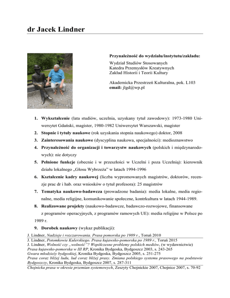 dr Jacek Lindner Przynależność do wydziału/instytutu/zakładu: Wydział Studiów Stosowanych Katedra Przemysłów Kreatywnych Zakład Historii i Teorii Kultury Akademicka Przestrzeń Kulturalna, pok. L103 email: [email protected] 1. Wykształcenie (lata studiów, uczelnia, uzyskany tytuł zawodowy): 1973-1980 Uniwersytet Gdański, magister, 1980-1982 Uniwersytet Warszawski, magister 2. Stopnie i tytuły naukowe (rok uzyskania stopnia naukowego) doktor, 2008 3. Zainteresowania naukowe (dyscyplina naukowa, specjalności): medioznawstwo 4. Przynależność do organizacji i towarzystw naukowych (polskich i międzynarodowych): nie dotyczy 5. Pełnione funkcje (obecnie i w przeszłości w Uczelni i poza Uczelnią): kierownik działu lokalnego „Głosu Wybrzeża” w latach 1994-1996 6. Kształcenie kadry naukowej (liczba wypromowanych magistrów, doktorów, recenzje prac dr i hab. oraz wniosków o tytuł profesora): 25 magistrów 7. Tematyka naukowo-badawcza (prowadzone badania): media lokalne, media regionalne, media religijne, komunikowanie społeczne, kontrkultura w latach 1944-1989. 8. Realizowane projekty (naukowo-badawcze, badawczo-rozwojowe, finansowane z programów operacyjnych, z programów ramowych UE): media religijne w Polsce po 1989 r. 9. Dorobek naukowy (wykaz publikacji): J. Lindner, Nadzieje i rozczarowania. Prasa pomorska po 1989 r., Toruń 2010 J. Lindner, Potomkowie Kulerskiego. Prasa kujawsko-pomorska po 1989 r., Toruń 2015 J. Lindner, Wolność czy „wolność”? Współczesne problemy polskich mediów, (w wydawnictwie) Prasa kujawsko-pomorska w III RP, Kronika Bydgoska, Bydgoszcz 2003, s. 243-265 Gwara młodzieży bydgoskiej, Kronika Bydgoska, Bydgoszcz 2005, s. 251-275 Prasa coraz bliżej ludu, lud coraz bliżej prasy. Zmiana polskiego systemu prasowego na podstawie Bydgoszczy, Kronika Bydgoska, Bydgoszcz 2007, s. 287-311 Chojnicka prasa w okresie przemian systemowych, Zeszyty Chojnickie 2007, Chojnice 2007, s. 70-92 Miasto jako komunikat, szepty i krzyki bydgoskich murów, Kronika Bydgoska, Bydgoszcz 2008, s. 331-353 Potęga tabloidów, Dziś, nr 7, Warszawa 2008, s. 113-121 Nadęty balon „cudu nad Wisłą”, Dziś nr 8, Warszawa 2008, s. 158-165 Nowomowa w Polsce, Dziś nr 12, Warszawa 2008, s. 39-55 Ucieczka od polskości, Kronika Bydgoska, Bydgoszcz 2009, s. 255-273 Światy przedstawione i przemilczane polskich dzienników, Zeszyty Prasoznawcze 1-2/2009, Kraków, Gorący trójkąt – władza, media, społeczeństwo, Kronika Bydgoska, Bydgoszcz 2010, s. 181-205 Od sacrum do profanum, czyli bydgoska prasa bezpłatna, Kronika Bydgoska, Bydgoszcz 2011, s. 275-295 Czym straszy Nasz Dziennik, Zeszyty Prasoznawcze 1-2/2012, Kraków, s. 175-194 E – Bydgoszcz, Kronika Bydgoska, Bydgoszcz 2012, s. 255-274 Krajobraz medialny kujawsko-pomorski, wydawnictwo internetowe WSG, 2012 Opracowanie haseł w Encyklopedii Gdańska, Gdańsk 2012, s. 340 Prasa województwa kujawsko-pomorskiego na tle kraju, w: Krajobraz społeczno-kulturowy województwa kujawsko-pomorskiego, red. Z. Sawaniewska-Moch, W. Moch, Bydgoszcz 2012, s. 129-139 Powstanie styczniowe – jeden z mitów założycielskich II RP, w: Powstanie styczniowe i jego echa w dorzeczu Drwęcy, Golub – Dobrzyń 2013, red. M. Krajewski, s.73-85 Prasa partyjna – dobrodziejstwo czy przekleństwo?, Kronika Bydgoska, Bydgoszcz 2013, s. 313-331 Katyń a polskie media, w: Katyń – stan badań, Toruń 2013, s.205 - 228 Katyń na łamach, kwestia zawsze polityczna, w: Katyń. Ofiary z Kujaw i Pomorza w 73. Rocznicę zbrodni, red. W. Kubiak, Z. Karpus, Włocławek 2013, s. 211-243 Muzy na łamach, czyli kultura w prasie po 1989 r., Heteroglossia, Bydgoszcz 2013, s. 127-140 Cześć bohaterom. Upamiętnienie powstania styczniowego w prasie i kulturze masowej, w PolskaBiałoruś: wspólne dziedzictwo historyczne, red. E. Rosowska, A. Wabiszczewicz, Warszawa 2014, s. 29-38 Nowomowa, magiel, spaczona erystyka?, Heteroglossia, Bydgoszcz 2014, s. 171-195 Aureola nad miastem, bydgoskie media religijne, Kronika Bydgoska, Bydgoszcz 2014 Od pierwszoklasisty do profesora. Bydgoska prasa szkolna, Kronika Bydgoska 2015, s. 213-227 Publikacje popularno-naukowe Edmund Zarzycki, czyli prawość naukowca, Kalendarz Bydgoski, Bydgoszcz 2014, s. 75-77 Bydgoszcz muzeami słynna, Kalendarz Bydgoski, Bydgoszcz 2015, s. 60-63 Honor przedwojennego oficera, Kalendarz Bydgoski, Bydgoszcz 2015, s. 93-96 Tramwajowe pomysły, Kalendarz Bydgoski, Bydgoszcz 2015, s. 118-120 Alma Mater Bydgostiensis, Kalendarz Bydgoski 2016, s. 52-56 10. Uzyskane patenty (jeżeli są): nie dotyczy 11. Zajęcia dydaktyczne (tytuły przedmiotów i rodzaj zajęć – wykłady, konwersatoria, seminaria): Komunikowanie społeczne, Kultura języka, Historia dziennikarstwa (mediów) Media lokalne Warsztaty dziennikarskie