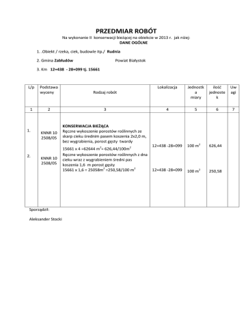 PRZEDMIAR ROBÓT Na wykonanie II konserwacji bieżącej na obiekcie w 2013 r. jak niżej: DANE OGÓLNE 1. .Obiekt / rzeka, ciek, budowle itp./ Rudnia 2. Gmina Zabłudów Powiat Białystok 3. Km 12+438 - 28+099 tj. 15661 L/p 1 1. Podstawa wyceny Rodzaj robót 2 3 KNNR 10 2508/05 KONSERWACJA BIEŻĄCA Ręczne wykoszenie porostów roślinnych ze skarp cieku średnim pasem koszenia 2x2,0 m, bez wygrabienia, porost gęsty twardy 2 2. KNNR 10 2508/05 Sporządził: Aleksander Stocki 2 15661 x 4 =62644 m = 626,44/100m Ręczne wykoszenie porostów roślinnych z dna cieku wraz z wygrabieniem średni pas koszenia 1,6 m porost gęsty 15661 x 1,6 = 25058m2 =250,58/100 m2 Lokalizacja Jednostk a miary ilość jednoste k Uw agi 4 5 6 7 12+438 -28+099 100 m2 626,44 12+438 -28+099 100 m2 250,58 PRZEDMIAR ROBÓT Na wykonanie Zabudowa wyrwy i naprawa bieżąca jazu Nr 1 w km 12+973 na obiekcie jak niżej: DANE OGÓŁNE 1. Obiekt / rzeka, ciek, budowle itp./ Rudnia 2. Gmina Zabłudów L/p Podstawa wyceny 1 1. 2. 2 KNNR 1 0212 Lokalizacja Rodzaj robót 3 Wykop mechaniczny koparką na odkład na poszurze i ponurze –uporządkowanie dna i skarp po rozmyciu budowli na dł. 30 m 30 x 0,5 x5 = 75 m3 Kalk. Zakł. Rozebranie pozostałości umocnienia stopy skarp z kiszki faszynowej z uporządkowaniem wywiezieniem poza obręb obiektu ciągnikiem z przyczepą Kalk. Zakł. Dowiezienie ziemi (piasek gliniasty) 8x 6x2 = 96 m3 KNNR1 0320 Ręczne zasypywanie wnęk za ścianami budowli z ziemi dostarczonej samochodami – zabudowa ubytków ziemi z zagęszczaniem mechanicznym 8x 6x2 = 96 m3 5 KNNR 1 0503 Plantowanie powierzchni skarp 30 x 2x2 =120 m2 6 KNR 2-11 0504 Umocnienie stopy skarpy kiszką faszynową Ø 2 x 20 cm 30 x2 =60 m 3. 4. Jednostka ilość miary jednostek 4 5 6 m3 75 r-g 20 m-g 4 m 96 m3 96 m2 120 m 60 Uwagi 7 7 KNR 2-11 0521 Wykonanie palisady z kołków drewnianych Ø 10 cm dł. 1,5 m na skarpach i w dnie 4x4 +2x2 = 20 m KNR 2-11 0402 m 20 Wykonanie narzutu kamiennego w płotkach krata 1x1 m na skarpach na poszurze i ponurze 4x2 x4 =32 m2 m2 32 Narzut kamienny luzem w dnie na poszurze i ponurze 4x2x2 x0,2=3,20 m3 m3 3,20 8 KNR 2-11 0401 9 KNR 2-11 0404 10 Kalk. Zakł. Wykonanie podsypki pod narzut kamienny na skarpach gr 10 cm 16 m2 Oczyszczenie betonów z osadów 12 13 KNR2-02 1209 Sporządził: 14 m2 11 KNR2-02 1510 16 m2 Malowanie dwukrotne elementów stalowych z oczyszczeniem Wykonanie barierki stalowej z ceownika 80 mm z mocowaniem do istniejącej konstrukcji 1,2 x 2 +2,40 = 4,8 m Aleksander Stocki m2 m 6 4,8 PRZEDMIAR ROBÓT Na wykonanie II konserwacji bieżącej na obiekcie w 2013 r. jak niżej: DANE OGÓLNE 1. .Obiekt / rzeka, ciek, budowle itp./ Rudnik 2. Gmina Michałowo Powiat Białystok 3. Km 0+000 - 7+679 tj. 7679 m L/p 1 1. 2. Podstawa wyceny Rodzaj robót 2 3 KNNR 10 2508/05 KNNR 10 2508/05 Sporządził: Aleksander Stocki Lokalizacja Jednostk a miary ilość jednoste k Uw agi 4 5 6 7 KONSERWACJA BIEŻĄCA Ręczne wykoszenie porostów roślinnych ze skarp cieku średnim pasem koszenia 2x2,0 m, bez wygrabienia, porost gęsty twardy 7679 x 4 =30716m2= 307,16/100m2 Ręczne wykoszenie porostów roślinnych z dna cieku wraz z wygrabieniem średni pas koszenia 1,8 m porost gęsty 7679x 1,8 = 13822 m2 =138,22/100 m2 0+000 - 7+679 0+000 - 7+679 100 m2 307,16 100 m2 138,22 PRZEDMIAR ROBÓT Na wykonanie II konserwacji bieżącej na obiekcie w 2013 r. jak niżej: DANE OGÓLNE 1. .Obiekt / rzeka, ciek, budowle itp./ Małynka 2. Gmina Zabłudów Powiat Białystok 3. Km 13+195 - 19+361 tj. 6166 m L/p 1 Podstawa wyceny Rodzaj robót 2 3 1. KNNR 10 2508/05 2. KNNR 10 2508/05 Sporządził: Aleksander Stocki Lokalizacja Jednostk a miary ilość jednoste k Uw agi 4 5 6 7 KONSERWACJA BIEŻĄCA Ręczne wykoszenie porostów roślinnych ze skarp cieku średnim pasem koszenia 2x2,0 m, bez wygrabienia, porost gęsty twardy 6166 x 4 =24664m2= 246,64/100m2 Ręczne wykoszenie porostów roślinnych z dna cieku wraz z wygrabieniem średni pas koszenia 1,2 m porost gęsty 6166x 1,2 = 7399 m2 =73,99/100 m2 13+195-19+361 100 m2 246,64 13+195-19+361 100 m2 73,99 PRZEDMIAR ROBÓT Na wykonanie Naprawy bieżącej przepustu przejazdowego i zabudowy wyrwy na rzece Małynka w km 17+663 , gm. Zabłudów na obiekcie jak niżej: DANE OGÓŁNE 3. Obiekt / rzeka, ciek, budowle itp./ Małynka 4. Gmina Zabłudów obręb Folwarki Tylwickie 5. Budowle piętrzące w km j.n. L/p Podstawa wyceny 1 1. 2. 2 KNNR10 2318/02 KNNR 10 2507/03 3. KNNR 10 2507/03 4. Kalk. Zakł. Lokalizacja Rodzaj robót 3 Naprawa bieżąca przepustu przejazdowego w km 17+663 Ø 125 cm L=6 m i zabudowa wyrwy Wykopy ręczne pod budowle z przemieszczeniem gruntu na odkład i ręcznym zasypaniem wykopu i rozplantowaniem nadmiaru ziemi 6 x 2x1,8 -=21,60 m3 = 0,216/100 m3 Rozebranie pozostałości umocnienia stopy skarp z kiszki faszynowej z uporządkowaniem wywiezieniem poza obręb obiektu ciągnikiem z przyczepą Ręczne czyszczenie przepustów z namułu Ø 125cm 6 m Wykonanie opaski betonowej wzdłuż rurociągów i styków rur z betonu i siatki Rabitza Ø 125 cm Mieszanka betonowa Jednostka ilość miary jednostek 4 5 6 m3 21,60 r-g 20 m-g 6 m 6 m3 1,28 Uwagi 7 5 6 7 Kalk.Zakł. Kalk. Zakł. KNNR 1 0311 8 9 10 KNNR 1 0503 KNR 2-11 0504 KNR 2-11 0402 11 KNR 2-11 0402 12 KNR 2-11 0401 13 KNR 2-11 0,3x 0,3 x 2 x 6 = 1,08m3 3 x 0,2 x 0,05 x7 = 0,20 m3 Razem1,28 m3 Siatka Rabitza 7 x3 x 0,50 x 2= 21 m2 m3 21 m3 12 m3 90 m3 90 Ręczne formowanie nasypów z dostarczeniem ziemi samochodami 12x 5x1,5 = 90 m3 m2 80 Plantowanie powierzchni skarp 20 x 2x2 =80 m2 m 40 Umocnienie stopy skarpy kiszką faszynową Ø 2 x 20 cm 20 x2 =40 m m2 32 Wykonanie narzutu kamiennego w płotkach krata 1x1 m na skarpach na poszurze i ponurze 4x2 x4 =32 m2 m2 24 m2 16 m2 56 m 12 m2 12 Uzupełnienie warstwy jezdnej z dowiezieniem żwiru i rozplantowaniem na budowli 4 x 6 x0,5= 12 m3 Dowiezienie ziemi na wyrwę 12x 5x1,5 = 90 m3 Wykonanie narzutu kamiennego w płotkach krata 1x1 m na skarpach na wyrw