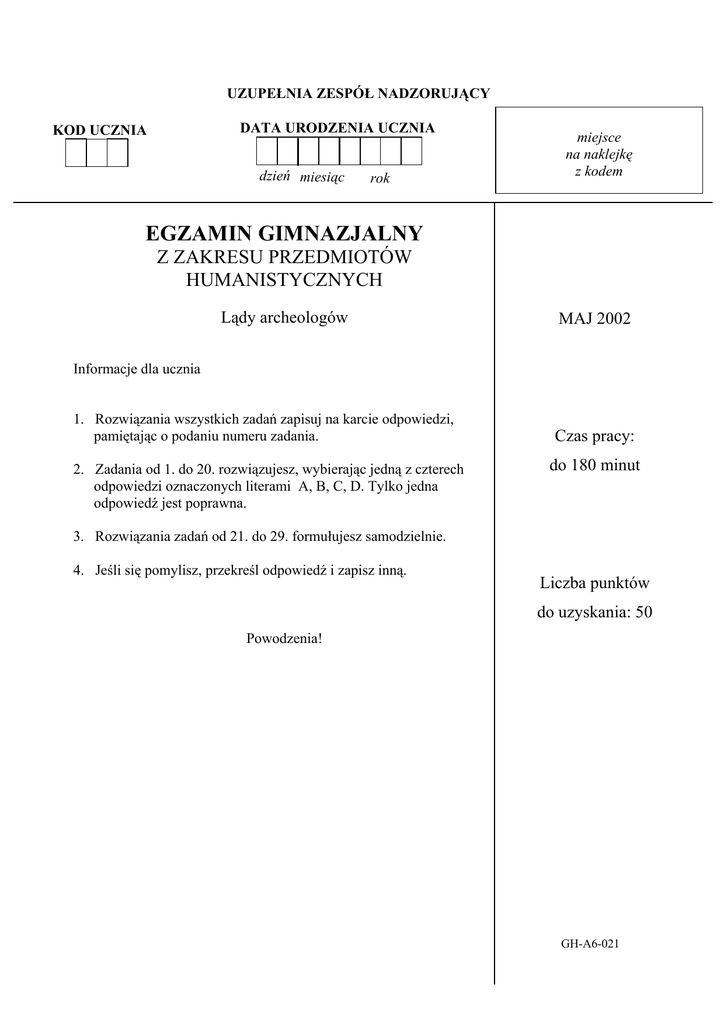 UZUPEŁNIA ZESPÓŁ NADZORUJĄCY DATA URODZENIA UCZNIA KOD UCZNIA dzień miesiąc rok miejsce na naklejkę z kodem EGZAMIN GIMNAZJALNY Z ZAKRESU PRZEDMIOTÓW HUMANISTYCZNYCH Lądy archeologów MAJ 2002 Informacje dla ucznia 1. Rozwiązania wszystkich zadań zapisuj na karcie odpowiedzi, pamiętając o podaniu numeru zadania. 2. Zadania od 1. do 20. rozwiązujesz, wybierając jedną z czterech odpowiedzi oznaczonych literami A, B, C, D. Tylko jedna odpowiedź jest poprawna. Czas pracy: do 180 minut 3. Rozwiązania zadań od 21. do 29. formułujesz samodzielnie. 4. Jeśli się pomylisz, przekreśl odpowiedź i zapisz inną. Liczba punktów do uzyskania: 50 Powodzenia! GH-A6-021 TEKST I Orszak posuwa się jakby po gzymsie wykutym z boku skały, wreszcie zatrzymuje się na obszernym placu o kilkanaście pięter nad dnem wąwozu. Tu znajdują się drzwi prowadzące do podziemnego grobu, który budował sobie faraon przez trzydzieści lat panowania. Grób ten to cały pałac z komnatami dla pana, rodziny i służby, z jadalnią, sypialnią i łazienką, z kaplicami poświęconymi różnym bogom, a nareszcie - ze studnią, gdzie na wieki spocznie mumia faraona. Przy blasku jaskrawych pochodni widać ściany wszystkich komnat pokryte modlitwami i obrazami, które odtwarzają wszystkie zajęcia i rozrywki zmarłego: polowania, budowę świątyń i kanałów, triumfalne przejazdy, uroczystości odprawiane na cześć bogów, walki wojsk z nieprzyjaciółmi, pracę ludu... Nie dość na tym: pokoje bowiem są zastawione sprzętami, naczyniami, wozami i bronią, kwiatami, mięsem, ciastem i winem, ale jeszcze znajduje się w nich mnóstwo posągów. Są to liczne wizerunki Ramzesa XII, jego kapłanów, ministrów, kobiet, żołnierzy i niewolników. Pan bowiem i na tamtym świecie nie może się obejść bez kosztownych sprzętów, wykwintnego jadła i wiernej służby. Bolesław Prus, Faraon t. II, Warszawa 1963. Odkrycie przez Cartera [brytyjskiego archeologa żyjącego w latach 1873-1939] niemal nienaruszonego grobu Tutenchamona stało się międzynarodową sensacją. Archeologia zyskała obfite źródło wiedzy o starożytnym Egipcie, a cudowne wyposażenie grobu oczarowało szeroką publiczność. Carter tak opisywał moment wejścia do grobowca: Wsunąłem świecę i zajrzałem do środka, lord Carnarvon, lady Evelyn i Callender stali wokół mnie w trwożnym oczekiwaniu na to, co powiem. Z początku nic nie mogłem zobaczyć, ciepłe powietrze uchodzące z wnętrza komory spowodowało, że płomień świecy migotał, lecz wkrótce w zasięgu mojego wzroku wyłoniły się z ciemności szczegóły komnaty - dziwaczne zwierzęta, posągi i złoto wszędzie blask złota. Przez chwilę, która musiała być wiecznością dla tych, którzy stali obok mnie, zamarłem oniemiały z zachwytu. Thomas Hoving, Tutenchamon za kulisami odkrycia, Warszawa 1991. Zadania zamknięte Zadania od 2. do 8. odnoszą się do pierwszej i drugiej części TEKSTU I Zadanie 1. (0 – 1) Najodpowiedniejszym synonimem wyrazu faraon jest A. książę, B. namiestnik, C. minister, D. król. Zadanie 2. (0 – 1) Grób faraona znajdował się w miejscu A. wyklętym, B. trudno dostępnym, C. dobrze oznakowanym, D. zakazanym. Strona 2 z 8 Zadanie 3. (0 – 1) W grobie faraona informacje o jego życiu były zawarte A. na ściennych malowidłach, B. w papirusowych księgach, C. na rytualnych naczyniach, D. w wyrzeźbionych wizerunkach. Zadanie 4. (0 – 1) Wyposażenie grobu faraona świadczyło o A. dobrym zabezpieczeniu, B. lęku Egipcjan przed śmiercią, C. ochronie pamiątek po zmarłym, D. trosce o życie wieczne zmarłego. Zadanie 5. (0 – 1) We fragmencie „Faraona” B. Prusa dominują A. powtórzenia, B. wyliczenia, C. apostrofy, D. pytania retoryczne. Zadanie 6. (0 – 1) Z tekstu T. Hovinga wynika, że odkrywcami grobu Tutenchamona byli A. Egipcjanie, B. Francuzi, C. Anglicy, D. Amerykanie. Zadanie 7. (0 – 1) Odnalezienie grobu Tutenchamona przyczyniło się do A. poszerzenia wiedzy o kulturze Egiptu, B. potępienia archeologów przez opinię społeczną, C. zakazu badań archeologicznych w Egipcie, D. powstania nowej gałęzi wiedzy. Zadanie 8. (0 – 1) Który z cytatów wyraża emocję? A. Wsunąłem świecę i zajrzałem do środka, B. z początku nic nie mogłem zobaczyć, C. zamarłem oniemiały z zachwytu, D. płomień świecy migotał. Zadanie 9. (0 – 1) Dla naukowców groby starożytnych Egipcjan mają przede wszystkim wartość A. historyczną, B. polityczną, C. religijną, D. ekonomiczną. Strona 3 z 8 TEKST II Heinrich Schliemann otworzył „Iliadę” i przeczytał raz jeszcze wiersze o straszliwej walce Achillesa z Hektorem. O tym, jak Hektor uciekał przed śmiałym biegaczem i jak obydwaj miasto potrójnym okrążyli skokiem. Przebył opisaną w „Iliadzie” drogę i znalazł zbocze tak strome, że musiał zeń złazić na czworakach. To utwierdziło go w przekonaniu, że Homer, którego opisy terenu traktował tak, jakby chodziło o najściślejszą topografię wojskową, nie mógł pomyśleć o tym, żeby jego bohaterowie zbiegali z tego zbocza potrójnym skokiem. Z zegarkiem w jednym i Homerem w drugim ręku odmierzył drogę między pagórkiem, który kryć miał w sobie Troję, a przylądkiem, gdzie stać miały okręty Achajów. Śledził przebieg pierwszego dnia bitwy trojańskiej, tak jak opiewa ją „Iliada” od drugiej do siódmej pieśni, i obliczył, że gdyby Troja leżała tu, w Bunarbaszi, Achajowie musieliby w ciągu dziewięciu godzin walk przebiec nie mniej niż 84 kilometry! Prawdziwe ślady znajdowały się gdzie indziej. Schliemann odnalazł Troję blisko wioski Hissarlik, gdzie wzgórze opadało łagodnym i szerokim stokiem, więc Hektor i Achilles, obiegając trzykrotnie miasto, musieli przebyć tylko 15 kilometrów. Odkrycie to było triumfem archeologa, ale i zarazem triumfem Homera, bo zostało udowodnione, że faktycznie niegdyś istniało to, co przypisywano wyłąc