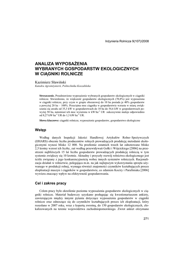 Inżynieria Rolnicza 9(107)/2008 ANALIZA WYPOSAŻENIA WYBRANYCH GOSPODARSTW EKOLOGICZNYCH W CIĄGNIKI ROLNICZE Kazimierz Sławiński Katedra Agroinżynierii, Politechnika Koszalińska Streszczenie. Przedstawiono wyposażenie wybranych gospodarstw ekologicznych w ciągniki rolnicze. Stwierdzono, że większość gospodarstw ekologicznych (70,8%) jest wyposażona w ciągniki rolnicze, przy czym w grupie obszarowej do 10 ha posiada je 40% gospodarstw a powyżej 20 ha – 100%. Przeciętna moc ciągnika w gospodarstwie wzrasta w miarę zwiększania się areału od 35,3 kW w gospodarstwach do 10 ha do 54,6 kW w gospodarstwach powyżej 50 ha, natomiast ich moc wyrażona w kW·ha-1 UR sukcesywnie maleje odpowiednio od 8,27 kW·ha-1 UR do 1,3 kW·ha-1 UR. Słowa kluczowe: ciągniki rolnicze, wyposażenie gospodarstw, gospodarstwo ekologiczne Wstęp Według danych Inspekcji Jakości Handlowej Artykułów Rolno–Spożywczych (IJHARS) obecnie liczba producentów rolnych prowadzących produkcję metodami ekologicznymi wynosi blisko 12 000. Na przełomie ostatnich trzech lat odnotowano blisko 2,5 krotny wzrost ich liczby, zaś według przewidywań Golki i Wójcickiego [2006] na przestrzeni najbliższych 15 lat liczba gospodarstw prowadzących produkcję rolniczą w tym systemie zwiększy się 10 krotnie. Aktualny i przyszły rozwój rolnictwa ekologicznego jest ściśle związany z jego konkurencyjnością wobec innych systemów rolniczych. Racjonalizacja działań w rolnictwie, polegająca m.in. na jak najlepszym wykorzystaniu sprzętu używanego w produkcji rolnej, wymaga również znajomości czynników kształtujących proces eksploatacji maszyn i ciągników w gospodarstwie, co zdaniem Kociry i Parafiniuka [2006] wywiera znaczący wpływ na efektywność gospodarowania. Cel i zakres pracy Celem pracy było określenie poziomu wyposażenia gospodarstw ekologicznych w ciągniki rolnicze. Materiał badawczy uzyskano posługując się kwestionariuszem ankiety, zawierającym między innymi pytania dotyczące wyposażenia gospodarstw w ciągniki rolnicze oraz odnoszące się do czynników kształtujących proces ich eksploatacji, który rozesłano w 2007 roku, wraz z kopertą zwrotną, do 150 gospodarstw ekologicznych, zlokalizowanych na terenie województwa zachodniopomorskiego. Zwrot ankiet otrzymano 271 Kazimierz Sławiński z 96 gospodarstw. Adresy gospodarstw ekologicznych uzyskano w Inspekcji Jakości Handlowej Artykułów Rolno–Spożywczych. Wyniki badań Średnia powierzchnia analizowanych gospodarstw ekologicznych wynosiła 47,9 ha. Były one zatem o blisko 31 ha większe od przeciętnych gospodarstw znajdujących się na terenie województwa zachodniopomorskiego, których średnia powierzchnia wynosi 17 ha. Powierzchnia analizowanych gospodarstw ekologicznych mieściła się w przedziale od 3,31 ha do 221,0 ha. Najwięcej, bo 57% gospodarstw dysponowało areałem przekraczającym 20 ha. Analizowane gospodarstwa na ogół (91%) prowadziły produkcję rolniczą na glebach średnich i słabych (IV, V i VI klasa bonitacyjna). Tylko 8,5% ich areału stanowiły gleby klasy III. Większość z nich (86%) prowadziła zarówno produkcję roślinną i zwierzęcą, wyłącznie roślinną – 10,2%, a zwierzęcą – 3,8%. W największej liczbie gospodarstw (74%), w uprawie dominowały zboża stanowiąc 49% w strukturze zasiewów, kolejne miejsce zajmowały rośliny motylkowate (22%) oraz trwałe użytki zielone (24%). Okopowe stanowiły przeciętnie 5% upraw. W Pozostałych gospodarstwach (26%) znajdowały się wyłącznie trwałe użytki zielone. W produkcji zwierzęcej dominował chów bydła i trzody chlewnej, przy średniej obsadzie sztuki dużej wynoszącej 0,71 SD·ha-1. Jak wynika z przeprowadzonych badań, w ciągniki rolnicze wyposażonych było 68 z 96 analizowanych gospodarstw ekologicznych (70,8%). Poziom wyposażenia w ten środek mechanizacji był uzależniony od wielkości gospodarstwa. O ile jedynie 40% gospodarstw o powierzchni do 10 ha dysponowało własnym ciągnikiem, to w grupie obszarowej przekraczającej 20 ha – 100% (tabela 1). Zdaniem większości respondentów będących właścicielami małych gospodarstw ekologicznych bardziej opłaca się wykonywać zabiegi agrotechniczne w formie usług, niż inwestować we własny park maszynowy. W przeciętnym gospodarstwie ekologicznym średnia liczba ciągników wynosiła 1,6 szt. Była ona jednak zróżnicowana w zależności od powierzchni gospodarstwa. Wzrastała mianowicie w miarę zwiększania ich areału. Gospodarstwa najmniejsze posiadały średnio 1 ciągnik, a prowadzące produkcję rolniczą na areale przekraczającym 50 ha – 1,9 szt. Szczególnie wyraźnie uwidacznia się ta zależność po przeliczeniu ciągników fizycznych na ciągniki przeliczeniowe tj. ciągniki o mocy nominalnej 18,4 kW czyli 25 KM [Zimny 2003]. Gospodarstwa małe dysponowały ciągnikami o przeciętnej mocy nominalnej wynoszącej 35,3 kW, podczas gdy gospodarstwa przekraczające 50 ha – 54,6 kW. Stanowi to odpowiednio 2,40-5,19 ciągników przeliczeniowych. Najwięcej ciągników w przeliczeniu na 100 ha użytków rolnych (UR) było w gospodarstwach najmniejszych - do 10 ha (18,7 szt.), najmniej natomiast (2,3 szt.) w gospodarstwach bardzo dużych, których powierzchnia przekraczała 50 ha. Gospodarstwa najmniejsze cechowały się również najwyższym nasyceniem energetycznym wyrażonym w kW·ha-1 UR. Obserwacje te są zbieżne z badaniami Kociry i Parafiniuka [2006] oraz Szeptyckiego i Wójcickiego [2003], które wskazują na zmniejszanie się nasycenia energetycznego gospodarstw wraz ze wzrostem ich powierzchni. 272 Analiza wyposażenia... Tabela 1. Wyposażenie badanych gospodarstw ekologicznych w ciągniki rolnicze Table 1. Possession of farm tractors in examined ecological farms Powierzchnia gospodarstw [ha] <10 10-20 20-50 50< Wyszczególnienie Odsetek gospodarstw wyposażonych w ciągniki rolnicze (%) Liczba ciągników w gospodarstwi
