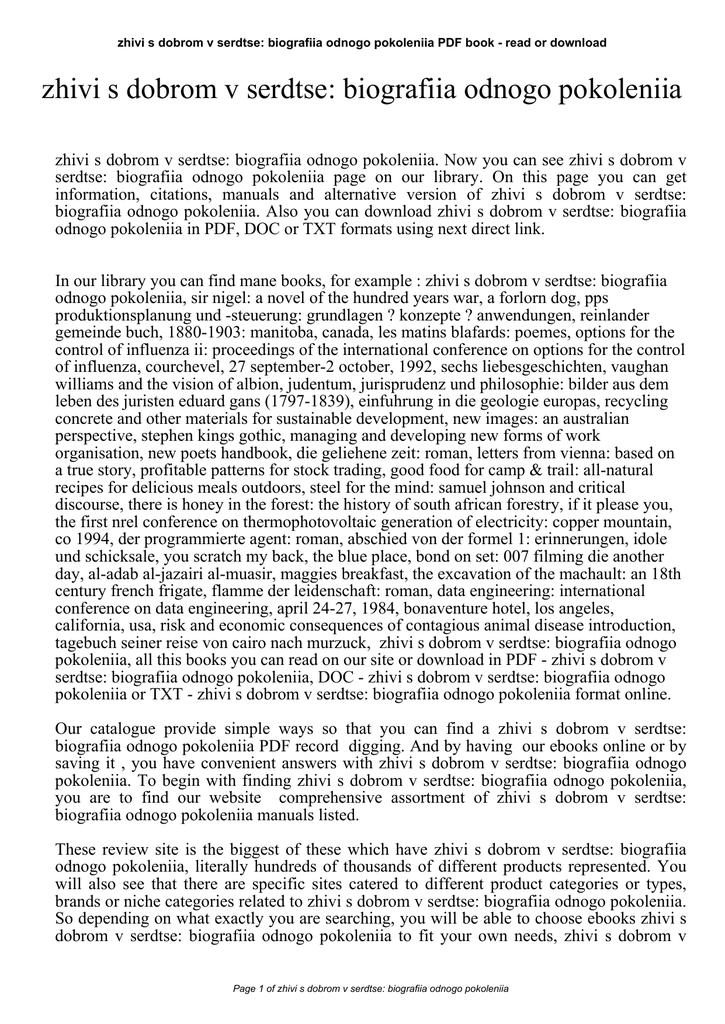 zhivi s dobrom v serdtse: biografiia odnogo pokoleniia PDF book - read or download zhivi s dobrom v serdtse: biografiia odnogo pokoleniia zhivi s dobrom v serdtse: biografiia odnogo pokoleniia. Now you can see zhivi s dobrom v serdtse: biografiia odnogo pokoleniia page on our library. On this page you can get information, citations, manuals and alternative version of zhivi s dobrom v serdtse: biografiia odnogo pokoleniia. Also you can download zhivi s dobrom v serdtse: biografiia odnogo pokoleniia in PDF, DOC or TXT formats using next direct link. In our library you can find mane books, for example : zhivi s dobrom v serdtse: biografiia odnogo pokoleniia, sir nigel: a novel of the hundred years war, a forlorn dog, pps produktionsplanung und -steuerung: grundlagen ? konzepte ? anwendungen, reinlander gemeinde buch, 1880-1903: manitoba, canada, les matins blafards: poemes, options for the control of influenza ii: proceedings of the international conference on options for the control of influenza, courchevel, 27 september-2 october, 1992, sechs liebesgeschichten, vaughan williams and the vision of albion, judentum, jurisprudenz und philosophie: bilder aus dem leben des juristen eduard gans (1797-1839), einfuhrung in die geologie europas, recycling concrete and other materials for sustainable development, new images: an australian perspective, stephen kings gothic, managing and developing new forms of work organisation, new poets handbook, die geliehene zeit: roman, letters from vienna: based on a true story, profitable patterns for stock trading, good food for camp & trail: all-natural recipes for delicious meals outdoors, steel for the mind: samuel johnson and critical discourse, there is honey in the forest: the history of south african forestry, if it please you, the first nrel conference on thermophotovoltaic generation of electricity: copper mountain, co 1994, der programmierte agent: roman, abschied von der formel 1: erinnerungen, idole und schicksale, you scratch my back, the blue place, bond on set: 007 filming die another day, al-adab al-jazairi al-muasir, maggies breakfast, the excavation of the machault: an 18th century french frigate, flamme der leidenschaft: roman, data engineering: international conference on data engineering, april 24-27, 1984, bonaventure hotel, los angeles, california, usa, risk and economic consequences of contagious animal disease introduction, tagebuch seiner reise von cairo nach murzuck, zhivi s dobrom v serdtse: biografiia odnogo pokoleniia, all this books you can read on our site or download in PDF - zhivi s dobrom v serdtse: biografiia odnogo pokoleniia, DOC - zhivi s dobrom v serdtse: biografiia odnogo pokoleniia or TXT - zhivi s dobrom v serdtse: biografiia odnogo pokoleniia format online. Our catalogue provide simple ways so that you can find a zhivi s dobrom v serdtse: biografiia odnogo pokoleniia PDF record digging. And by having our ebooks online or by saving it , you have convenient answers with zhivi s dobrom v serdtse: biografiia odnogo pokoleniia. To begin with finding zhivi s dobrom v serdtse: biografiia odnogo pokoleniia, you are to find our website comprehensive assortment of zhivi s dobrom v serdtse: biografiia odnogo pokoleniia manuals listed. These review site is the biggest of these which have zhivi s dobrom v serdtse: biografiia odnogo pokoleniia, literally hundreds of thousands of different products represented. You will also see that there are specific sites catered to different product categories or types, brands or niche categories related to zhivi s dobrom v serdtse: biografiia odnogo pokoleniia. So depending on what exactly you are searching, you will be able to choose ebooks zhivi s dobrom v serdtse: biografiia odnogo pokoleniia to fit your own needs, zhivi s dobrom v Page 1 of zhivi s dobrom v serdtse: biografiia odnogo pokoleniia zhivi s dobrom v serdtse: biografiia odnogo pokoleniia PDF book - read or download serdtse: biografiia odnogo pokoleniia. Page 2 of zhivi s dobrom v serdtse: biografiia odnogo pokoleniia