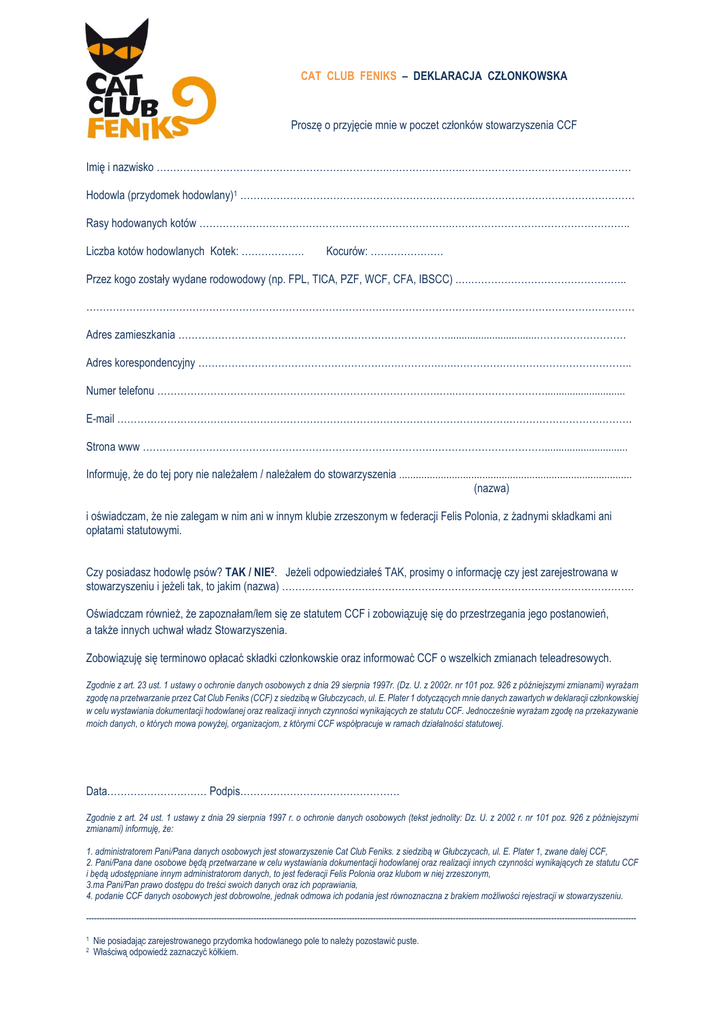CAT CLUB FENIKS – DEKLARACJA CZŁONKOWSKA Proszę o przyjęcie mnie w poczet członków stowarzyszenia CCF Imię i nazwisko …………………………………………………………….………………….…………………………………………… Hodowla (przydomek hodowlany)1 ……………………………………………………………..………………………………………… Rasy hodowanych kotów ………………………………………………………………….…….……………………………………….. Liczba kotów hodowlanych Kotek: ………………. Kocurów: …………………. Przez kogo zostały wydane rodowodowy (np. FPL, TICA, PZF, WCF, CFA, IBSCC) .….……………………………………….. ………………………………………………………………………………………………………………………………………………… Adres zamieszkania ………………………………………………………………………................................……………………… Adres korespondencyjny ……………………………………………………………….….…………….……………………………….. Numer telefonu ………………………………………………………………………….…..………………………............................. E-mail ……………………………………………………………………………………………………….………………………………. Strona www …………………………………………………………………………….…………………………….............................. Informuję, że do tej pory nie należałem / należałem do stowarzyszenia .................................................................................... (nazwa) i oświadczam, że nie zalegam w nim ani w innym klubie zrzeszonym w federacji Felis Polonia, z żadnymi składkami ani opłatami statutowymi. Czy posiadasz hodowlę psów? TAK / NIE2. Jeżeli odpowiedziałeś TAK, prosimy o informację czy jest zarejestrowana w stowarzyszeniu i jeżeli tak, to jakim (nazwa) ……………………………………………………………………………………………. Oświadczam również, że zapoznałam/łem się ze statutem CCF i zobowiązuję się do przestrzegania jego postanowień, a także innych uchwał władz Stowarzyszenia. Zobowiązuję się terminowo opłacać składki członkowskie oraz informować CCF o wszelkich zmianach teleadresowych. Zgodnie z art. 23 ust. 1 ustawy o ochronie danych osobowych z dnia 29 sierpnia 1997r. (Dz. U. z 2002r. nr 101 poz. 926 z późniejszymi zmianami) wyrażam zgodę na przetwarzanie przez Cat Club Feniks (CCF) z siedzibą w Głubczycach, ul. E. Plater 1 dotyczących mnie danych zawartych w deklaracji członkowskiej w celu wystawiania dokumentacji hodowlanej oraz realizacji innych czynności wynikających ze statutu CCF. Jednocześnie wyrażam zgodę na przekazywanie moich danych, o których mowa powyżej, organizacjom, z którymi CCF współpracuje w ramach działalności statutowej. Data………………………… Podpis………………………………………… Zgodnie z art. 24 ust. 1 ustawy z dnia 29 sierpnia 1997 r. o ochronie danych osobowych (tekst jednolity: Dz. U. z 2002 r. nr 101 poz. 926 z późniejszymi zmianami) informuję, że: 1. administratorem Pani/Pana danych osobowych jest stowarzyszenie Cat Club Feniks. z siedzibą w Głubczycach, ul. E. Plater 1, zwane dalej CCF, 2. Pani/Pana dane osobowe będą przetwarzane w celu wystawiania dokumentacji hodowlanej oraz realizacji innych czynności wynikających ze statutu CCF i będą udostępniane innym administratorom danych, to jest federacji Felis Polonia oraz klubom w niej zrzeszonym, 3.ma Pani/Pan prawo dostępu do treści swoich danych oraz ich poprawiania, 4. podanie CCF danych osobowych jest dobrowolne, jednak odmowa ich podania jest równoznaczna z brakiem możliwości rejestracji w stowarzyszeniu. --------------------------------------------------------------------------------------------------------------------------------------------------------------------------------------------------------------1 2 Nie posiadając zarejestrowanego przydomka hodowlanego pole to należy pozostawić puste. Właściwą odpowiedź zaznaczyć kółkiem.