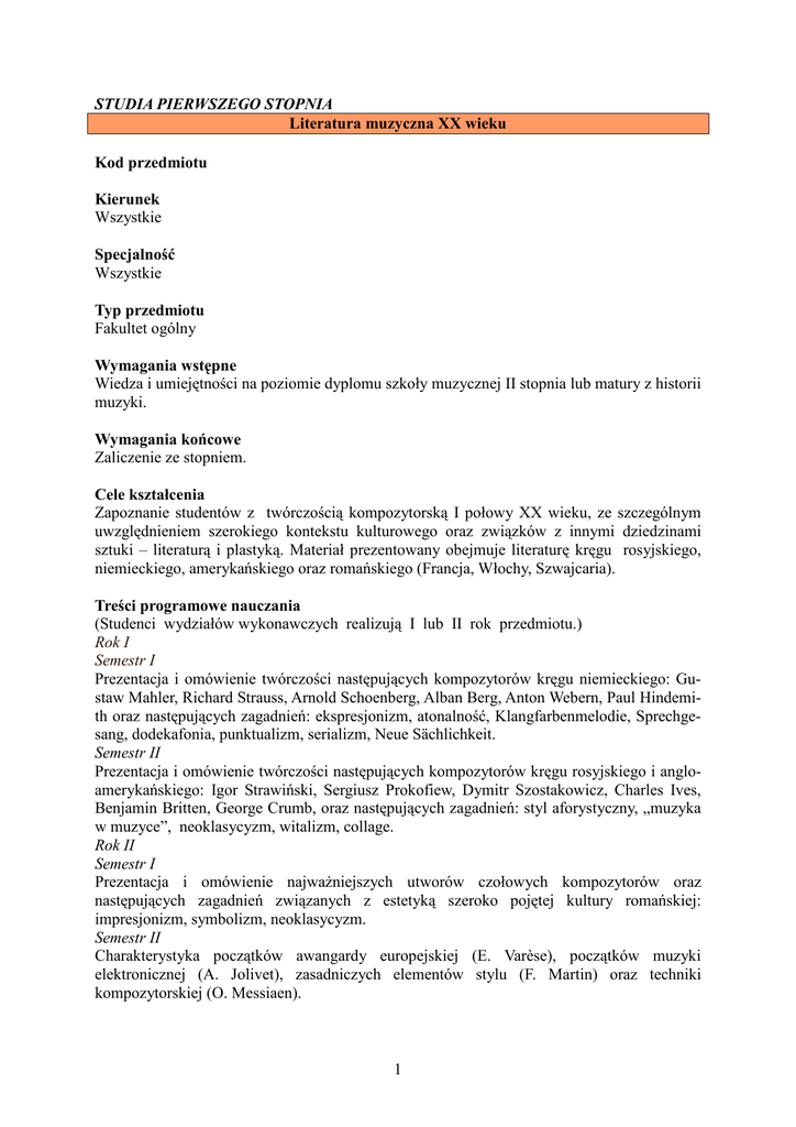 STUDIA PIERWSZEGO STOPNIA Literatura muzyczna XX wieku Kod przedmiotu Kierunek Wszystkie Specjalność Wszystkie Typ przedmiotu Fakultet ogólny Wymagania wstępne Wiedza i umiejętności na poziomie dyplomu szkoły muzycznej II stopnia lub matury z historii muzyki. Wymagania końcowe Zaliczenie ze stopniem. Cele kształcenia Zapoznanie studentów z twórczością kompozytorską I połowy XX wieku, ze szczególnym uwzględnieniem szerokiego kontekstu kulturowego oraz związków z innymi dziedzinami sztuki – literaturą i plastyką. Materiał prezentowany obejmuje literaturę kręgu rosyjskiego, niemieckiego, amerykańskiego oraz romańskiego (Francja, Włochy, Szwajcaria). Treści programowe nauczania (Studenci wydziałów wykonawczych realizują I lub II rok przedmiotu.) Rok I Semestr I Prezentacja i omówienie twórczości następujących kompozytorów kręgu niemieckiego: Gustaw Mahler, Richard Strauss, Arnold Schoenberg, Alban Berg, Anton Webern, Paul Hindemith oraz następujących zagadnień: ekspresjonizm, atonalność, Klangfarbenmelodie, Sprechgesang, dodekafonia, punktualizm, serializm, Neue Sächlichkeit. Semestr II Prezentacja i omówienie twórczości następujących kompozytorów kręgu rosyjskiego i angloamerykańskiego: Igor Strawiński, Sergiusz Prokofiew, Dymitr Szostakowicz, Charles Ives, Benjamin Britten, George Crumb, oraz następujących zagadnień: styl aforystyczny, „muzyka w muzyce”, neoklasycyzm, witalizm, collage. Rok II Semestr I Prezentacja i omówienie najważniejszych utworów czołowych kompozytorów oraz następujących zagadnień związanych z estetyką szeroko pojętej kultury romańskiej: impresjonizm, symbolizm, neoklasycyzm. Semestr II Charakterystyka początków awangardy europejskiej (E. Varèse), początków muzyki elektronicznej (A. Jolivet), zasadniczych elementów stylu (F. Martin) oraz techniki kompozytorskiej (O. Messiaen). 1 Efekty kształcenia (uczenia się) po ukończeniu przedmiotu - w zakresie wiedzy • Student ma ugruntowaną wiedzę na temat gatunków i form muzycznych oraz przemian techniki kompozytorskiej w I połowie XX wieku. • Zna europejską i amerykańską twórczość kompozytorską XX wieku w aspekcie jej związków z innymi dziedzinami sztuki – literaturą i plastyką. • Posiada wiedzę o stylach muzycznych I połowy XX wieku, a także w zakresie biografii najważniejszych kompozytorów oraz stylistyki ich dzieł. - w zakresie umiejętności • Potrafi prawidłowo posługiwać się terminologią z zakresu teorii muzyki oraz historii muzyki XX wieku • Umie słuchowo rozpoznać styl muzyczny lub technikę danego kompozytora, formę, instrumenty. Metody nauczania Wykłady są ilustrowane nagraniami omawianych utworów, poznawanie audytywne (słuchowe) jest uzupełnione oglądem partytury. Metoda jest skoncentrowana na rozwijaniu u studentów umiejętności świadomego słuchania (poznawania) muzyki z jednoczesnym zapamiętywaniem podstawowych struktur tematycznych, formy, kolorystyki, interpretacji wykonawczych itp. Nakład pracy studenta potrzebny do osiągnięcia efektów uczenia się ROK SEMESTR Punkty ECTS Ilość godzin w semestrze Rodzaj zaliczenia LEGENDA Na dowolnym roku 1 2 2 2 30 30 zs zs zal – zaliczony; zs – zaliczenie ze stopniem; egz – egzamin; ed – egzamin dyplomowy Kryteria oceny Podstawą zaliczenia semestrów I-III jest praca pisemna w formie odpowiedzi na zestaw pytań. Studenci, którzy opuszczą zbyt wiele wykładów muszą zdać dodatkowe kolokwium ze znajomości słuchowej utworów (nagrań). Egzamin w formie pisemnej i ustnej. Literatura (piśmiennictwo) Holmes P., Debussy, PWM, Kraków 1999. Jarociński S., Debussy, a impresjonizm i symbolizm, PWM, Kraków 1966. Kaczyński T., Messiaen, PWM, Kraków 1984. Messiaen O., Technika mojego języka muzycznego, „Res Facta” , t. 6, 1972. Meyer K., Oddziaływanie systemu totalitarnego na Prokofiewa, Szostakowicza i Chaczaturiana, w: Muzyka i totalitaryzm, red. M. Jabłoński, J. Tatarska, Ars Nova, Poznań 1996. Olivier Messiaen we wspomnieniach i refleksji badawcze, red. R. D. Golianek, M. Szoka, Akademia Muzyczna, Łódź 2011. 2 Pociej P., Szkice z późnego romantyzmu, PWM, Kraków 1978. Rognoni L., Wiedeńska szkoła muzyczna. Ekspresjonizm i dodekafonia, PWM, Kraków 1978. Szoka M., Język muzyczny Franka Martina, Astra, Łódź 1995. Zieliński T., Style, kierunki i twórcy muzyki XX wieku, COMUK, Warszawa 1980. Ponadto partytury analizowanych utworów. Język wykładowy Polski, możliwość prowadzenia zajęć w języku angielskim. Imię i nazwisko wykładowcy dr hab. Ewa Kowalska-Zając, prof. AM dr kw. II st. Marta Szoka, prof. AM 3