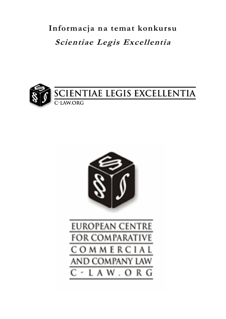 Informacja na temat konkursu Scientiae Legis Excellentia Szczegółowy regulamin Konkursu na najlepsze prace doktorskie i magisterskie z zakresu prawa gospodarczego prywatnego I. ORGANIZATOR........................................................................................................................ 3 II. CEL ORGANIZACJI KONKURSU ........................................................................................ 3 III. PATRONAT NAD KONKURSEM ....................................................................................... 3 IV. PARTNERZY I SPONSORZY............................................................................................... 4 Sponsorzy: ....................................................................................................................................... 4 Partner Wydawniczy:...................................................................................................................... 4 Partnerzy: ........................................................................................................................................ 4 V. CELE I ZAKRES TEMATYCZNY KONKURSU ................................................................. 4 VI. UCZESTNICTWO W KONKURSIE .................................................................................... 5 VII. ZASADY WYŁONIENIA LAUREATÓW ........................................................................... 6 VIII. NAGRODY W KONKURSIE.............................................................................................. 6 IX. PRAWA AUTORSKIE............................................................................................................. 7 X. INNE POSTANOWIENIA...................................................................................................... 7 2 I. ORGANIZATOR European Centre for Comparative Commercial and Company Law (Centrum C-Law.org) Misją Centrum C-Law.org jest przyczynianie się do poprawy ustawodawstwa i stosowania prawa gospodarczego, zwłaszcza prawa spółek oraz promowania przedsiębiorczości oraz dobrych praktyk korporacyjnych w Europie, ze szczególnym uwzględnieniem nowych państw członkowskich Unii Europejskiej oraz krajów stowarzyszonych. Centrum C-Law.org zmierza do realizacji swoich celów miedzy innymi poprzez niezależną działalność badawczą, wymianę akademicką, interdyscyplinarny dialog oraz inne działania związane z celem organizacji. Więcej informacji o Organizatorze: www.c-law.org II. CEL ORGANIZACJI KONKURSU Konkurs ma za zadanie popularyzację wśród młodych teoretyków i praktyków prawa w Polsce zainteresowania zagadnieniami mieszczącymi się w zakresie realizowanych przez Centrum C-law.org zadań. W perspektywie planowane jest rozszerzenie konkursu na inne kraje (konkursy na najlepsze prace LLM napisane na zagranicznych uczelniach: Niemcy, Belgia & Holandia). Konkurs jest również związany z upowszechnieniem znaku jakości „Scientiae Legis Excellentia”, promującego kompetencję i doskonałość w piśmiennictwie prawniczym. Znakiem tym sygnowane są publikacje cechujące się nowatorstwem naukowym albo szczególną wartością użytkową (praktyczną), które ze względu na wymienione właściwości zasługują na szczególną uwagę. III. PATRONAT NAD KONKURSEM Narodowy Bank Polski 3 IV. PARTNERZY i SPONSORZY Sponsorzy: Kubas, Kos, Gaertner – Adwokaci spółka partnerska Partner Wydawniczy: Wydawnictwo C.H.Beck Partnerzy: Narodowy Bank Polski Europejskie Stowarzyszenie Studentów Prawa ELSA Poland V. CELE I ZAKRES TEMATYCZNY KONKURSU Celem Konkursu jest wyłonienie najlepszej pracy w oraz przyznanie nagród i wyróżnień najlepszym pracom w następujących kategoriach: • prace doktorskie( 5.000 zł.) • prace magisterskie(3.000 zł.) Do konkursu mogą być zgłaszane prace poświecone tematyce prawa gospodarczego (w szczególności prawa spółek, prawa rynku kapitałowego, prawa bankowego, prawa upadłościowego i prawa umów gospodarczych) napisane z wykorzystaniem ekonomicznej analizy prawa i badań empirycznych. Dodatkowo brane będą pod uwagę: wykorzystanie metody komparatystycznej oraz uwzględnienie aspektów europejskoprawnych i międzynarodowych. 4 VI. UCZESTNICTWO W KONKURSIE 1. Konkurs skierowany jest do autorów prac doktorskich i magisterskich, obronionych na wydziałach prawa, wydziałach nauk ekonomicznych lub wydziałach zarządzania uczelni wyższych na terenie Rzeczypospolitej Polskiej. Obrona pracy powinna nastąpić w roku akademickim, dla którego ogłaszany jest konkurs. 2. W konkursie mogą uczestniczyć wyłącznie prace dotychczas nie opublikowane. 3. Warunkiem uczestnictwa w Konkursie jest złożenie/przesłanie do dnia 30 listopada danego roku w Sekretariacie Jury Konkursu następujących dokumentów: • pracy doktorskiej/ magisterskiej wraz z opinią oraz kompletem recenzji • streszczenia pracy w języku angielskim, przedstawiającego temat pracy, uzasadnienie jego wyboru oraz (przede wszystkim) główne tezy pracy (1-2 strony) • zaświadczenia wydanego przez władze uczelni, potwierdzającego, że obrona pracy doktorskiej/magisterskiej, odbyły się w roku dla którego ogłaszany jest konkurs (wystarczy kopia dyplomu lub wpisu w indeksie, jeśli wynika z niej data obrony) • wniosek zgłoszenia na konkurs, pobrany ze strony internetowej (www.c-law.org) zawierający: - dane osobowe uczestnika konkursu, - adres do korespondencji, - tytuł pracy doktorskiej/ magisterskiej, - nazwisko promotora pracy, - zgodę na przetwarzanie i publikację danych osobowych w brzmieniu: „Wyrażam zgodę na podawanie do wiadomości publicznej mojego imienia i nazwiska w związku z moim udziałem Konkursie SLE we wszelkich informacjach, ogłoszeniach, zapowiedziach i informacjach o Konkursie i jego wynikach. W szczególności wyrażam zgodę na przetwarzanie przez organizatora Konkursu danych osobowych umieszczonych we wniosku, w zakresie prowadzenia i realizac