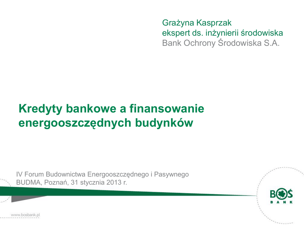Grażyna Kasprzak ekspert ds. inżynierii środowiska Bank Ochrony Środowiska S.A. Kredyty bankowe a finansowanie energooszczędnych budynków IV Forum Budownictwa Energooszczędnego i Pasywnego BUDMA, Poznań, 31 stycznia 2013 r. Instrumenty bankowe Kredyty dedykowane Kredyty preferencyjne w ramach systemów wsparcia – System finansowania ochrony środowiska – System wspierania termomodernizacji Kredyty we współpracy z zagranicznymi instytucjami finansowymi Kredyty komercyjne „specjalizowane” 2 Kredyty bankowe – modele preferencji Preferencje po stronie cenowej – oprocentowanie kredytów obniżone w stosunku do warunków standardowych Kredyty we współpracy z WFOŚiGW Preferencje po stronie nakładów na inwestycję – dotacja, premia Kredyty we współpracy z NFOŚiGW, WFOŚiGW Kredyt Termoulga Preferencje po stronie konstrukcji finansowania: -obniżona marża i/lub prowizja w stosunku do standardowej oferty Banku -obniżony wymagany wkład własny -wydłużony okres karencji w spłacie kapitału -„samospłata” kredytu Kredyty we współpracy z NFOŚiGW, WFOŚiGW Kredyty we współpracy z zagranicznymi instytucjami finansowymi Kredyt EnergoOszczędny 3 Kierunki finansowania eko-budownictwa Modernizacja Budowa Eliminacja niskiej emisji Termomodernizacja Odnawialne źródła energii Wymiana materiałów i urządzeń na przyjazne środowisku Odnawialne źródła energii Budynki energooszczędne i pasywne 4 Słoneczny EKOkredyt – dopłaty NFOŚiGW Kredyt z dopłatą NFOŚiGW w ramach Programu priorytetowego pt. „Program dla przedsięwzięć w zakresie odnawialnych źródeł energii i obiektów wysokosprawnej kogeneracji” (część 3) – Dopłaty na częściowe spłaty kapitału kredytów bankowych przeznaczonych na zakup i montaż kolektorów słonecznych dla osób fizycznych i wspólnot mieszkaniowych. Adresaci kredytu: osoby fizyczne posiadające prawo do dysponowania budynkiem mieszkalnym lub budynkiem mieszkalnym w budowie, wspólnoty mieszkaniowe instalujące kolektory słoneczne na własnych budynkach wielolokalowych, którym to budynkom mają służyć instalowane kolektory z wyłączeniem odbiorców ciepła z miejskiej sieci cieplnej do podgrzewania wody użytkowej Wysokość dopłaty: 45% kosztów kwalifikowanych 5 Domy energooszczędne – dopłaty NFOŚiGW Dla osób fizycznych, na budowę lub zakup domu jednorodzinnego lub mieszkania Dotacja na częściową spłatę kapitału kredytu bankowego, wypłacana na konto kredytowe beneficjenta po zakończeniu realizacji przedsięwzięcia i potwierdzeniu uzyskania wymaganego standardu energetycznego przez budynek Wyznacznik energooszczędności – wskaźnik rocznego jednostkowego zapotrzebowania na energię użytkową do celów ogrzewania i wentylacji (EUco) Wysokość dofinansowania wynosi: w przypadku domów jednorodzinnych: – standard NF40 – EUco 40 kWh/(m2*rok) – dotacja 30 000 zł brutto; – standard NF15 – EUco 15 kWh/(m2*rok) – dotacja 50 000 zł brutto; w przypadku lokali mieszkalnych w budynkach wielorodzinnych: – standard NF40 – EUco 40 kWh/(m2*rok) – dotacja 11 000 zł brutto; – standard NF15 – EUco 15 kWh/(m2*rok) – dotacja 16 000 zł brutto. Budżet programu wynosi 300 mln zł. Środki pozwolą na realizację ok. 12 tys. domów jednorodzinnych i mieszkań w budynkach wielorodzinnych. Wdrożenie programu przewidziane jest na lata 2013–2018, a wydatkowanie środków – do 31.12.2022 r. 6 Kredyty preferencyjne we współpracy z WFOŚiGW Realizacja priorytetów regionalnych Kredyty ze środków WFOŚiGW Kredyty ze środków banku z dopłatami WFOŚiGW do oprocentowania lub do kapitału warunki kredytowania zróżnicowane w poszczególnych województwach, ustalane indywidualnie przez każdy WFOŚiGW przedmiot finansowania (lista zadań priorytetowych) podmiot uprawniony do ubiegania się o finansowanie wysokość kredytu okres realizacji inwestycji oprocentowanie okres spłaty i okres karencji -7 WFOŚiGW woj. śląskiego – Linia kredytowa „Dom energooszczędny” Przedmiot kredytowania - budowa obiektów energooszczędnych w zakresie obejmującym zakup i montaż: urządzeń niekonwencjonalnych źródeł ciepła (pompy ciepła, kolektory słoneczne), układów wentylacji mechanicznej z odzyskiem ciepła (przy min. odzysku ciepła 75%), systemu wymiennika gruntowego, instalacji ogrzewania, materiałów izolacyjnych ścian, stropów, dachów, posadzek, stolarki okiennej i drzwiowej. Obiekt energooszczędny – obiekt, dla którego wskaźnik zapotrzebowania na energię końcową (z wyłączeniem energii na przygotowanie c.w.u.) będzie niższy od 50 kWh/(m2 rok) Kredyty przeznaczone są dla osób fizycznych, w tym prowadzących działalność gospodarczą. -8 Ekologiczny kredyt hipoteczny Wysokość marży maleje wraz z poprawą efektywności wykorzystania energii w budynku (lokalu) Budynek pasywny < 15 kWh/(m2 rok) Budynek niskoenergochłonny < 70 kWh/(m2 rok) OZE 9 http:/www.bosbank.pl Grażyna Kasprzak Ekspert ds. Inżynierii Środowiska Departament Ekologii i Strategii Bank Ochrony Środowiska S.A. tel. (22) 850-88-59, kom. 515-111-141 [email protected]