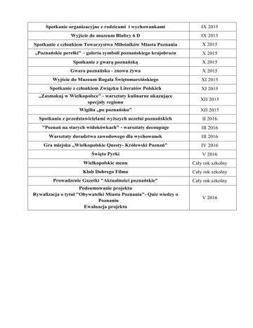 Spotkanie organizacyjne z rodzicami i wychowankami IX 2015 Wyjście do muzeum Blubry 6 D IX 2015 Spotkanie z członkiem Towarzystwa Miłośników Miasta Poznania X 2015 „Poznańskie perełki” – galeria symboli poznańskiego krajobrazu X 2015 Spotkanie z gwarą poznańską X 2015 Gwara poznańska - znowu żywa X 2015 Wyjście do Muzeum Rogala Świętomarcińskiego XI 2015 Spotkanie z członkiem Związku Literatów Polskich XI 2015 „Zasmakuj w Wielkopolsce” - warsztaty kulinarne ukazujące specjały regionu XII 2015 Wigilia „po poznańsku” XII 2015 Spotkania z przedstawicielami wyższych uczelni poznańskich II 2016 "Poznań na starych widokówkach" - warsztaty decoupage III 2016 Warsztaty doradztwa zawodowego dla wychowanek III 2016 Gra miejska „Wielkopolskie Questy- Królewski Poznań” IV 2016 Święto Pyrki V 2016 Wielkopolskie menu Cały rok szkolny Klub Dobrego Filmu Cały rok szkolny Prowadzenie Gazetki "Aktualności poznańskie" Cały rok szkolny Podsumowanie projektu Rywalizacja o tytuł "Obywatelki Miasta Poznania"- Quiz wiedzy o Poznaniu Ewaluacja projektu V 2016