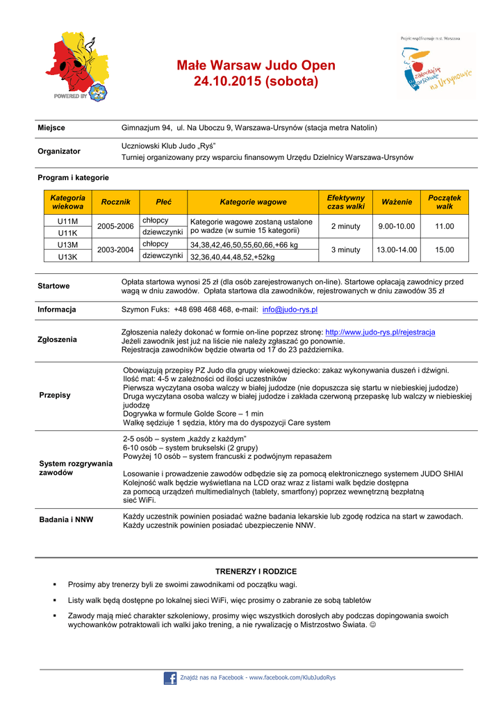 Małe Warsaw Judo Open 24.10.2015 (sobota) Miejsce Gimnazjum 94, ul. Na Uboczu 9, Warszawa-Ursynów (stacja metra Natolin) Organizator Uczniowski Klub Judo „Ryś” Turniej organizowany przy wsparciu finansowym Urzędu Dzielnicy Warszawa-Ursynów Program i kategorie Kategoria wiekowa U11M U11K U13M U13K Rocznik 2005-2006 2003-2004 Płeć Kategorie wagowe chłopcy Kategorie wagowe zostaną ustalone dziewczynki po wadze (w sumie 15 kategorii) chłopcy 34,38,42,46,50,55,60,66,+66 kg dziewczynki 32,36,40,44,48,52,+52kg Efektywny czas walki Ważenie Początek walk 2 minuty 9.00-10.00 11.00 3 minuty 13.00-14.00 15.00 Startowe Opłata startowa wynosi 25 zł (dla osób zarejestrowanych on-line). Startowe opłacają zawodnicy przed wagą w dniu zawodów. Opłata startowa dla zawodników, rejestrowanych w dniu zawodów 35 zł Informacja Szymon Fuks: +48 698 468 468, e-mail: [email protected] Zgłoszenia Zgłoszenia należy dokonać w formie on-line poprzez stronę: http://www.judo-rys.pl/rejestracja Jeżeli zawodnik jest już na liście nie należy zgłaszać go ponownie. Rejestracja zawodników będzie otwarta od 17 do 23 października. Przepisy Obowiązują przepisy PZ Judo dla grupy wiekowej dziecko: zakaz wykonywania duszeń i dźwigni. Ilość mat: 4-5 w zależności od ilości uczestników Pierwsza wyczytana osoba walczy w białej judodze (nie dopuszcza się startu w niebieskiej judodze) Druga wyczytana osoba walczy w białej judodze i zakłada czerwoną przepaskę lub walczy w niebieskiej judodzę Dogrywka w formule Golde Score – 1 min Walkę sędziuje 1 sędzia, który ma do dyspozycji Care system System rozgrywania zawodów Badania i NNW 2-5 osób – system „każdy z każdym” 6-10 osób – system brukselski (2 grupy) Powyżej 10 osób – system francuski z podwójnym repasażem Losowanie i prowadzenie zawodów odbędzie się za pomocą elektronicznego systemem JUDO SHIAI Kolejność walk będzie wyświetlana na LCD oraz wraz z listami walk będzie dostępna za pomocą urządzeń multimedialnych (tablety, smartfony) poprzez wewnętrzną bezpłatną sieć WiFi. Każdy uczestnik powinien posiadać ważne badania lekarskie lub zgodę rodzica na start w zawodach. Każdy uczestnik powinien posiadać ubezpieczenie NNW. TRENERZY I RODZICE Prosimy aby trenerzy byli ze swoimi zawodnikami od początku wagi. Listy walk będą dostępne po lokalnej sieci WiFi, więc prosimy o zabranie ze sobą tabletów Zawody mają mieć charakter szkoleniowy, prosimy więc wszystkich dorosłych aby podczas dopingowania swoich wychowanków potraktowali ich walki jako trening, a nie rywalizację o Mistrzostwo Świata. Znajdź nas na Facebook - www.facebook.com/KlubJudoRys