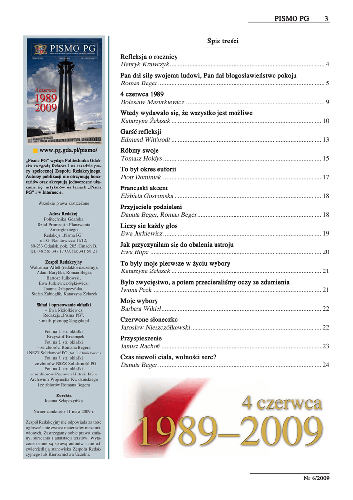 PISMO PG 3 Spis treści Refleksja o rocznicy Henryk Krawczyk............................................................................................... 4 Pan dał siłę swojemu ludowi, Pan dał błogosławieństwo pokoju Roman Beger ...................................................................................................... 5 4 czerwca 1989 Bolesław Mazurkiewicz ..................................................................................... 9 Wtedy wydawało się, że wszystko jest możliwe Katarzyna Żelazek ............................................................................................ 10 Garść refleksji Edmund Wittbrodt ............................................................................................ 13 www.pg.gda.pl/pismo/ „Pismo PG” wydaje Politechnika Gdań− ska za zgodą Rektora i na zasadzie pra− cy społecznej Zespołu Redakcyjnego. Autorzy publikacji nie otrzymują hono− rariów oraz akceptują jednoczesne uka− zanie się artykułów na łamach „Pisma PG” i w Internecie. Wszelkie prawa zastrzeżone Adres Redakcji Politechnika Gdańska Dział Promocji i Planowania Strategicznego Redakcja „Pisma PG” ul. G. Narutowicza 11/12, 80−233 Gdańsk, pok. 205, Gmach B, tel. (48 58) 347 17 09, fax 341 58 21 Zespół Redakcyjny Waldemar Affelt (redaktor naczelny), Adam Barylski, Roman Beger, Bartosz Julkowski, Ewa Jurkiewicz−Sękiewicz, Joanna Szłapczyńska, Stefan Zabieglik, Katarzyna Żelazek Skład i opracowanie okładki – Ewa Niziołkiewicz Redakcja „Pisma PG”, e−mail: [email protected] Fot. na 1. str. okładki – Krzysztof Krzempek Fot. na 2. str. okładki – ze zbiorów Romana Begera i NSZZ Solidarność PG (fot. T. Chmielowiec) Fot. na 3. str. okładki – ze zbiorów NSZZ Solidarność PG Fot. na 4. str. okładki – ze zbiorów Pracowni Historii PG – Archiwum Wojciecha Kwidzińskiego i ze zbiorów Romana Begera Róbmy swoje Tomasz Hołdys ................................................................................................. 15 To był okres euforii Piotr Dominiak ................................................................................................. 17 Francuski akcent Elżbieta Gostomska .......................................................................................... 18 Przyjaciele podzieleni Danuta Beger, Roman Beger ............................................................................ 18 Liczy sie każdy głos Ewa Jurkiewicz ................................................................................................. 19 Jak przyczyniłam się do obalenia ustroju Ewa Hope ......................................................................................................... 20 To były moje pierwsze w życiu wybory Katarzyna Żelazek ............................................................................................ 21 Było zwycięstwo, a potem przecieraliśmy oczy ze zdumienia Iwona Peek ....................................................................................................... 21 Moje wybory Barbara Wikieł .................................................................................................. 22 Czerwone słoneczko Jarosław Nieszczółkowski ................................................................................ 22 Przyspieszenie Janusz Rachoń .................................................................................................. 23 Czas niewoli ciała, wolności serc? Danuta Beger .................................................................................................... 24 Korekta Joanna Szłapczyńska Numer zamknięto 11 maja 2009 r. Zespół Redakcyjny nie odpowiada za treść ogłoszeń i nie zwraca materiałów niezamó− wionych. Zastrzegamy sobie prawo zmia− ny, skracania i adiustacji tekstów. Wyra− żone opinie są sprawą autorów i nie od− zwierciedlają stanowiska Zespołu Redak− cyjnego lub Kierownictwa Uczelni. Nr 6/2009