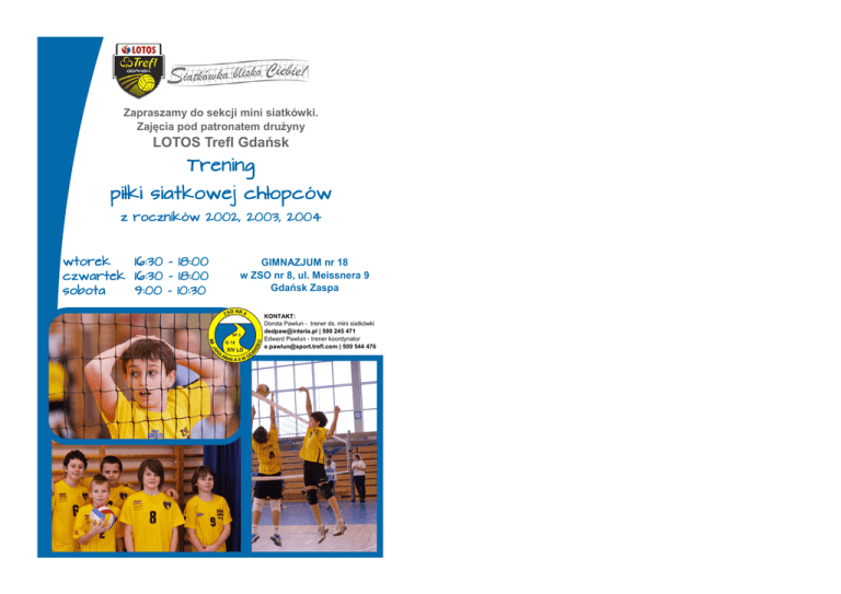 Zapraszamy do sekcji mini siatkówki. Zajęcia pod patronatem drużyny LOTOS Trefl Gdańsk Trening piłki siatkowej chłopców z roczników 2002, 2003, 2004 wtorek 16:30 - 18:00 czwartek 16:30 - 18:00 sobota 9:00 - 10:30 GIMNAZJUM nr 18 w ZSO nr 8, ul. Meissnera 9 Gdańsk Zaspa KONTAKT: Dorota Pawlun - trener ds. mini siatkówki [email protected] | 500 245 471 Edward Pawlun - trener koordynator [email protected] | 509 544 476
